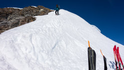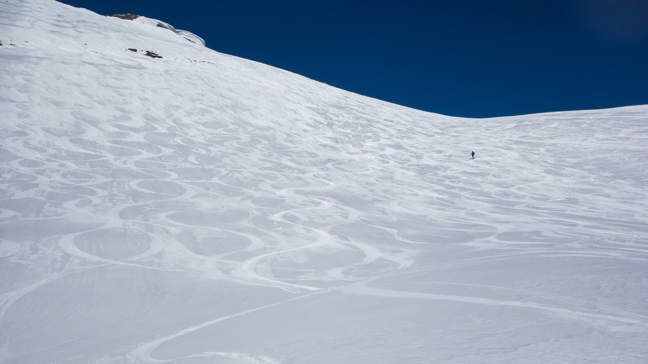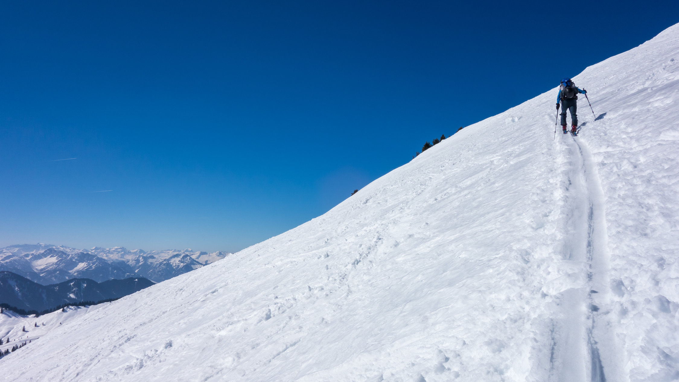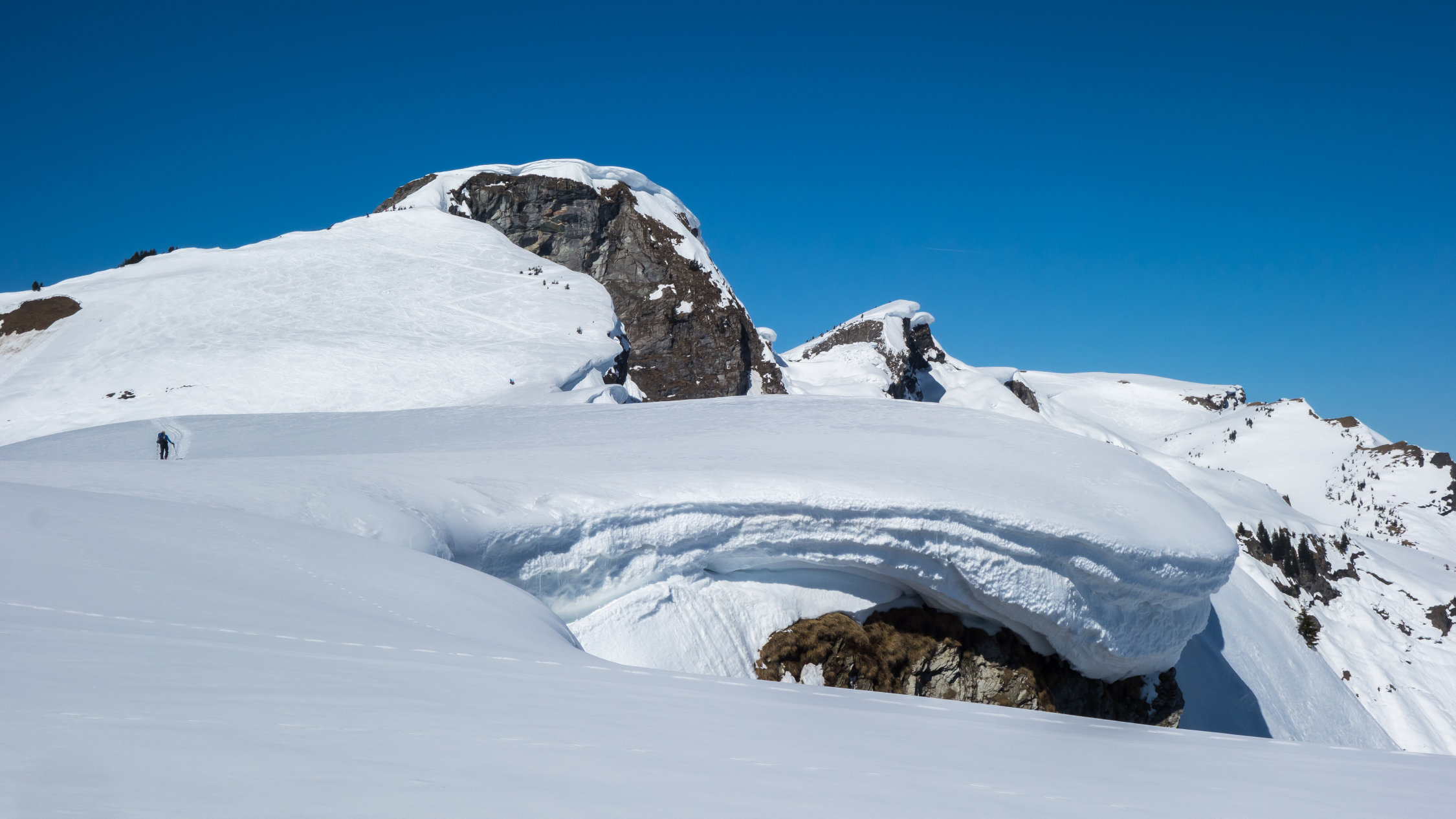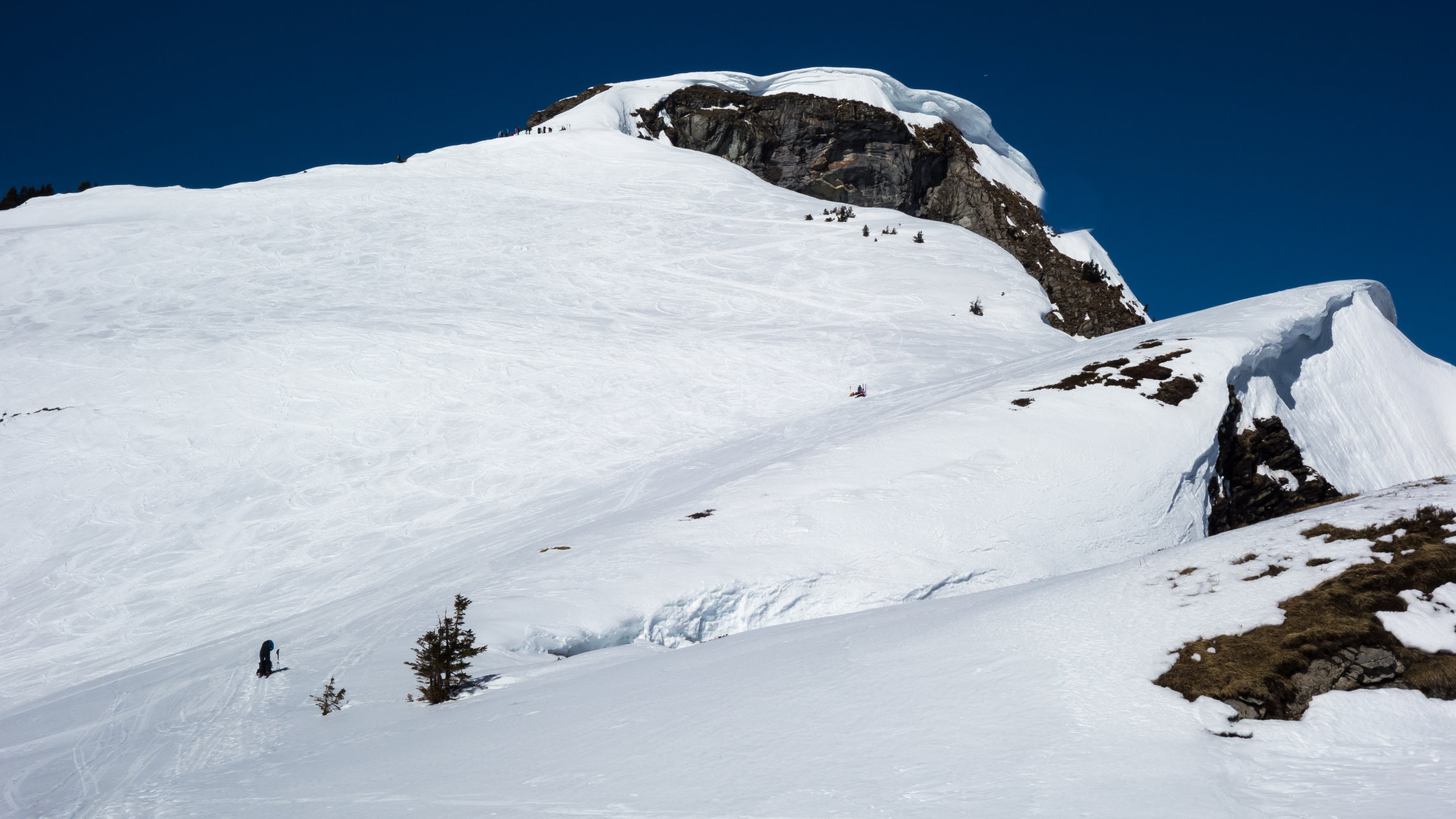 An extrem steilen Südhängen sind ein paar Rutsche bis aufs Gras niedergegangen. Aber die Tourenroute ist momentan sowohl beim Aufstieg wie auf der Abfahrt völlig gefahrlos.