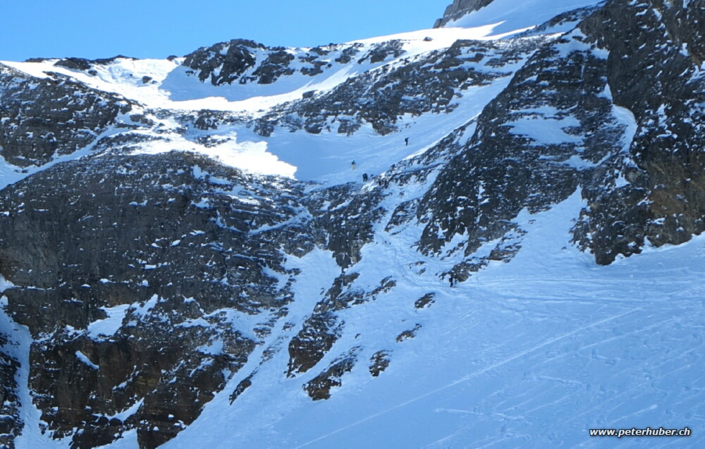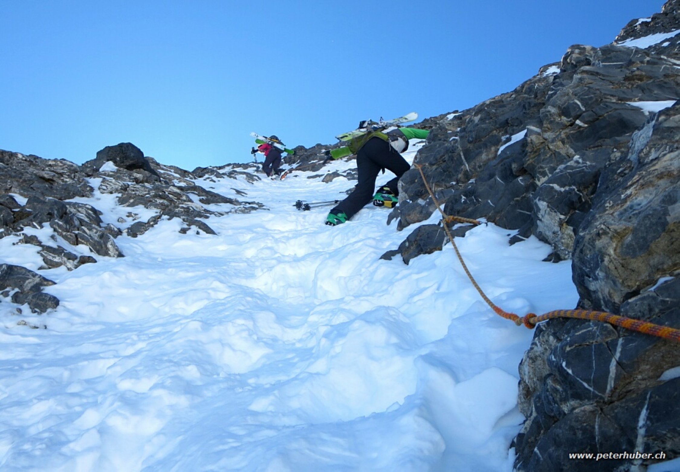 Traumhaft schön, windstill. Im Aufstieg zur Bannalper Schönegg hart, vor dem Sattel knapp Schnee. Von da an reichlich Schnee. Die Steilstufe hat gute Tritte. Das Seil liegt frei.