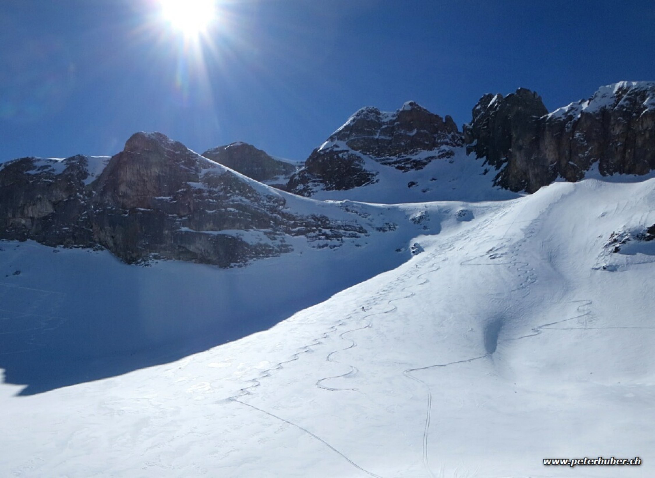 Auf der Abfahrt verschiedene Schneearten - tragend, Pulver, Winddecken, Bruchharsch und ganz unten sulzig feucht. Vorwiegend gut zu fahren.