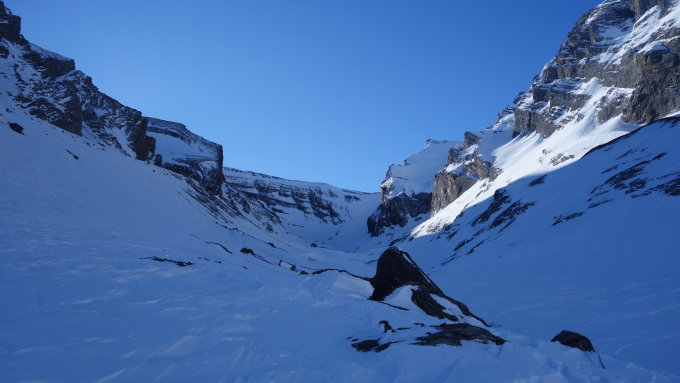 Gute Spur bis auf den Zackengrat. Über den Zackengrat bis 3400 müssen nur einmal kurz die Skier getragen werden. Zurzeit ohne Steigeisen möglich. Harscheisen sind aber sehr empfehlenswert. Wird von 3400 bis auf den Vorgipfel eher rechtshaltend gelaufen, kann mit den Skis hochgestiegen werden. Abfahrt ab Vorgipfel durch die Westflanke rechtshaltend an den aperen Stellen vorbei. Kein besonderer Genuss zur Zeit.
