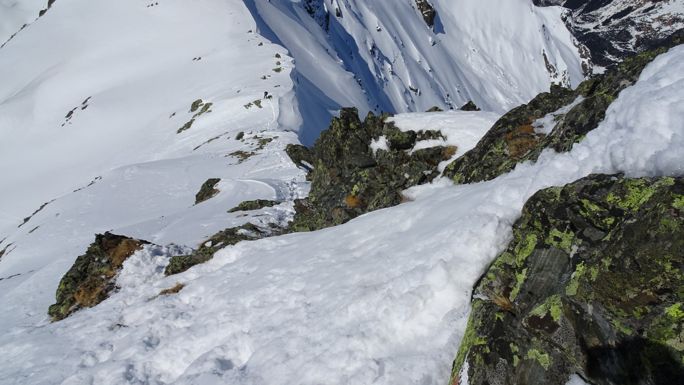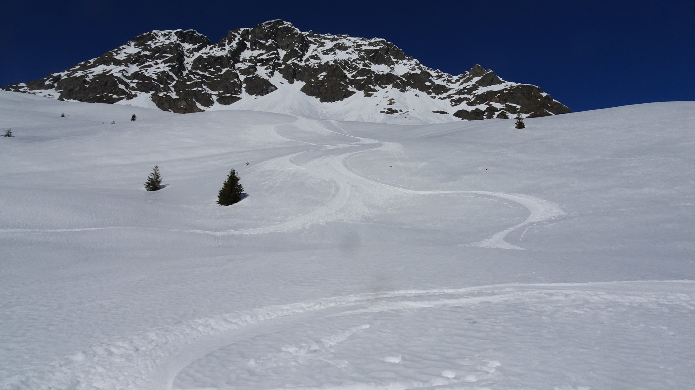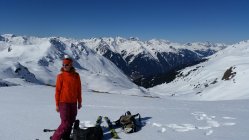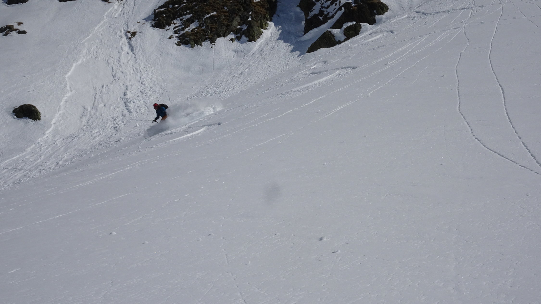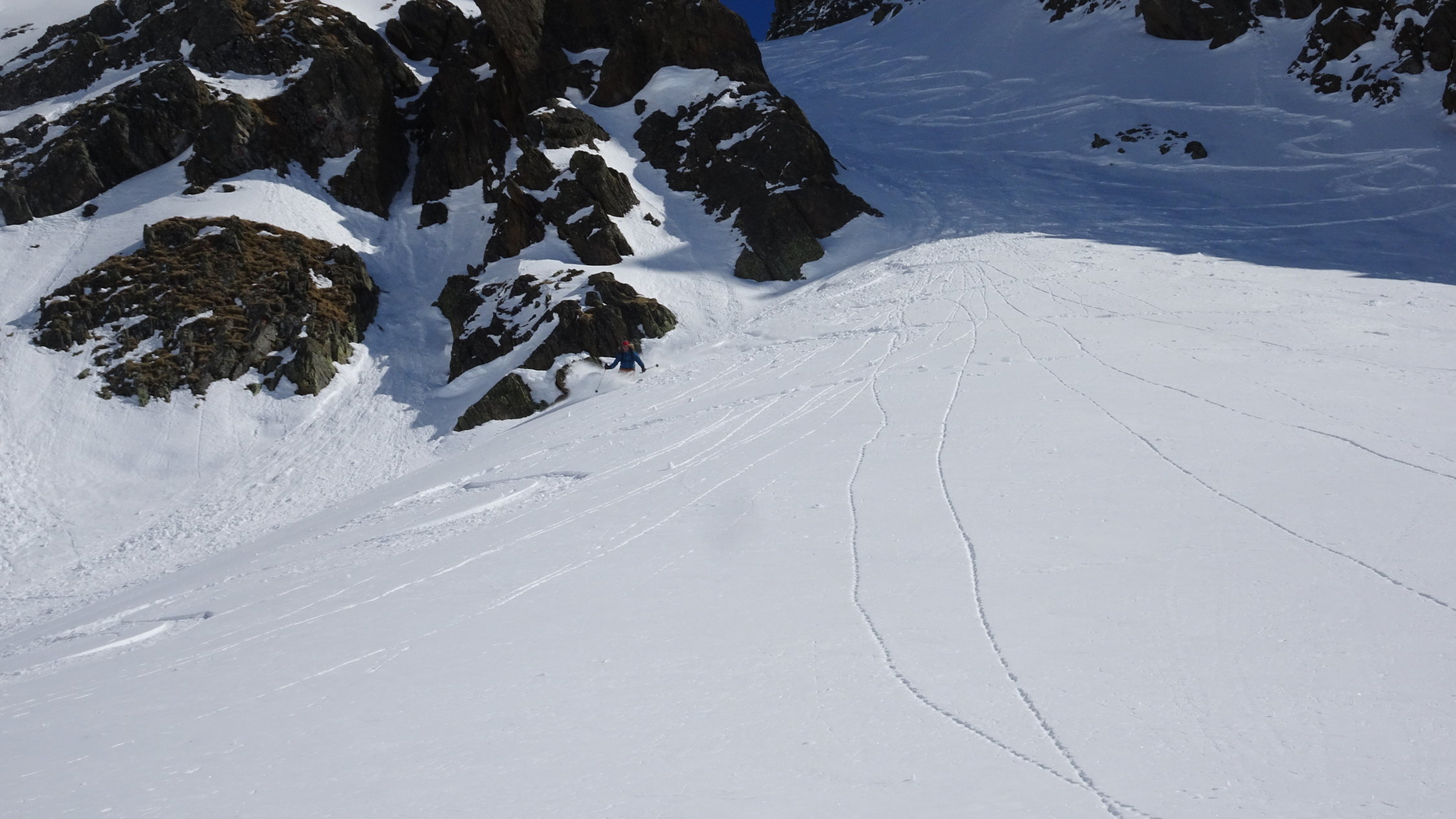 Ab Parkplatz ca. 10 Minuten Ski tragen, dann gute Aufstiegsbedingungen. Bei angenehmen Temperaturen den Südhang hinauf. Ab einer Höhe von ca. 2250 Meter auf die Nordseite gewechselt. Hier teilweise noch Pulver angetroffen. Ab Skidepot noch ca. 100HM zum Gipfel teilweise in Schnee teilweise etwas Felsen. Abfahrt die ersten 400 HM noch den Pulver in der Steilrinne, siehe Foto. Dann auf der Südseite fortgeschrittener Firn. 1 Person war heute noch kurz vor uns unterwegs. Strahlend blauer Himmel und super angenehme Temperaturen. Ca. 100HM nach dem Skidepot noch einen super Pulverhang abgefahren. Südseitig feiner Firn.