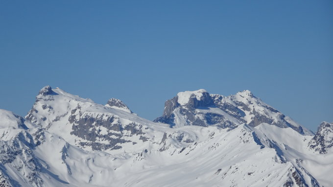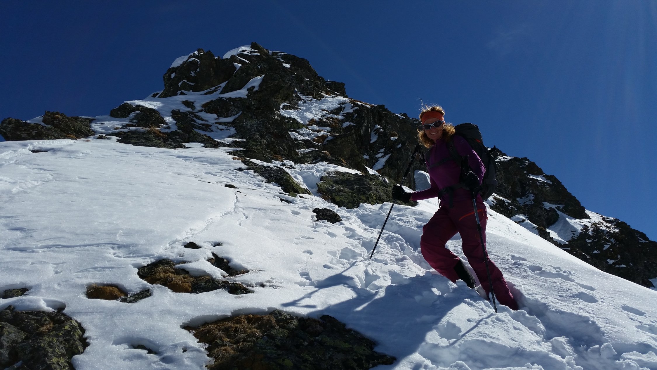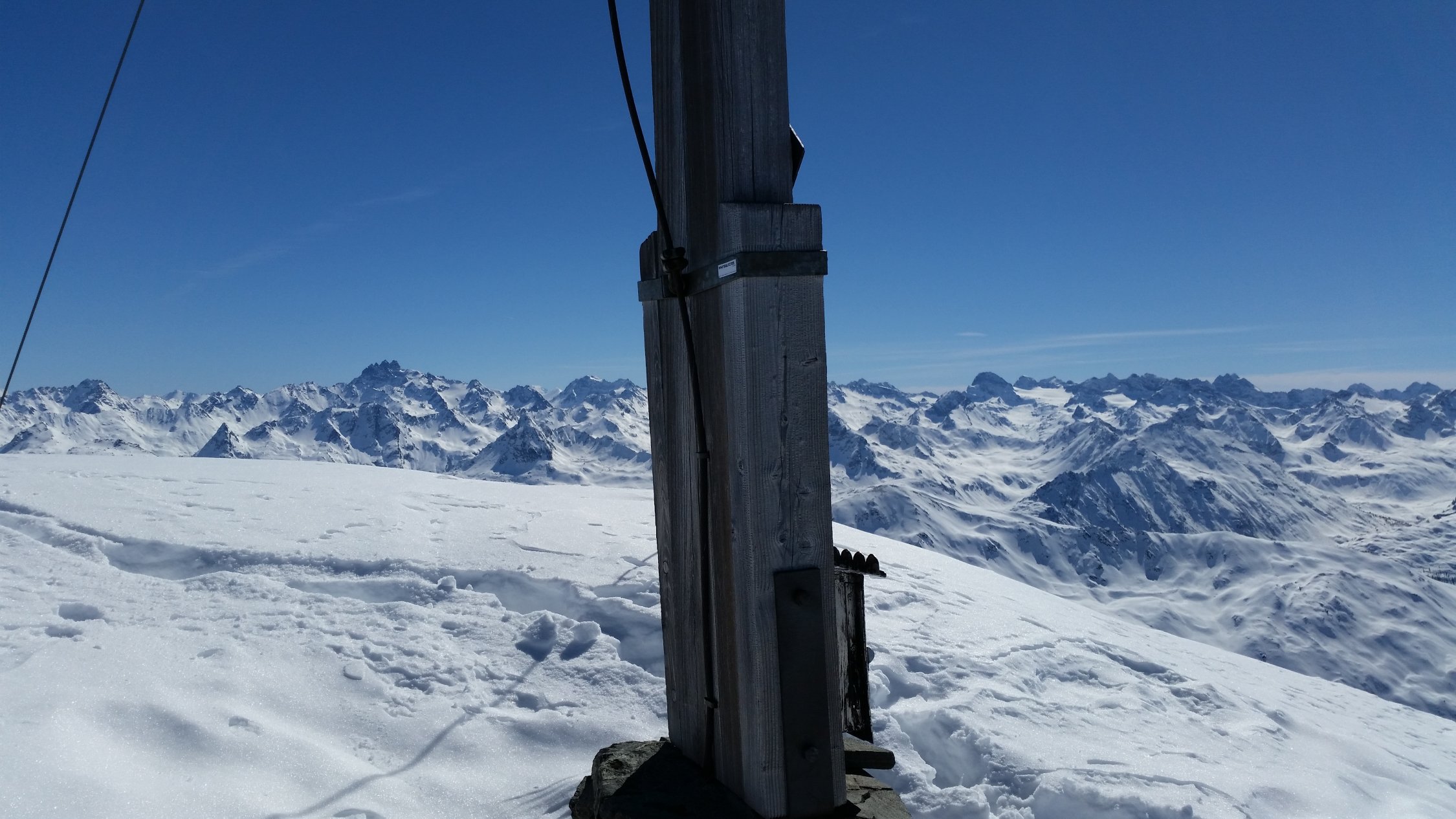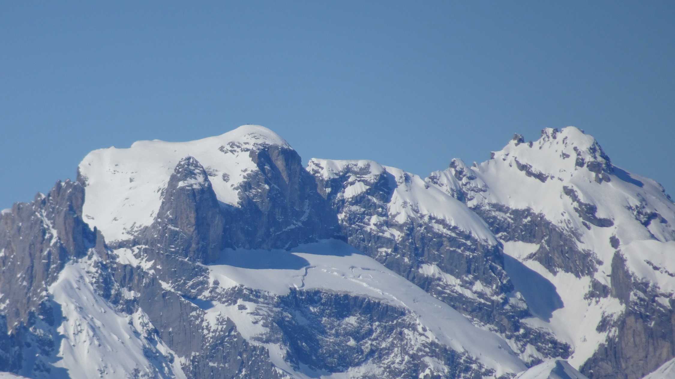 Ab Parkplatz ca. 10 Minuten Ski tragen, dann gute Aufstiegsbedingungen. Bei angenehmen Temperaturen den Südhang hinauf. Ab einer Höhe von ca. 2250 Meter auf die Nordseite gewechselt. Hier teilweise noch Pulver angetroffen. Ab Skidepot noch ca. 100HM zum Gipfel teilweise in Schnee teilweise etwas Felsen. Abfahrt die ersten 400 HM noch den Pulver in der Steilrinne, siehe Foto. Dann auf der Südseite fortgeschrittener Firn. 1 Person war heute noch kurz vor uns unterwegs. Strahlend blauer Himmel und super angenehme Temperaturen. Ca. 100HM nach dem Skidepot noch einen super Pulverhang abgefahren. Südseitig feiner Firn.