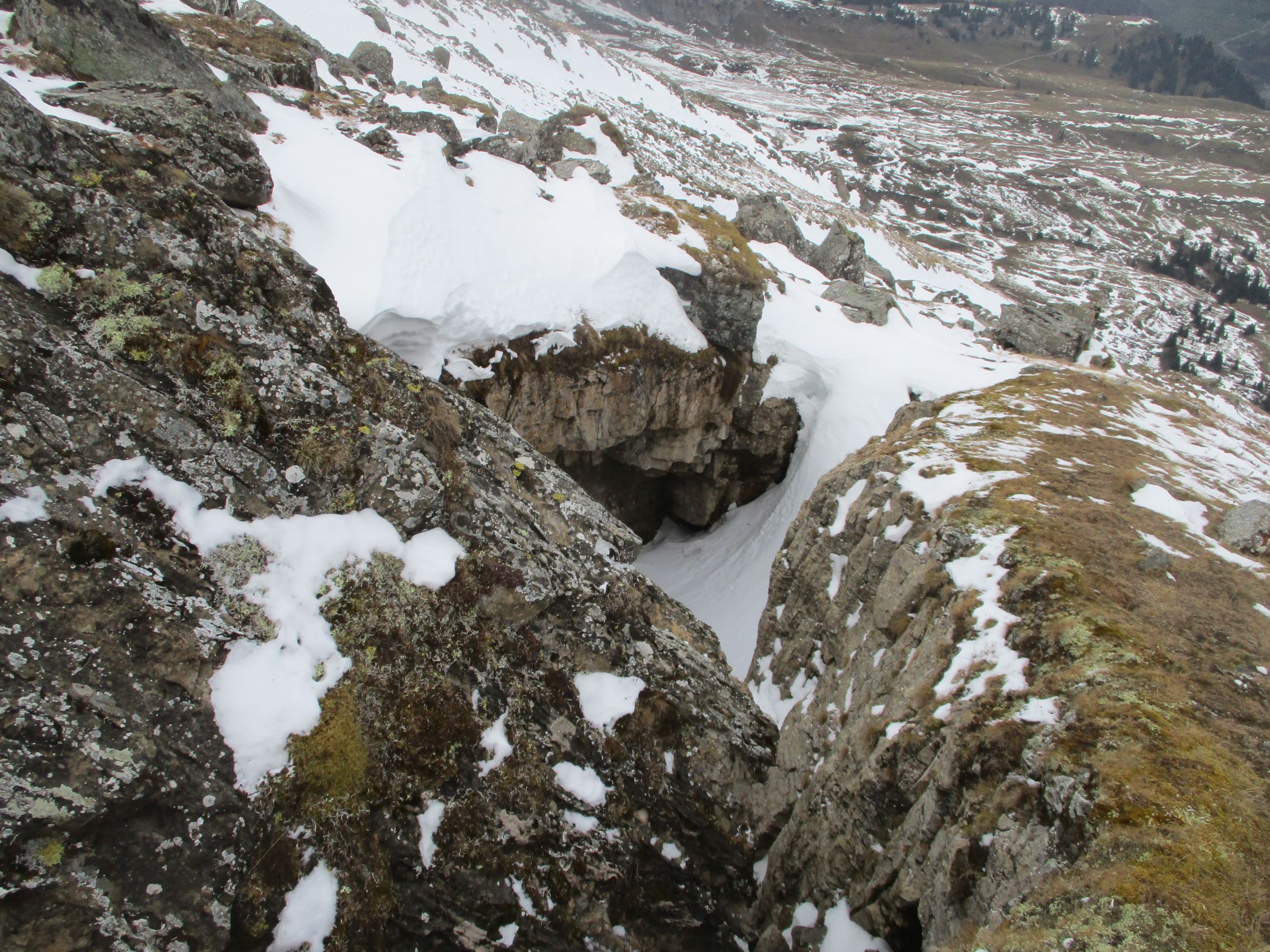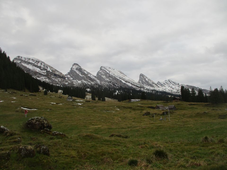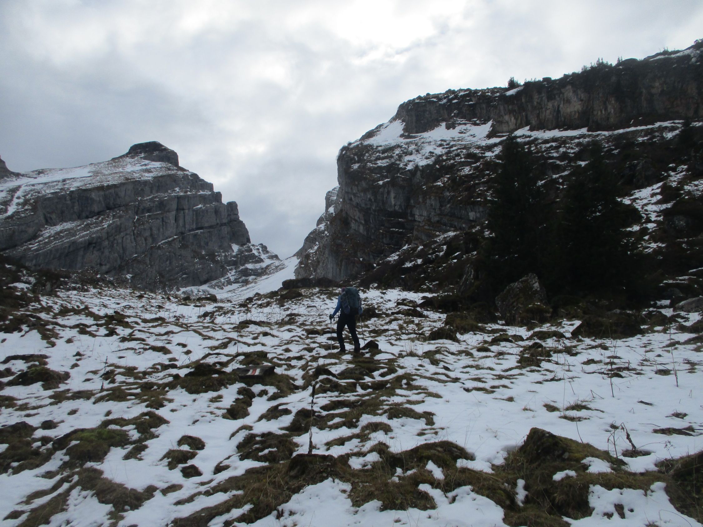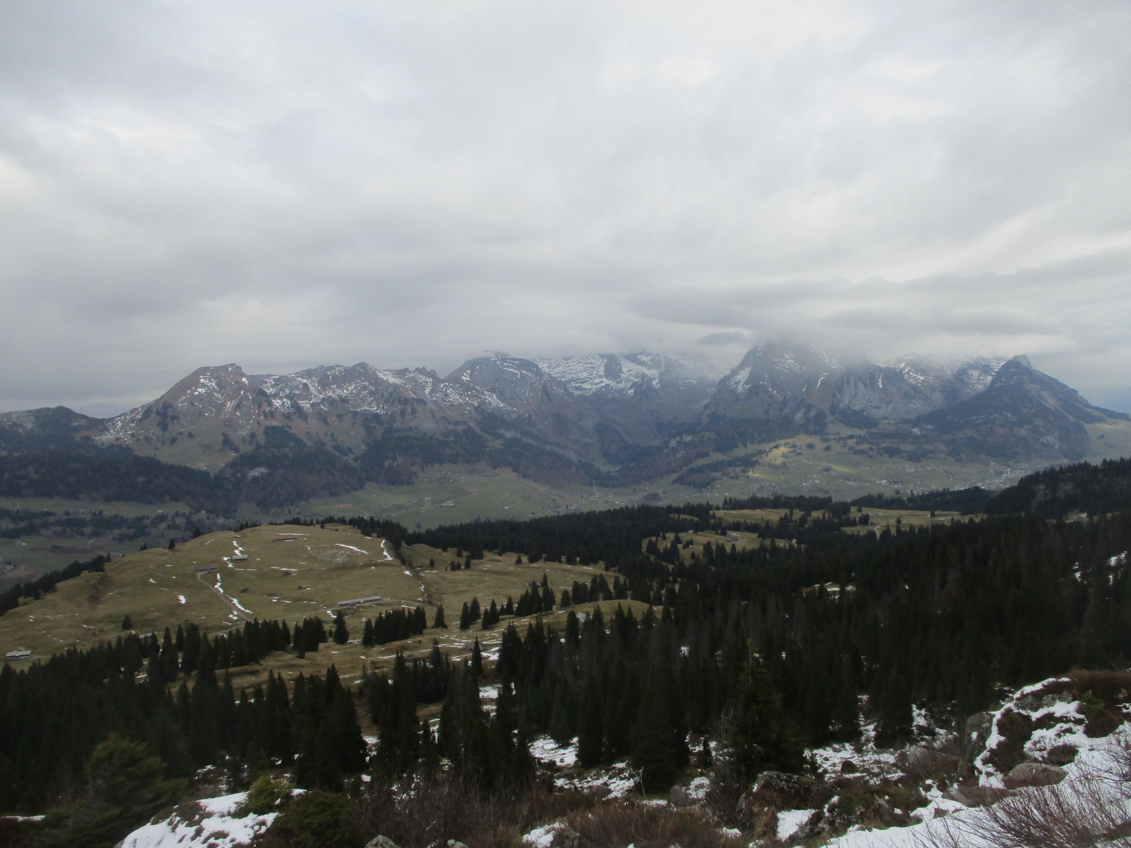 Wäre gut auch komplett ohne Schneeschuhe machbar gewesen, da die Schneelage noch sehr dürftig ist. Das Zwischentief am Alpennordostrand bescherte heute jede Menger Wolken, wobei die Churfirsten im Vergleich zum Alpstein etwas günstiger davonkamen. Dafür genossen wir ein wildherbes Landschaftserlebnis und tiefe Verlassenheit. Zwei Mann kamen unterwegs noch vom Selun zurück. Im Abstieg ein kurzer und eher schwacher Schneeschauer, ansonsten blieb´ds trocken.