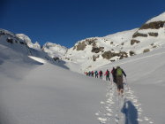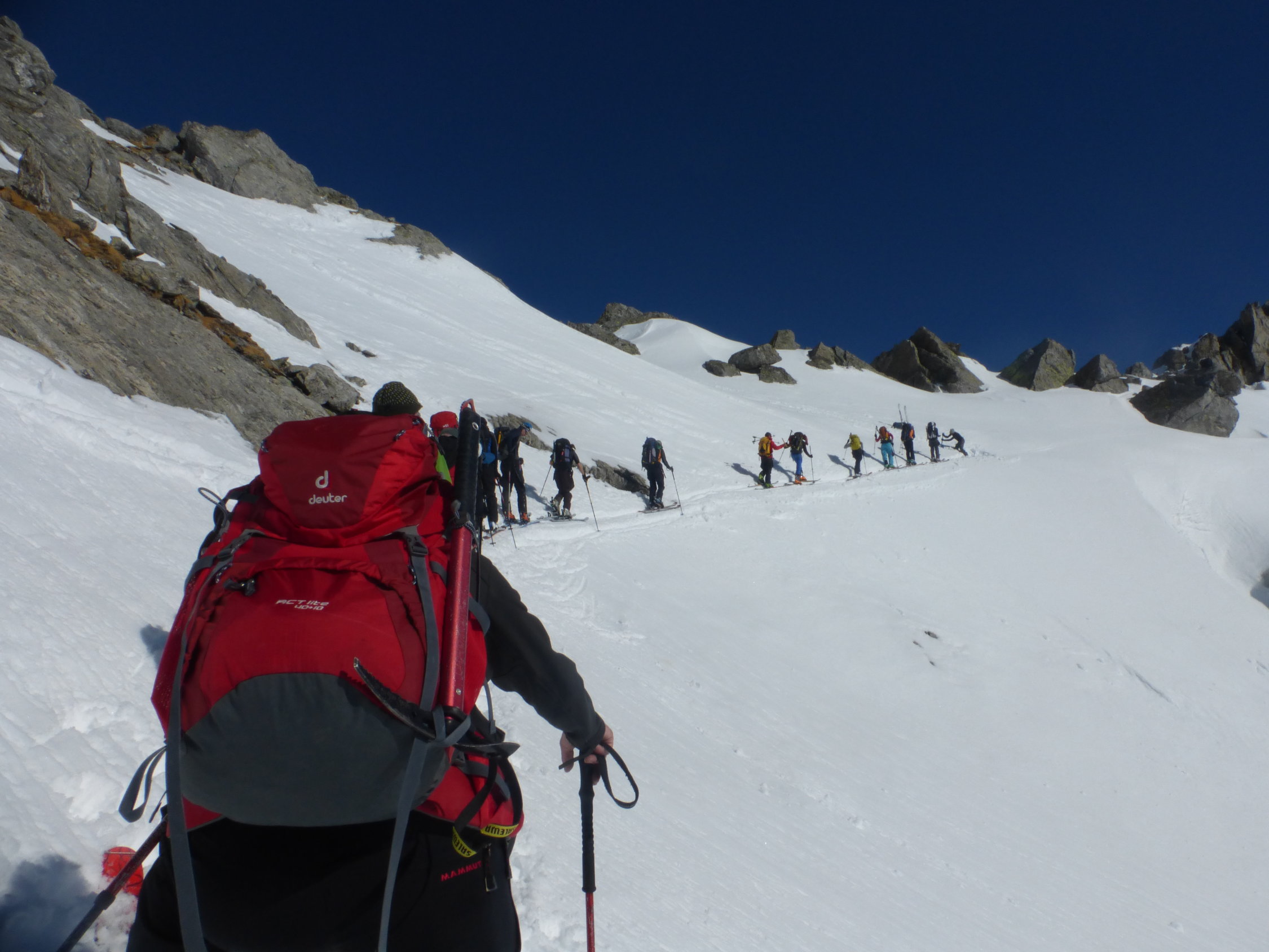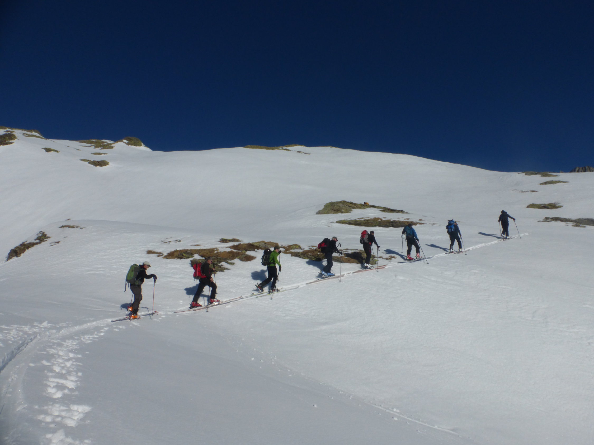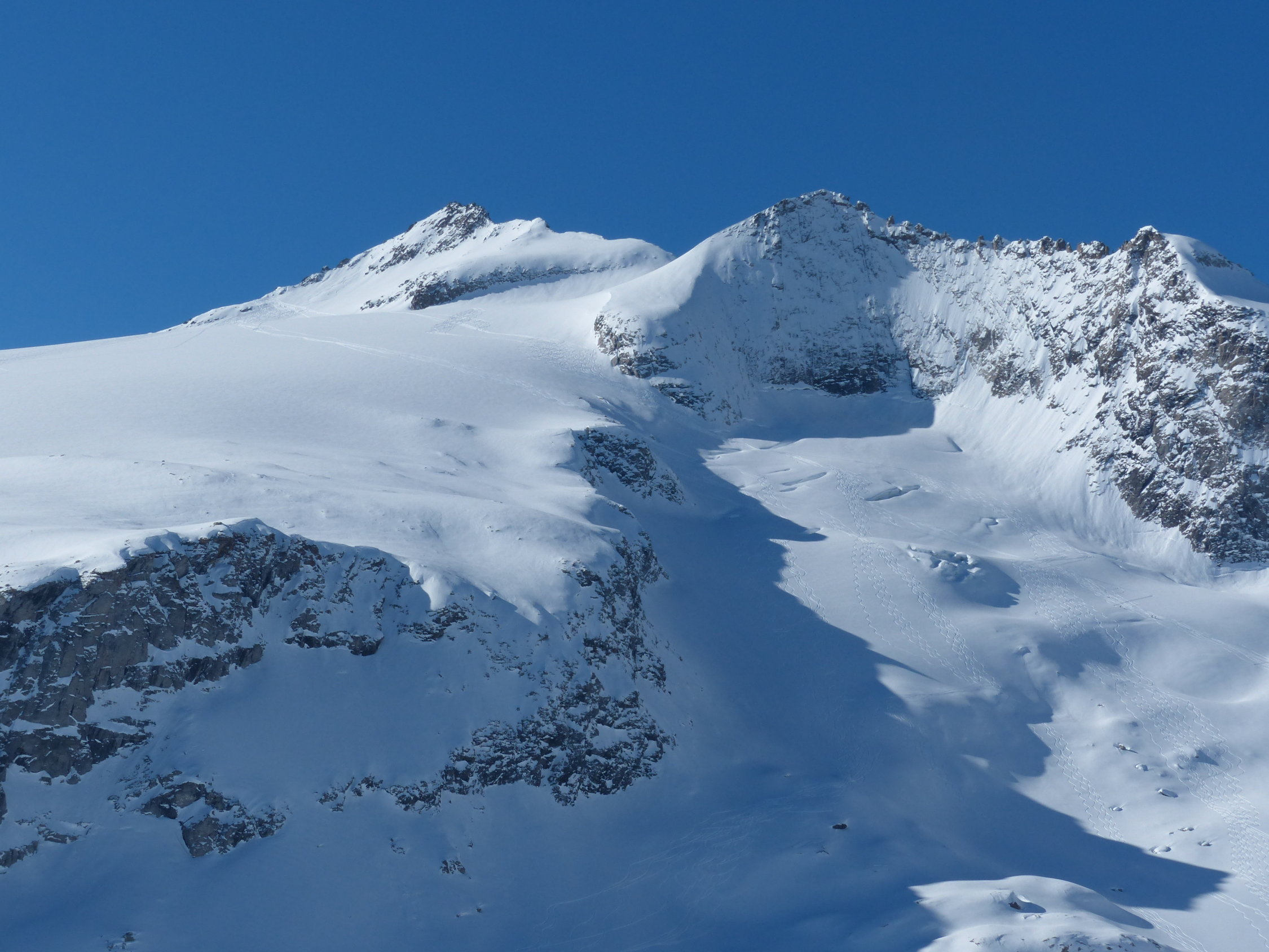 Vereinzelte Stellen (Traversen) heikel. Vom Bergführer sehr gut vorgespurt. Nach dem Pass dann pulvriger Schnee und gute Spur bis zum Skidepot. Einige Schritte zu Fuss zum Gipfel.