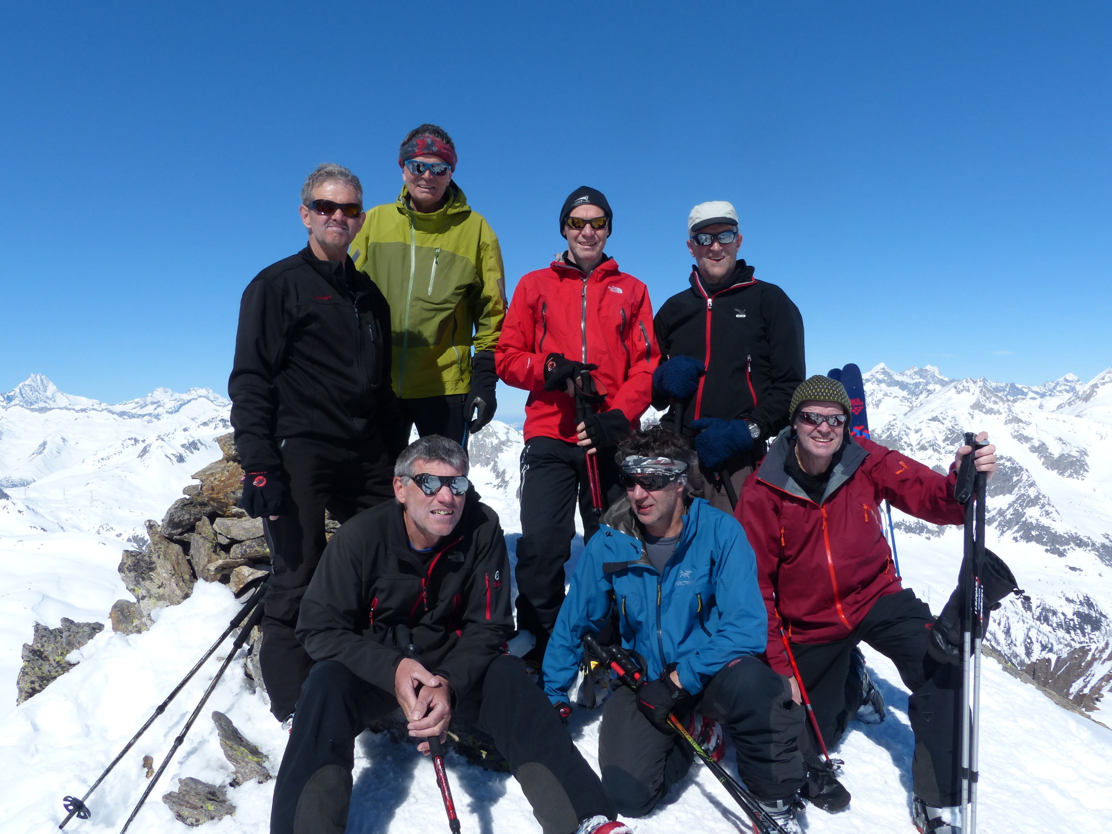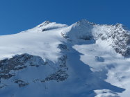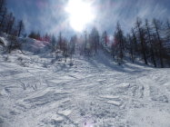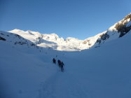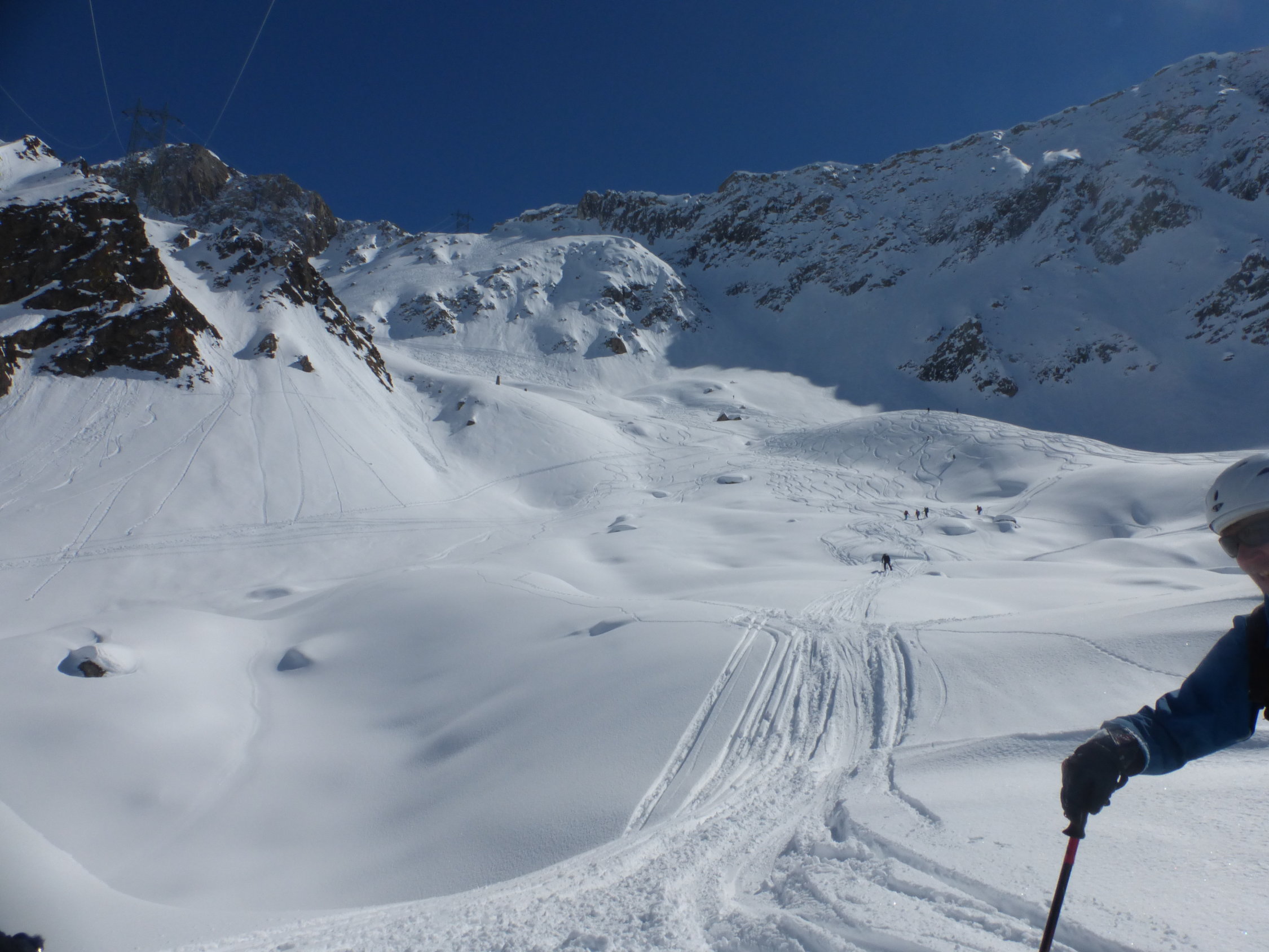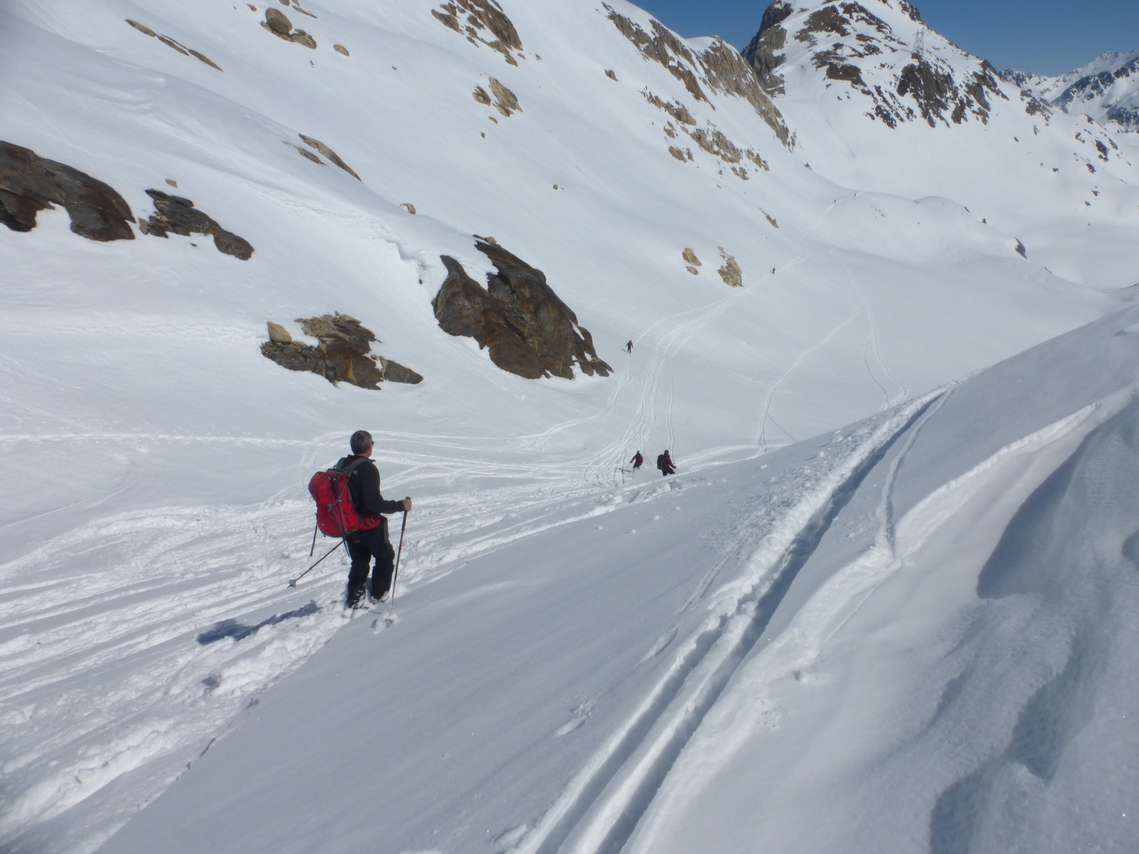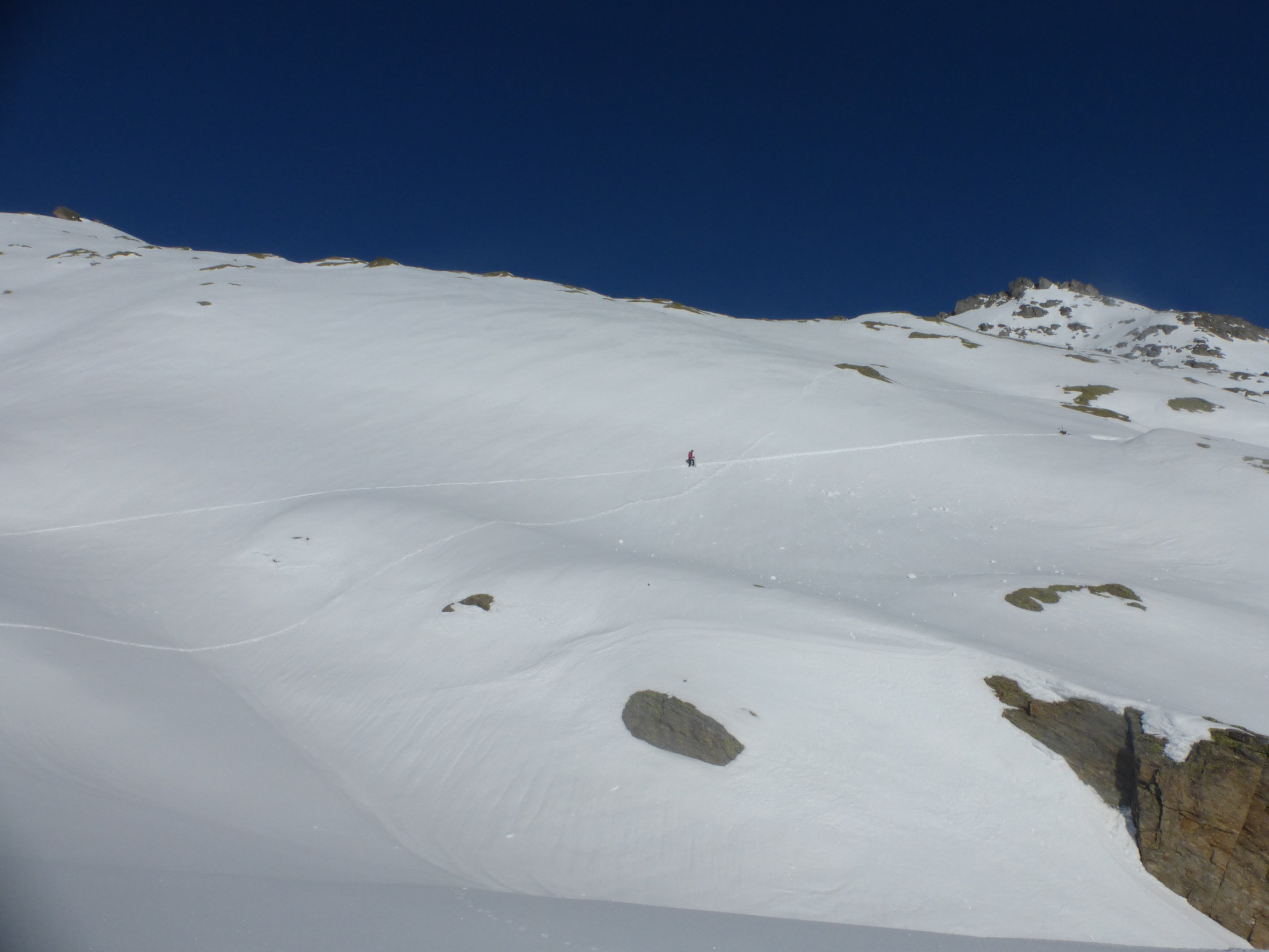 Abfahrt Gipfelhang noch pulvrig, Traverse kein Problem. Kurzer Gegenaufstieg mit 3-4 Spitzkehren. Herrliche Abfahrt im oberen Teil, mit pulvrigen Hängen. Ab Val d'Olgia dann pistenartige Verhältnisse, Schnee teilweise mit Kruste, aber alles noch gut drehbar.