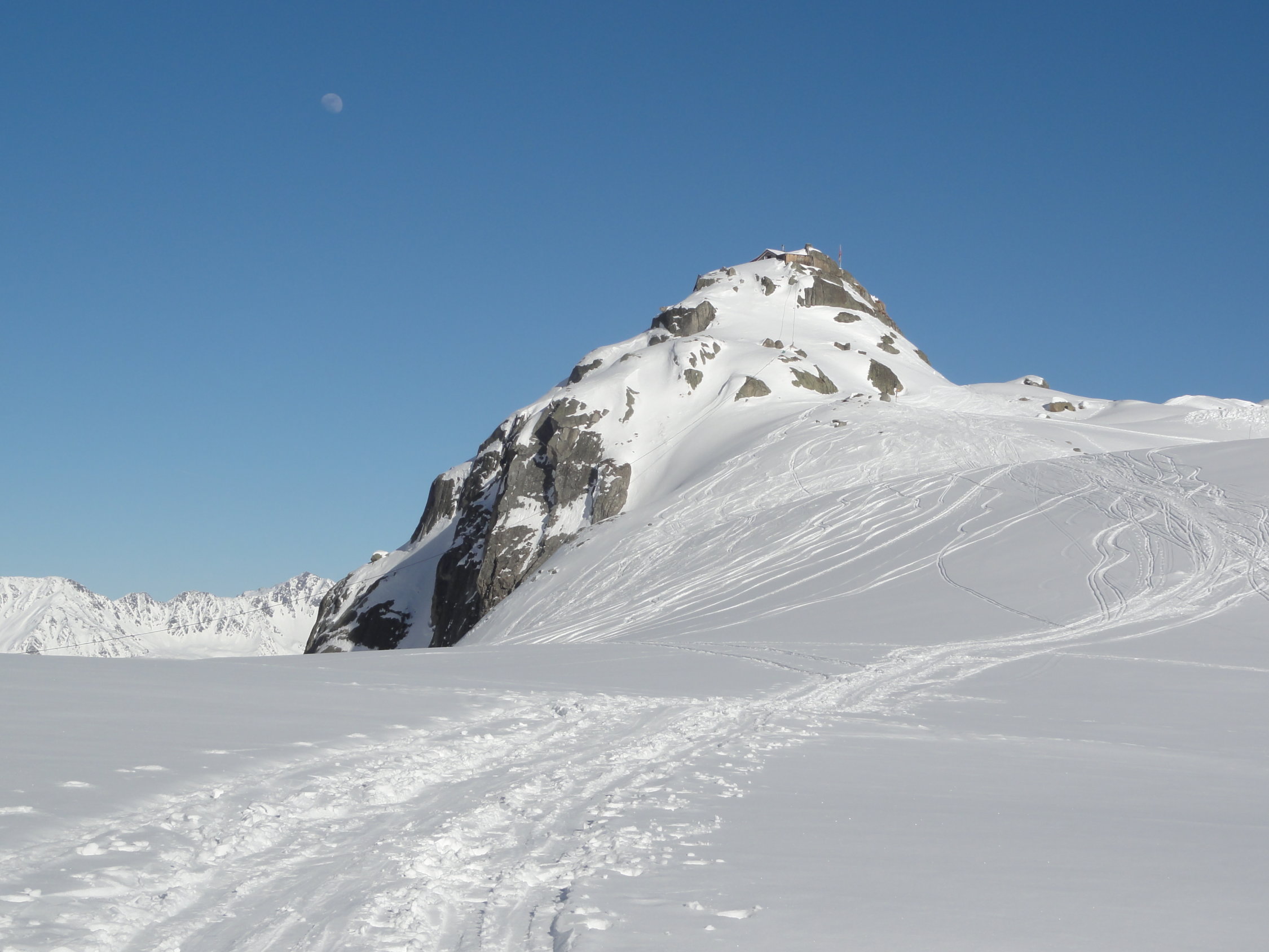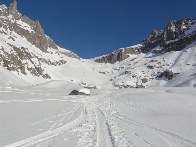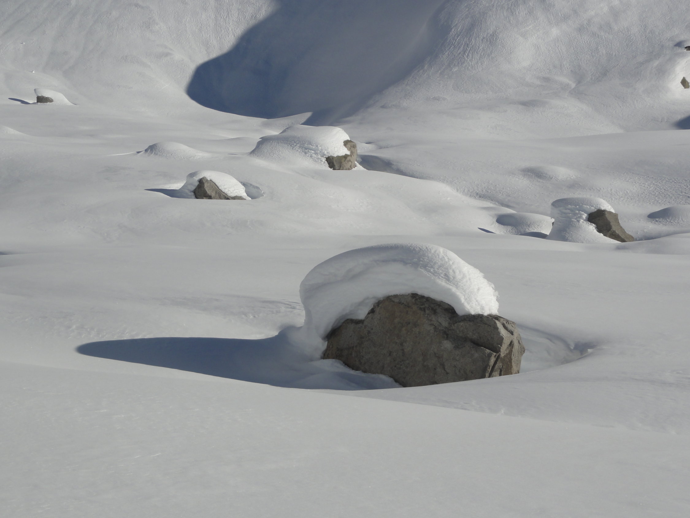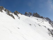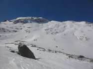 Das Couloir enthält besten Trittschnee. Teilweise sind die Steinblöcke noch mit Neuschnee bedeckt, aber im generellen herrschen ausgezeichnete Bedingungen um vom Fuss des Couloirs auf den Lochberg zu steigen. Pickel und Steigeisen sind derzeit nicht erforderlich.