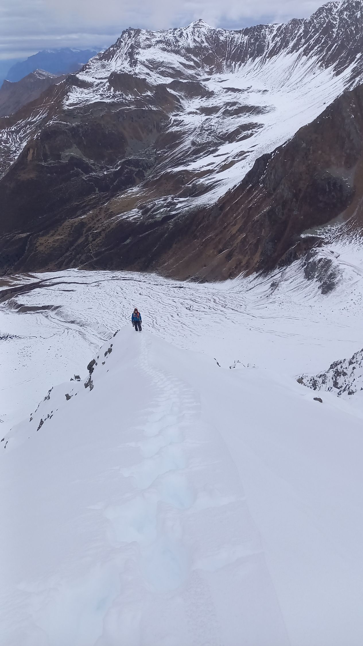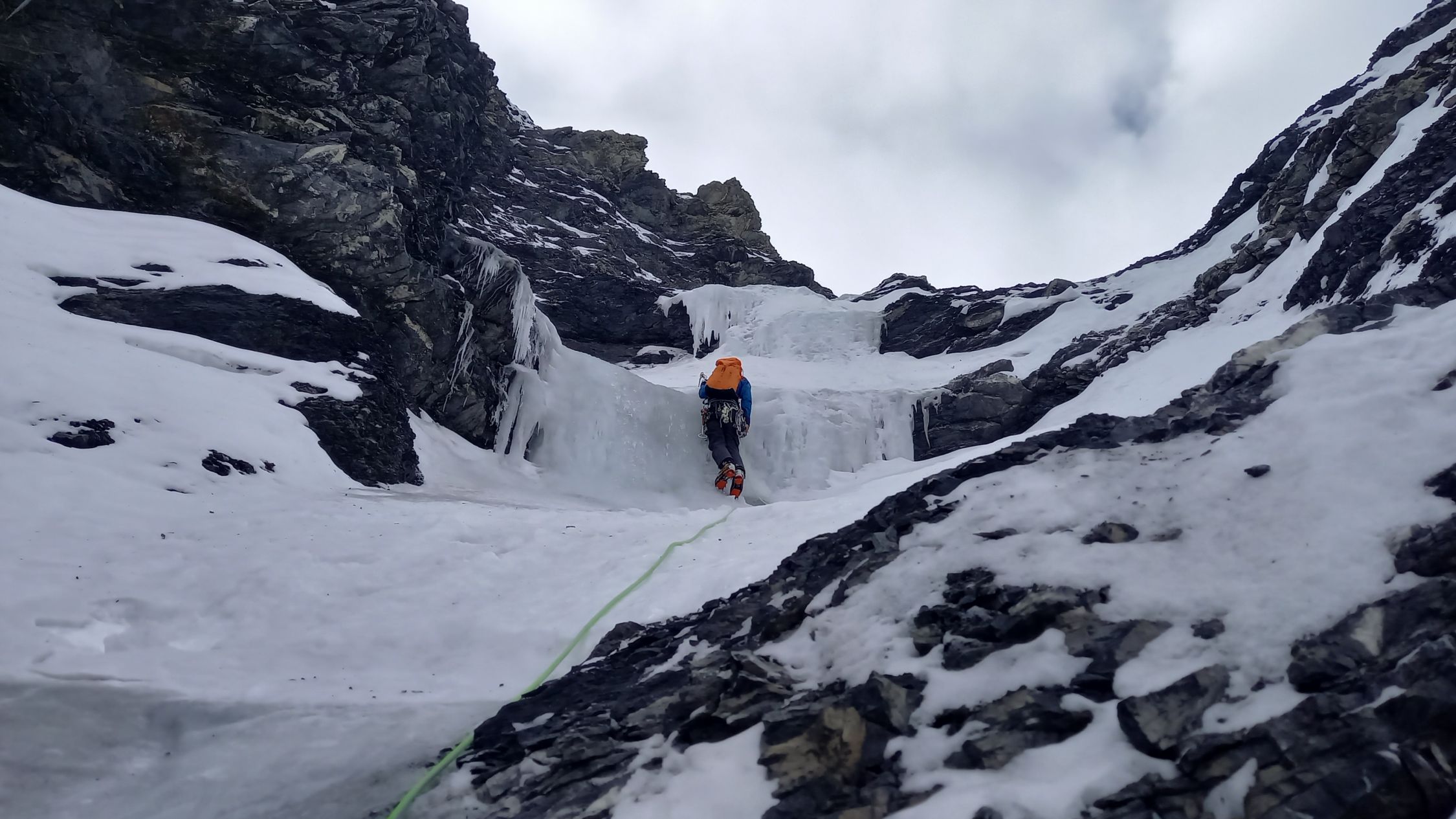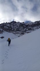 Genug Eis in den Steilaufschwüngen zum klettern und schrauben. Erste Stufe etwa Wi3/M4 danach leichter. Dazwischen Trittschnee. Erst die oberen 150Hm in zunehmend tiefem Pulver. Abstieg mit 20cm Schnee über Normalweg sehr angenehm und schnell.