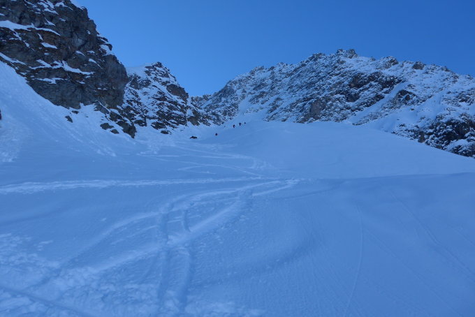 Sehr gute Verhältnisse im Aufstieg. Gute Spur bis zur Kastellücke in gutem, tragfähigen Schnee. Gut ausgetretene Spur in der heiklen Querung nach der Kastellücke. Gipfelgrat war noch ohne Steigeisen und Pickel zu machen. Richtigen Trittschnee gab es aber nicht mehr und mit Steigeisen ist es definitiv angenehmer. Wir sind über den Basòdino-Gletscher zur Hütte abgefahren - 750 hm Pulvertraum. Allein dafür hat es sich gelohnt.