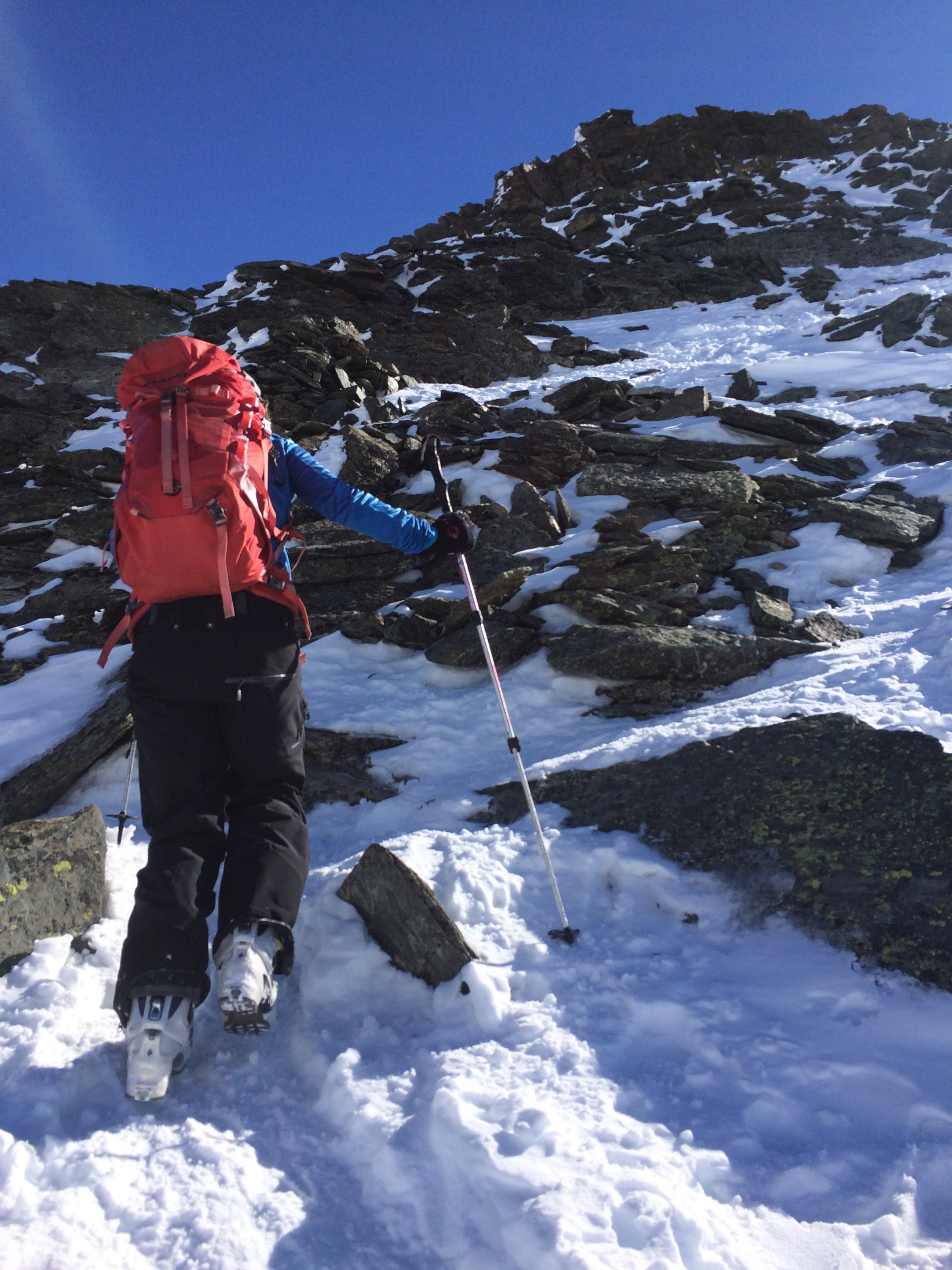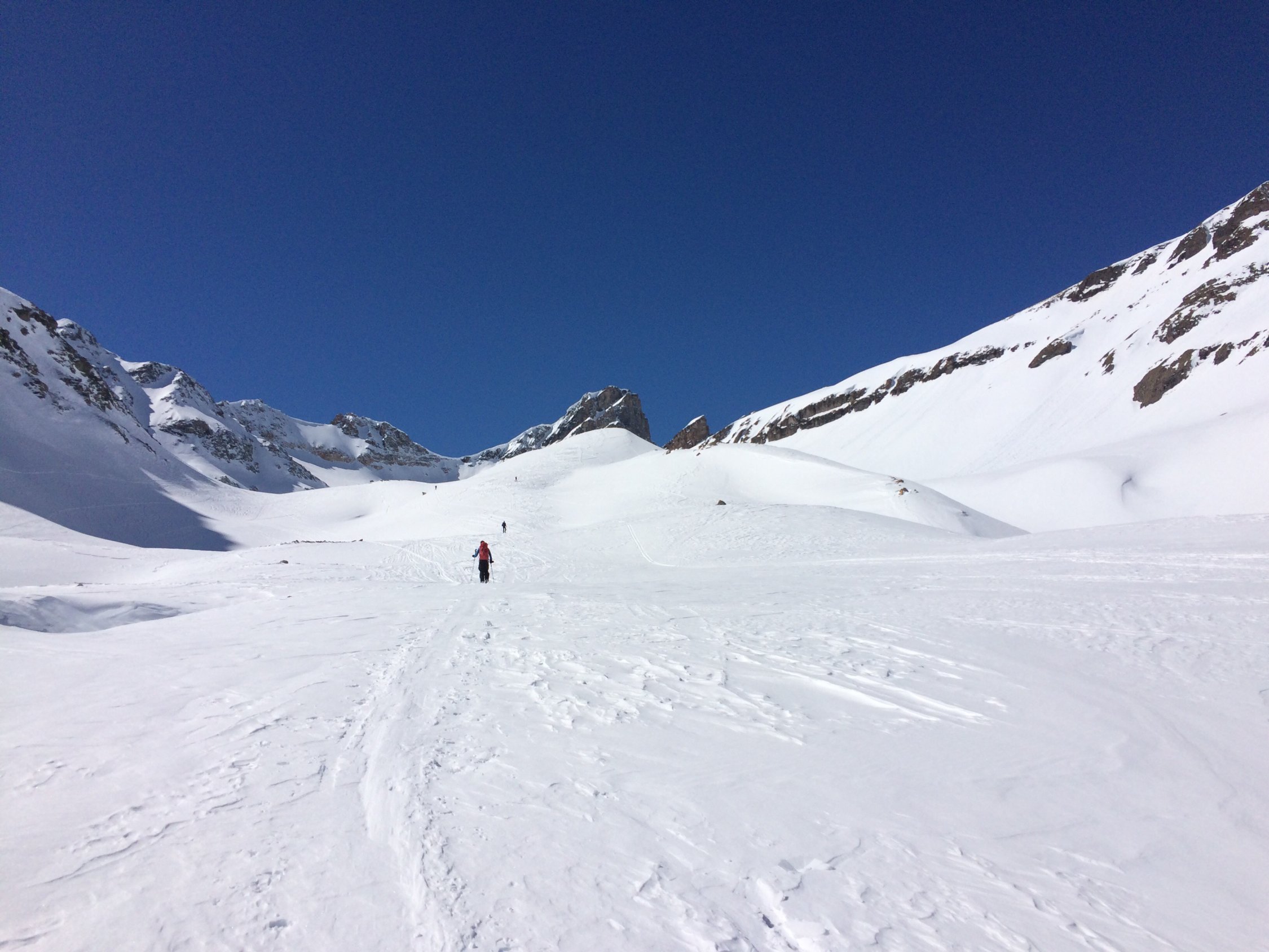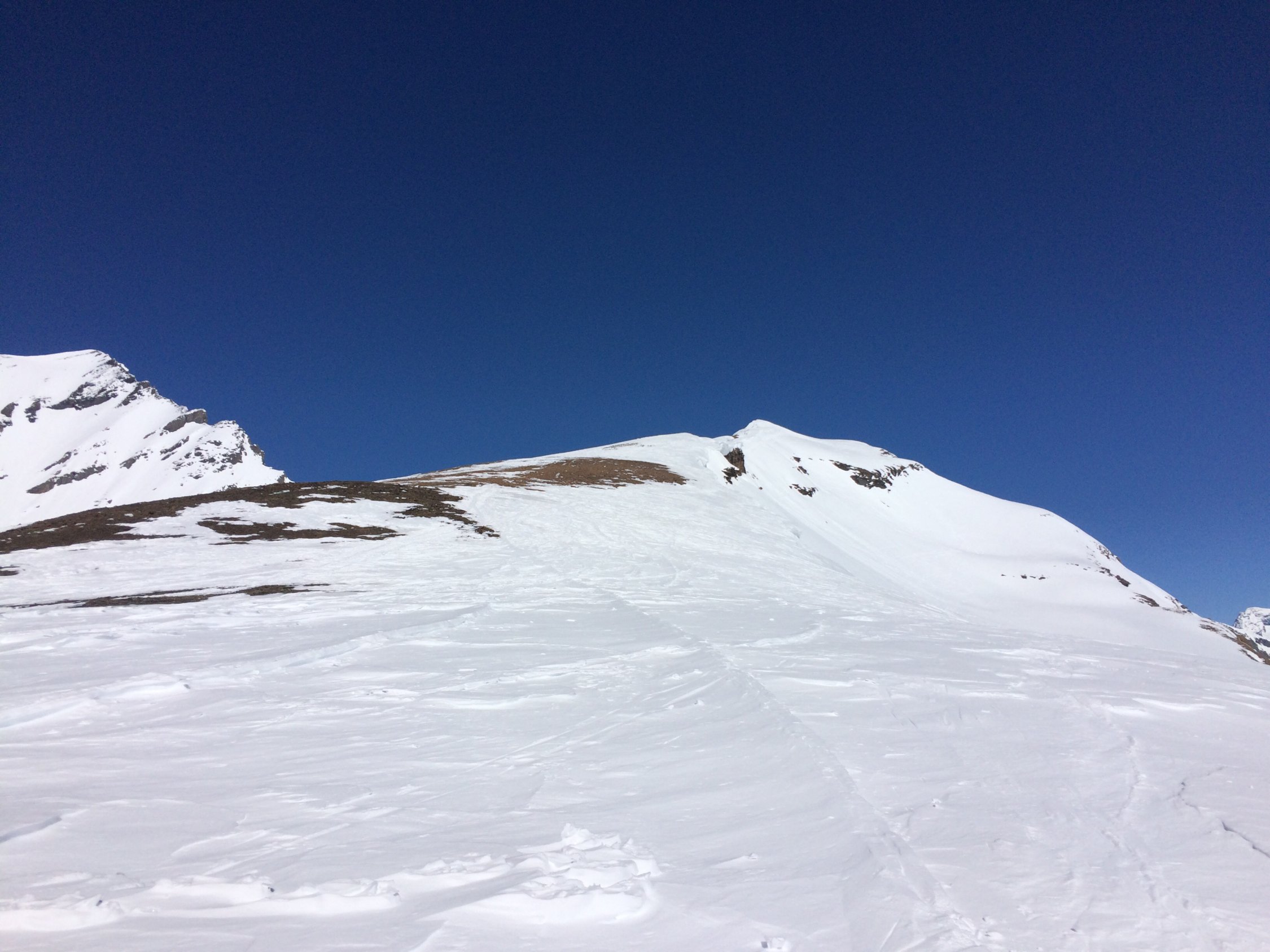 Aufstieg vom Ferdenpass auf das Ferdenrothorn über sehr ruppiges Gelände. Der Wind hat alle alten Spuren freigeblasen und eine fast unfahrbare Schneelandschaft gebildet. Stellenweise ist der Rücken komplett bis auf die Steine abgeblasen. Oberhalb 2950m geschlossene Schneedecke. Abfahrt vom Ferdenpass bis Flüealp durchgehend stark gedeckelt und nicht immer tragend, Fahrgenuss sieht anders aus. Unterhalb Flüealp leicht aufgesulzt und etwas angenehmer zum Fahren