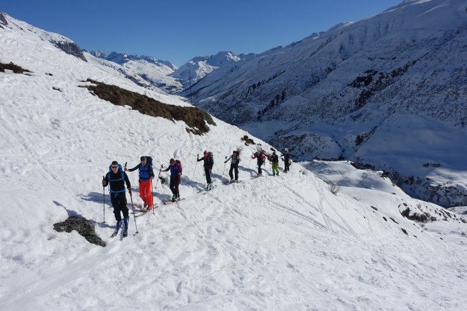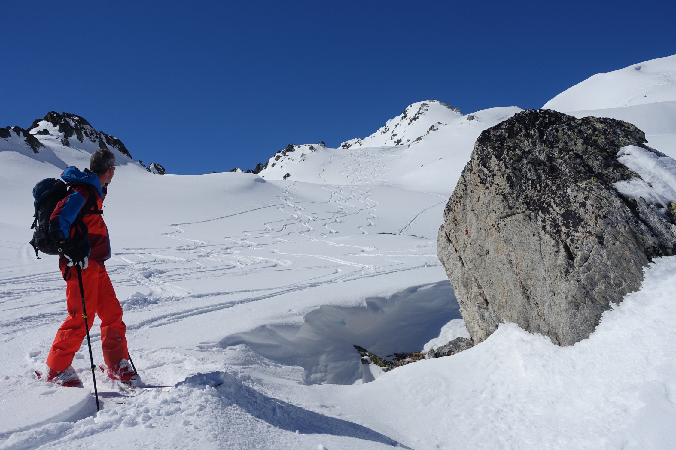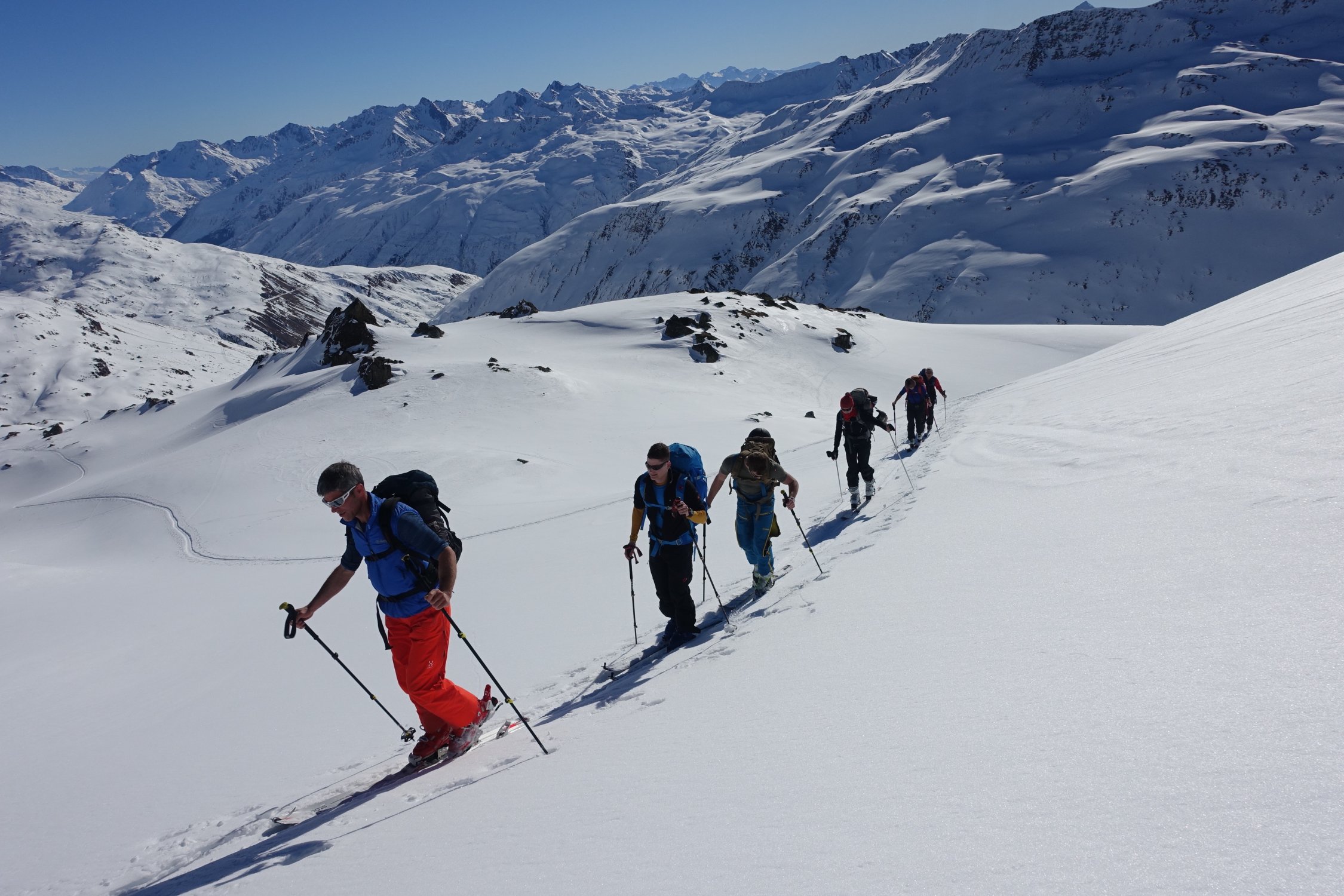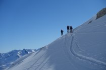 Auf der ganzen Route sind derzeit keine Harsteisen notwendig. Evt. auf dem Grat wenige Meter die Ski hoch tragen.