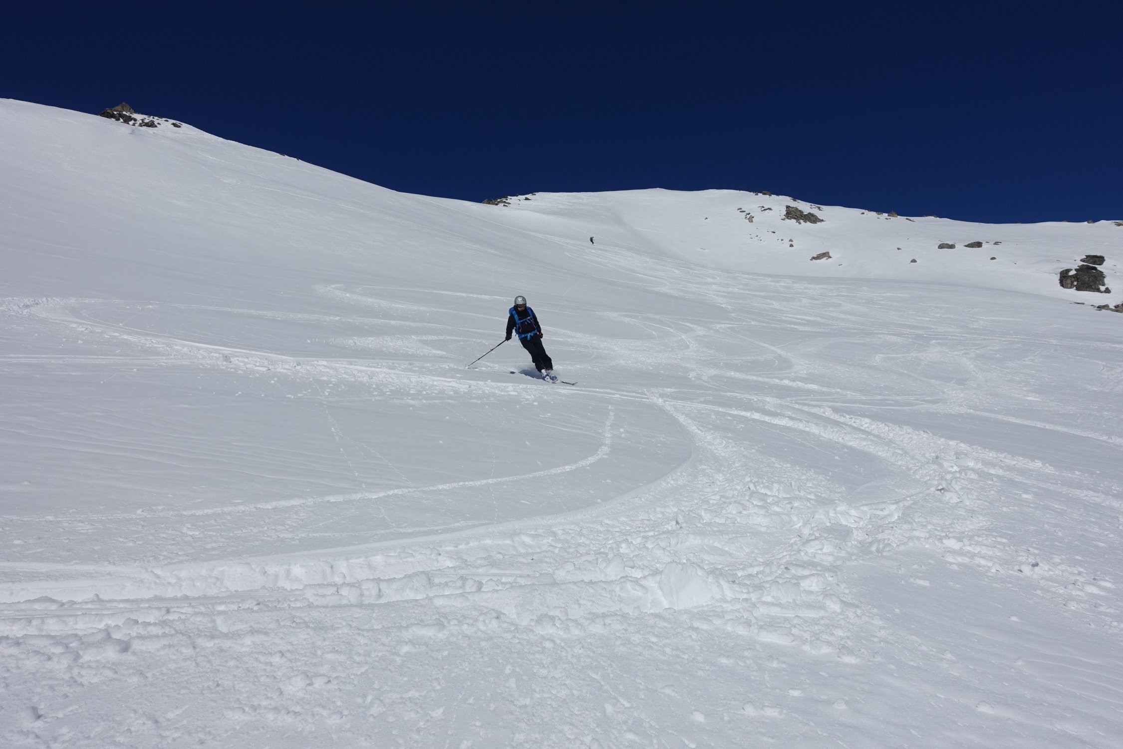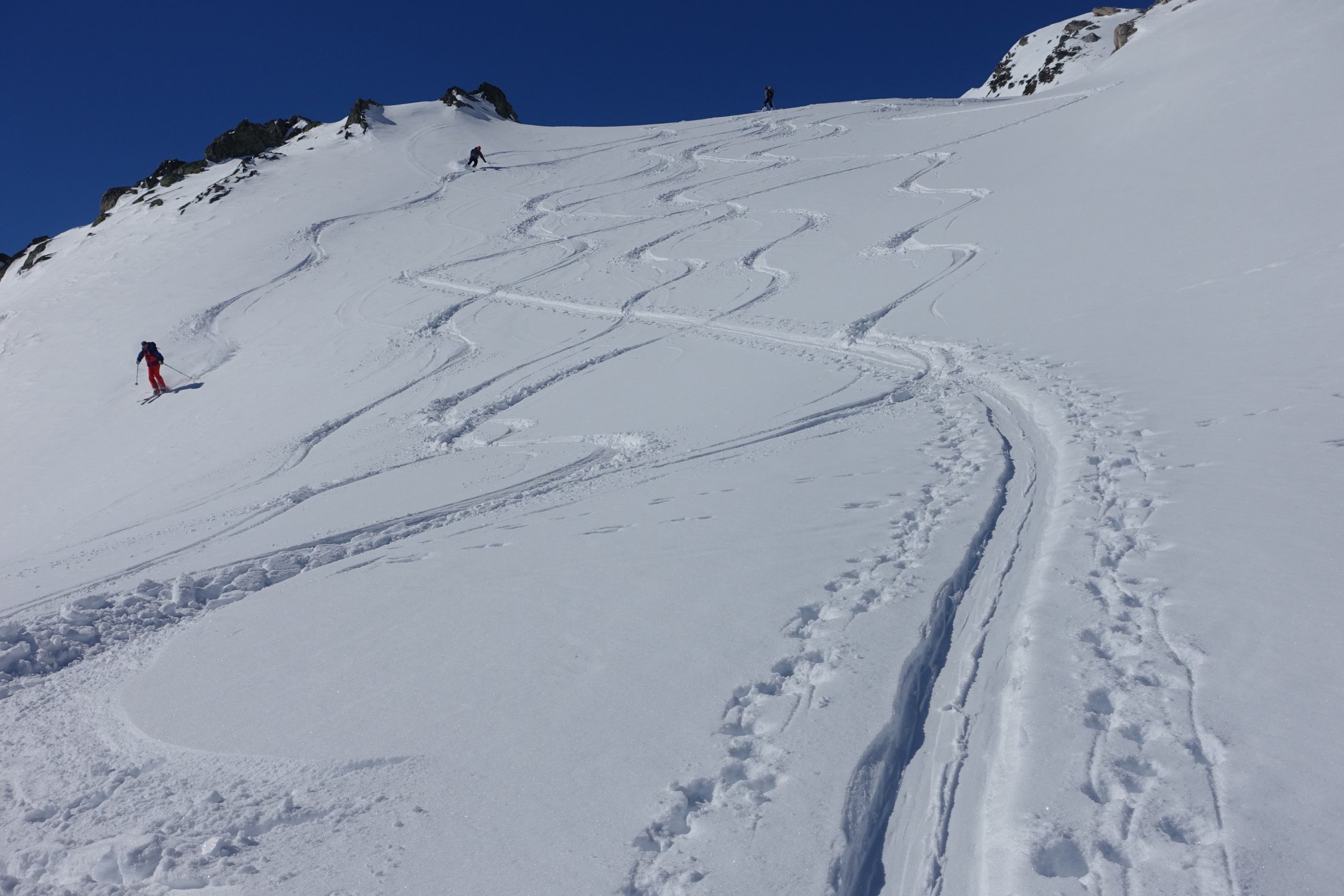 Schlichtweg der Hammer heute! Wenn man das Gelände korrekt ausnutzt, ist es noch möglich, zu dreiviertel der Route in herrlichem Pulver abzufahren!