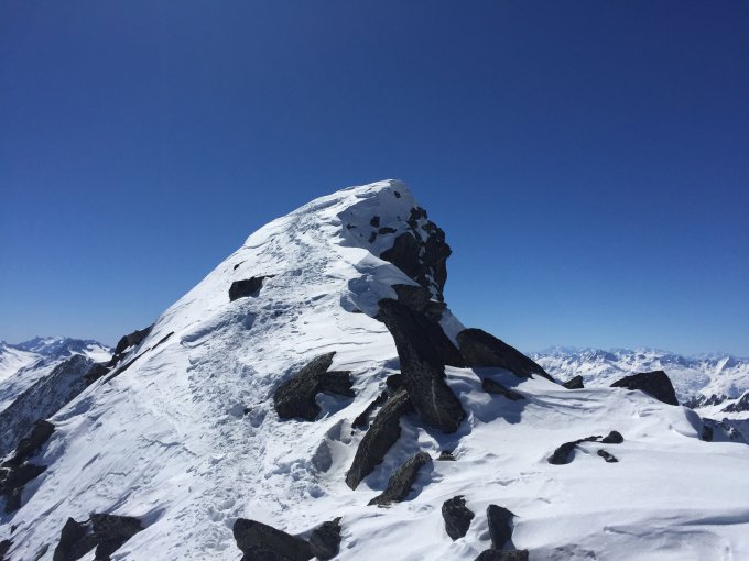 Wir sind mit den Skier bis praktisch zum Gipfel hoch. Die meisten Tourengänger haben indes die Skier bereits bei der Lücke zurückgelassen und sind von da hochgelaufen. Steigeisen sind keine nötig für den Gipfel.