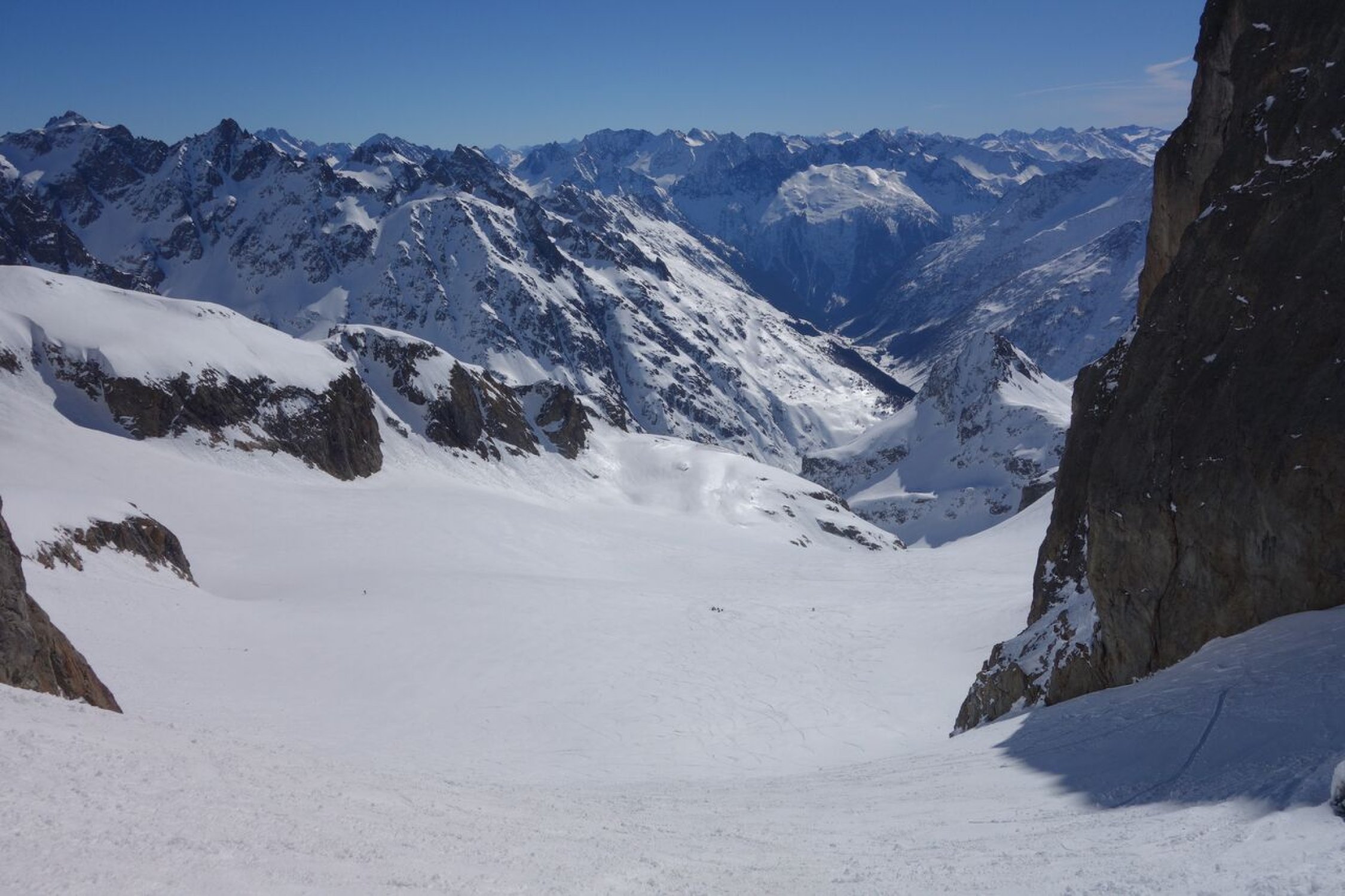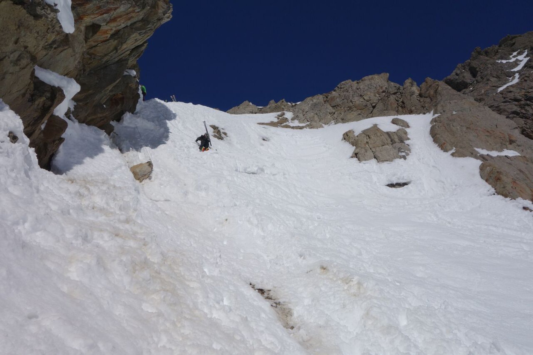 Abfahrt um 09:30 bis ca. 2720m auf Stössenfirn hart, dann Gegenaufstieg zum Sattel zw. Wichelplangstock und Stössenstock. Abstieg auf Wichelplanggfirn: Fixseil ist zur teilweise frei. Die 10m abfahren geht für sehr gute Skifahrer. Ich empfehle entweder mind. Pickel, besser noch mit eigenem Seil (wir waren froh, hat uns ein Bergführer an sein Seil gelassen). Abfahrt um 11 Uhr ab Wichelplanggfirn durchs Hohbergtal bis Gorezmettlen dann schönster Firn. Eine halbe Stunde früher wäre noch besser gewesen.