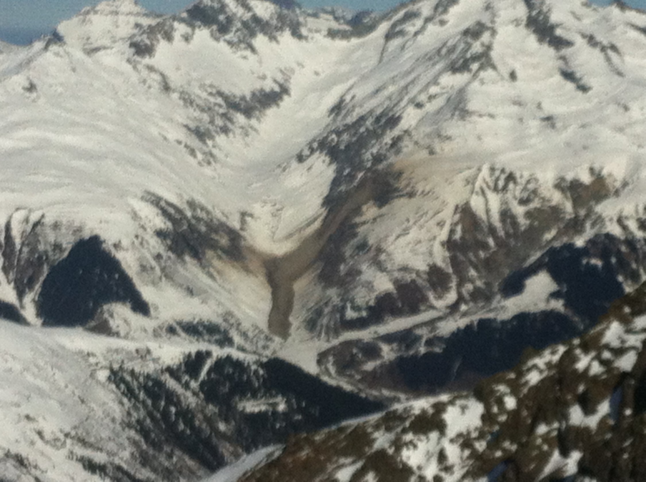 Vom Gipfelgrat aus sieht man den eindrücklichen Bergsturz im Val Strem von vor einer Woche. Die Staubwolke hängt immer noch darüber.