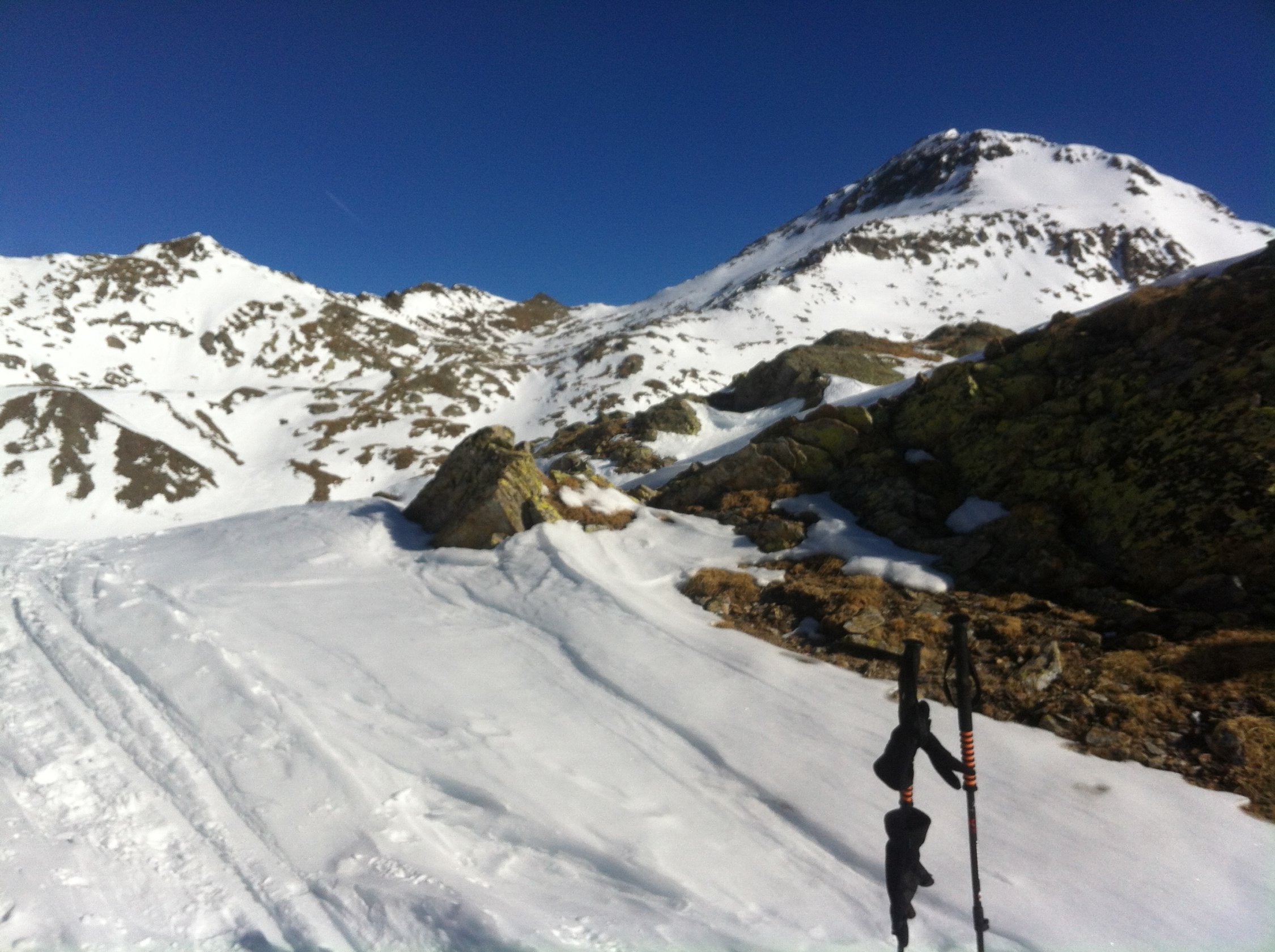 Allgemein wenig Schnee im Gebiet. Schneedecke im Aufstieg tragend gefroren, bei den steilen Hängen sind Harscheisen nützlich. Orientierung im coupiertem Gelände nicht immer einfach, im Moment ist die Spur tendenziell eher etwas zu hoch.