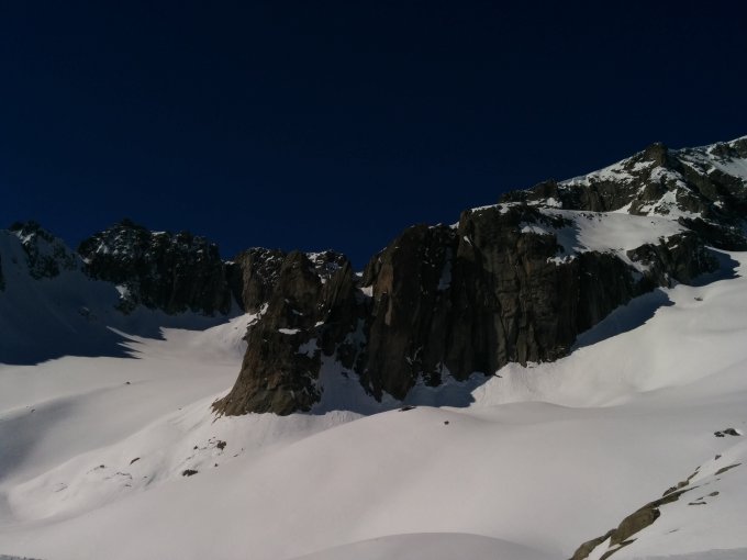 Super Verhältnisse - Aufstieg bei der Hitze und mit schwerem Gepäck ist zwar schweißtreibend, aber der Fels ist trocken und angenehm warm zum Klettern. Man kommt mit den Ski bis zum Einstieg, allerdings ist der erste Stand unterm Schnee, sodass bis zum 1. BH etwas heikel ungesichert geklettert werden muss (ein schlechter Friend kann gelegt werden). Die Routen weiter rechts (Elefant, Conquest) sahen auch gut aus, nur ganz rechts hat es einige Schneefelder. Chli Bielenhorn Südwand hatte noch ein paar weiße Flecken, aber ist je nach Linie sicherlich auch kletterbar (siehe Foto).