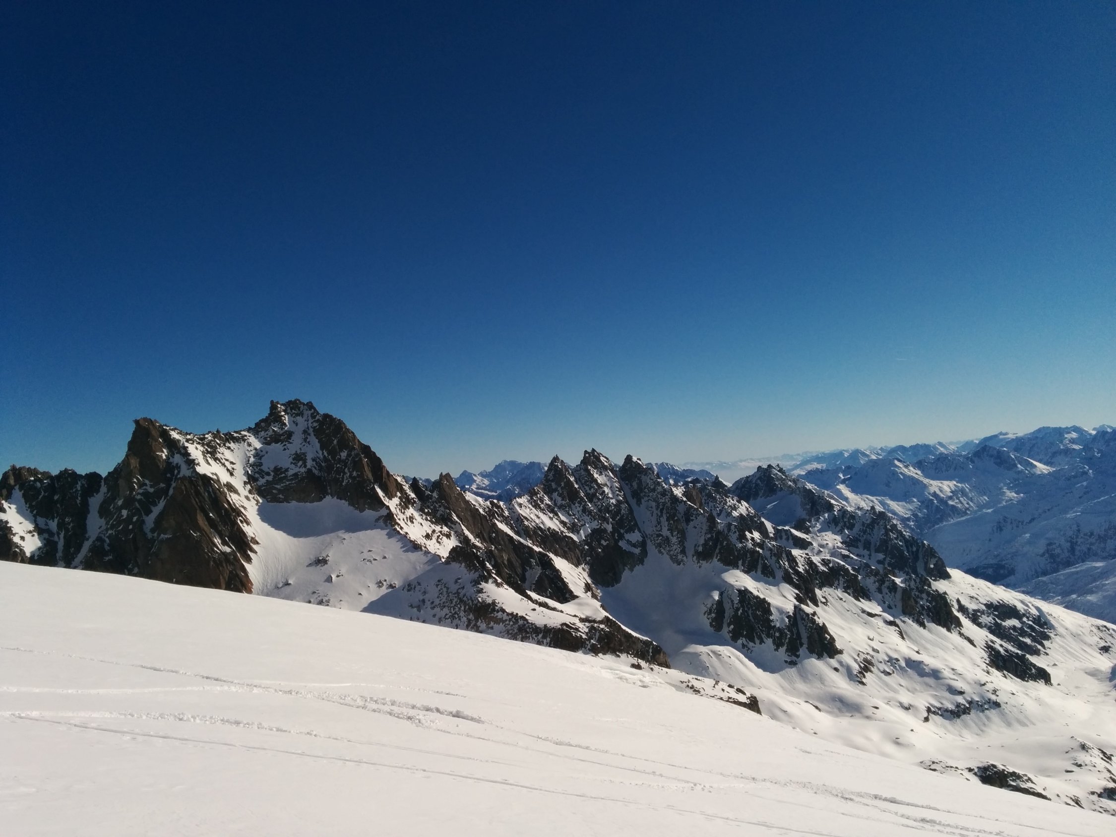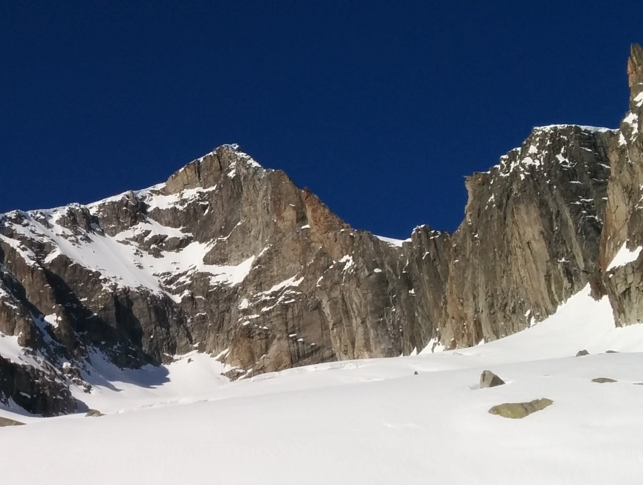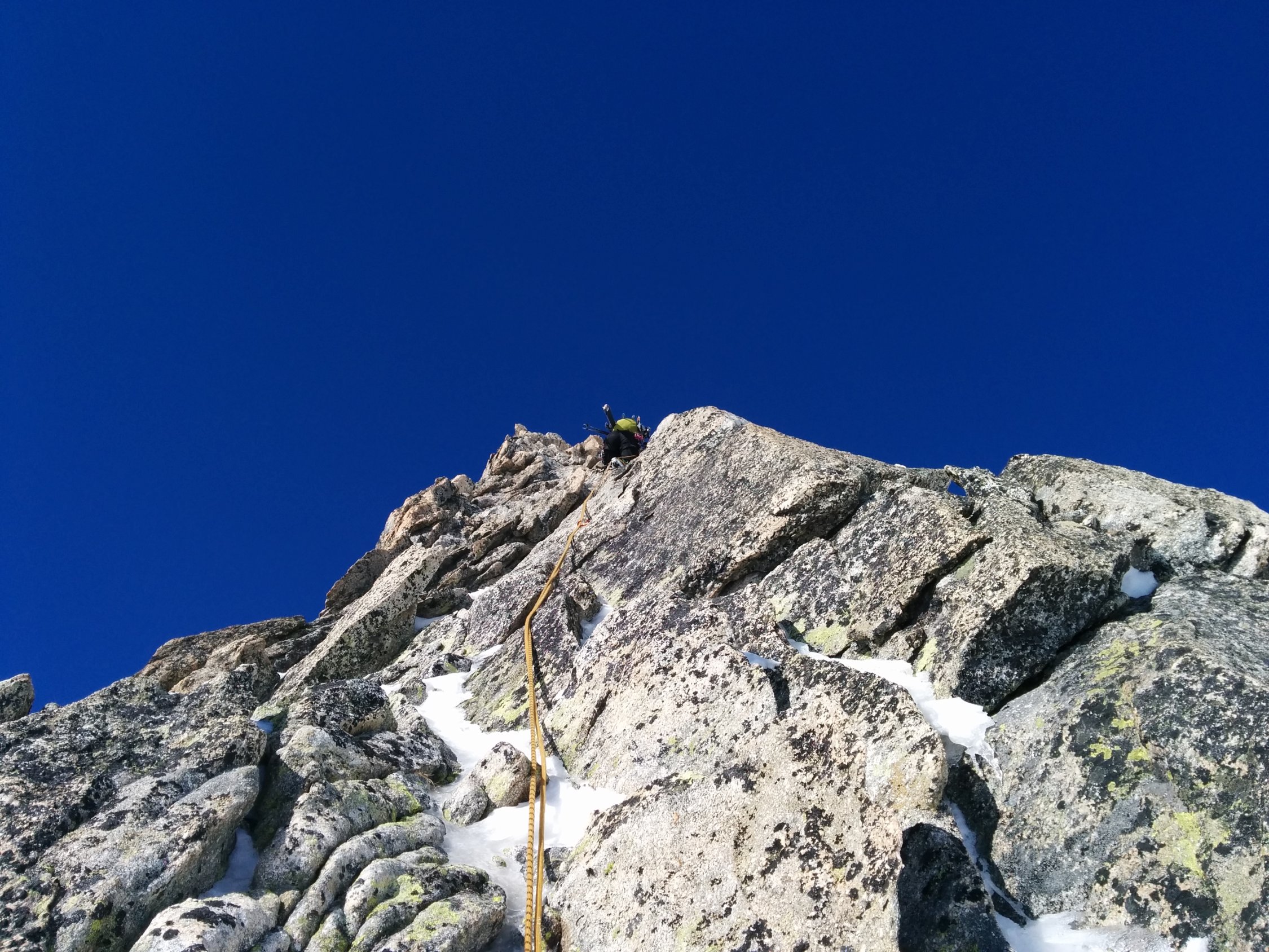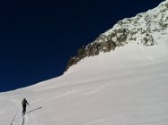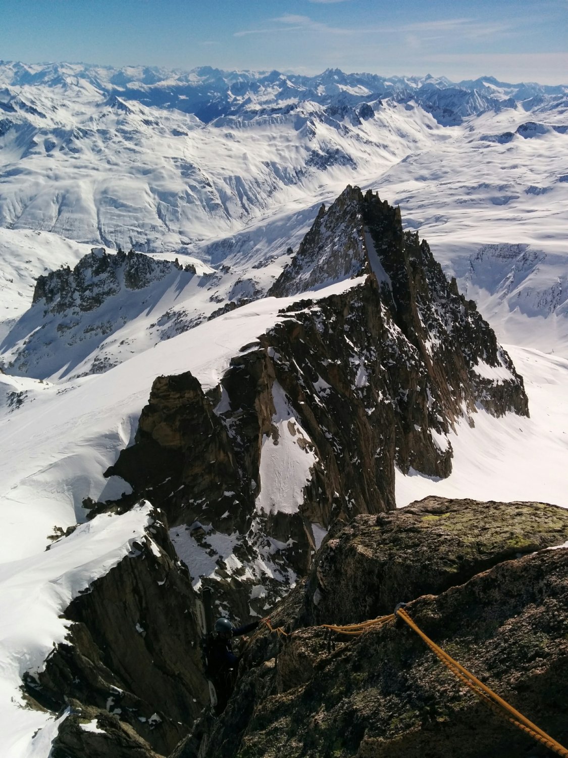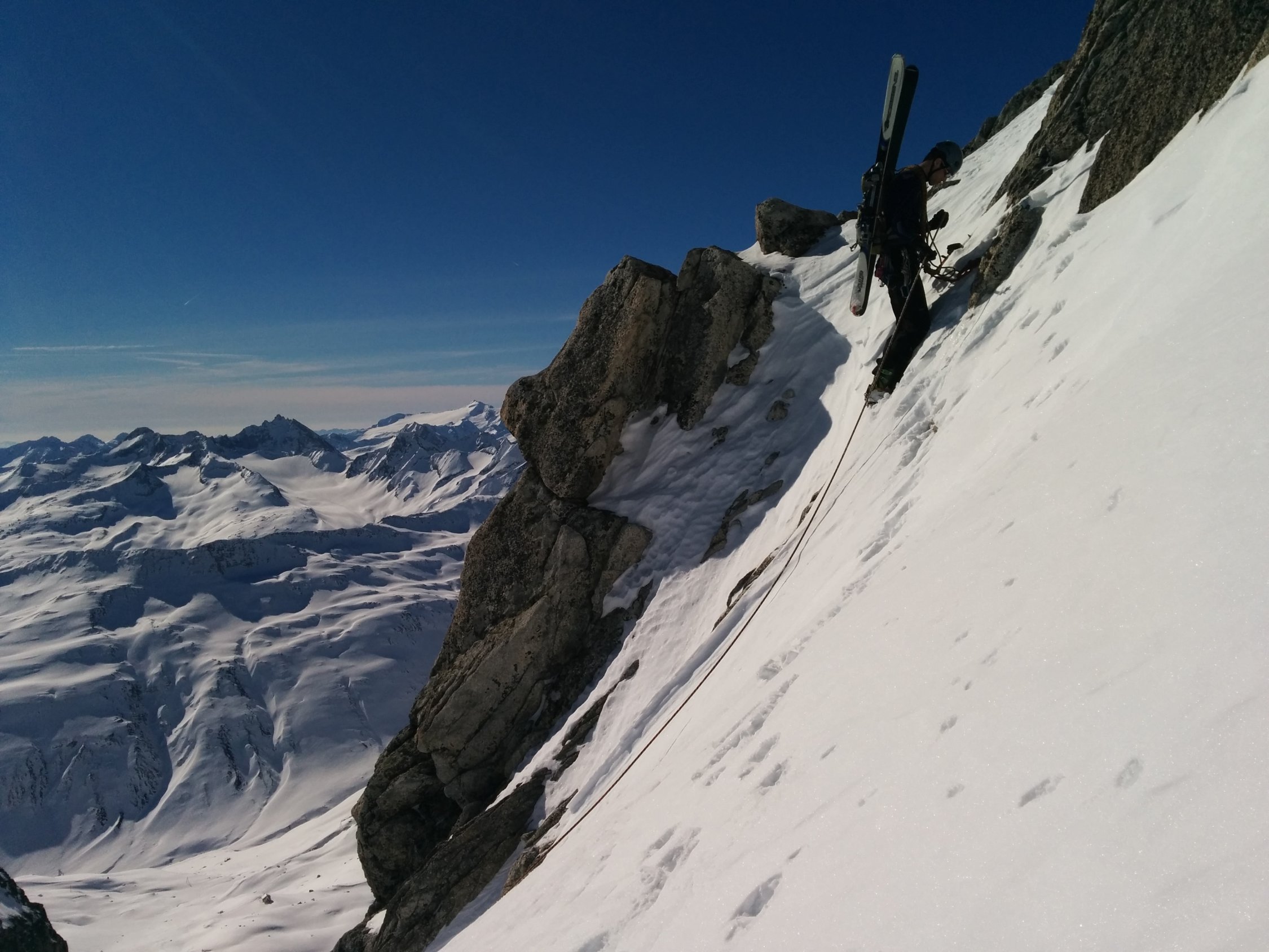 Grat ist machbar, aber mit Steigeisen und Ski auf dem Rücken ein längeres Unterfangen... Der Einstieg ist von der Oberen Bielenlücke unschwierig zu erreichen, haben glücklicherweise gleich einen BH gefunden. Der Fels ist zumeist schneefrei und hat in der Sonne auch angenehme Klettertemperatur. Zwischendrin gibt es aber immer wieder mehr oder weniger heikle Passagen durch lockeren Schnee, z.B. im zweiten Teil der Schlüsselseillänge (nach dem Mini-Überhang). Im oberen, flacheren Teil dann viel Schnee mit relativ wenigen Sicherungsmöglichkeiten. Besonders der Ausstieg kurz unter der Wächte ist im steilen Lockerschnee mit Felskontakt unangenehm zu Klettern. Ein kleines Set Friends und ausreichend Schlingen sind zu empfehlen. Wir haben allein für den Grat über 7h gebraucht, also ordentlich Zeit einplanen. Gletschhorn Südgrat sah ebenfalls machbar aus, Graue Wand hat noch relativ viele Schneefelder (siehe Fotos). Abfahrt über den Rhonegletscher nach Belvedere (siehe separater Eintrag) und über die Passstrasse (200Hm / 4km Gegenanstieg) zurück zum Hotel Tiefenbach.
