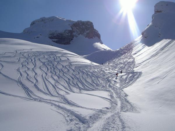 Im oberen Teil sollte auf eine bewusste Spurführung geachtet werden. Steilere Hänge vom Chaiserstock mit vereinzelten kleinerem Schneerutschen.