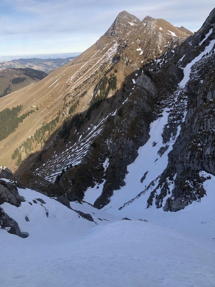 Schöne Novemberwanderung als Reko-Tour heute 12. Nov. vervollständigt. Ab Schwarzsee Gypsera dem Wanderweg folgend via Pt. 1354 zur oberen Riggisalp 1480. Ab hier weglos in südlicher Richtung durch die steile Nordflanke. Auf Höhe 1800 gewechselt auf Steigeisen / Pickel. Das ganze Couloir ist durchgehend eingeschneit / hart bis Ausstieg auf Grat ca. 2000müM. Bis Gipfel auf einzelnen Schneefeldern problemlos.