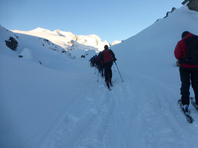Vom Start weg harte Oberfläche ab Randinascia 2156 dann zunehmend Pulverschnee und problemlos zum Gehen. 2-3 steilere Passsagen bis zum Skidepot. Gute Spuranlage von unserem Bergführer.