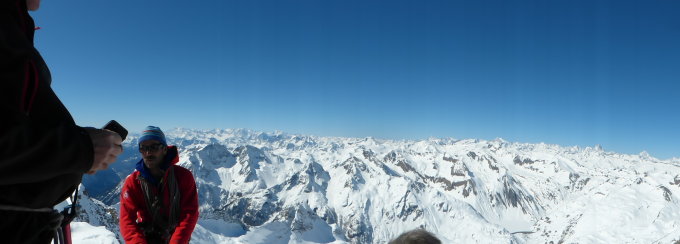 Vom Skidepot zu Fuss am Seil über Fels und Firn des Ostgrates. Herrliche Rundsicht auf dem Gipfel.