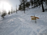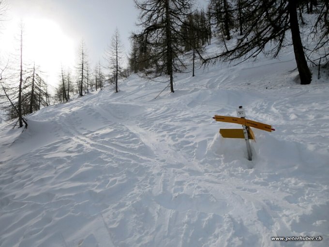 Etwas Sonne, zeitweise leichter Schneefall. Oben eisiger Wind. Sicht OK. Im Aufstieg durch den Wald harte und stellweise eisige Spur. Es hat viel Schnee auf der ganzen Tour.