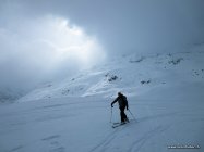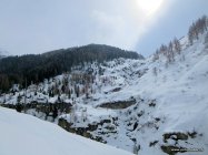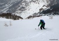 Abfahrt Richtung Goneri. Oben in den steilen Hängen schöner Pulverschnee. Unterhalb 1700 m verfahren und ruppig. Auf die passende Überquerung der Bäche achten! Nicht ganz einfach erkennbar.