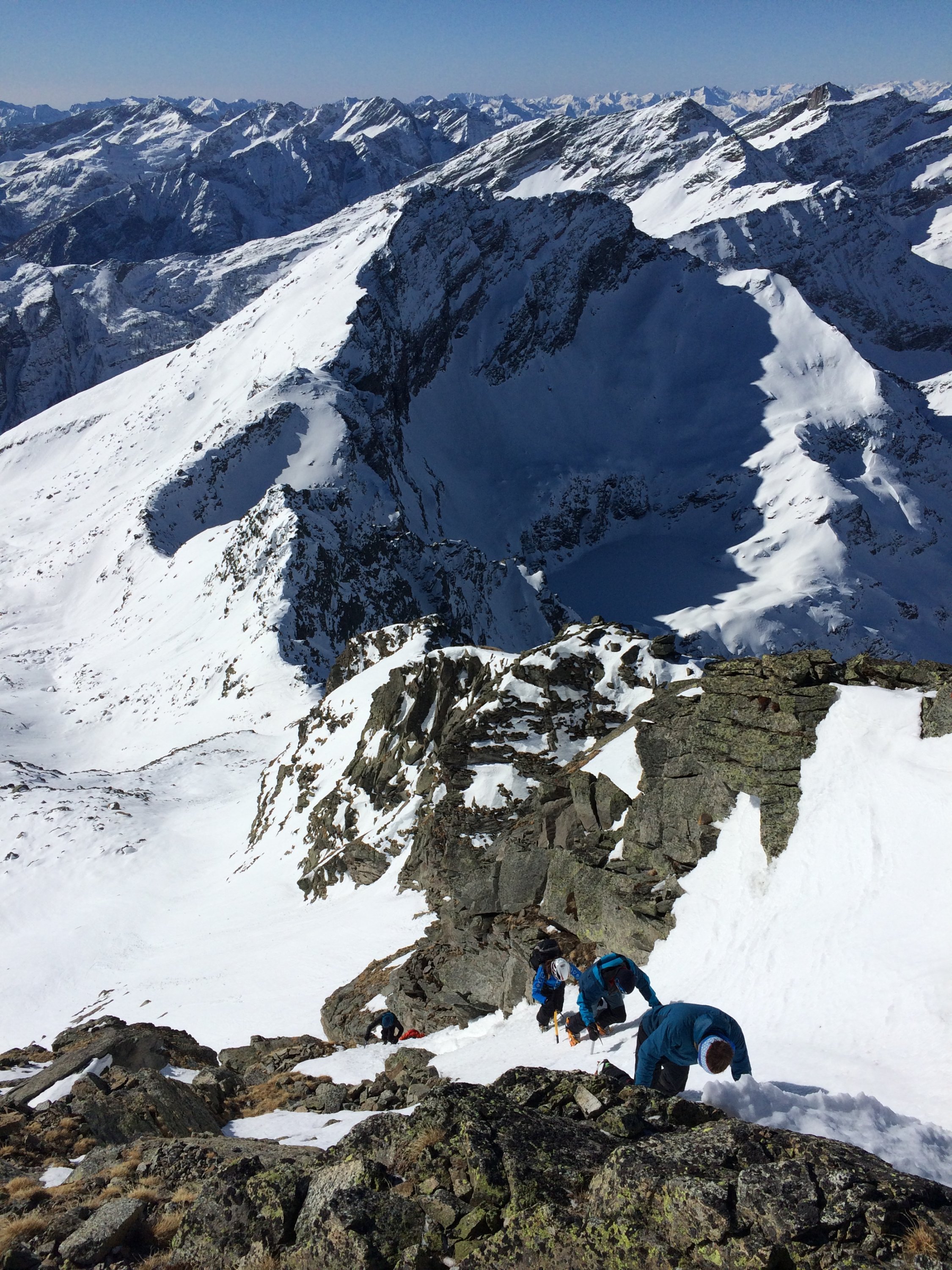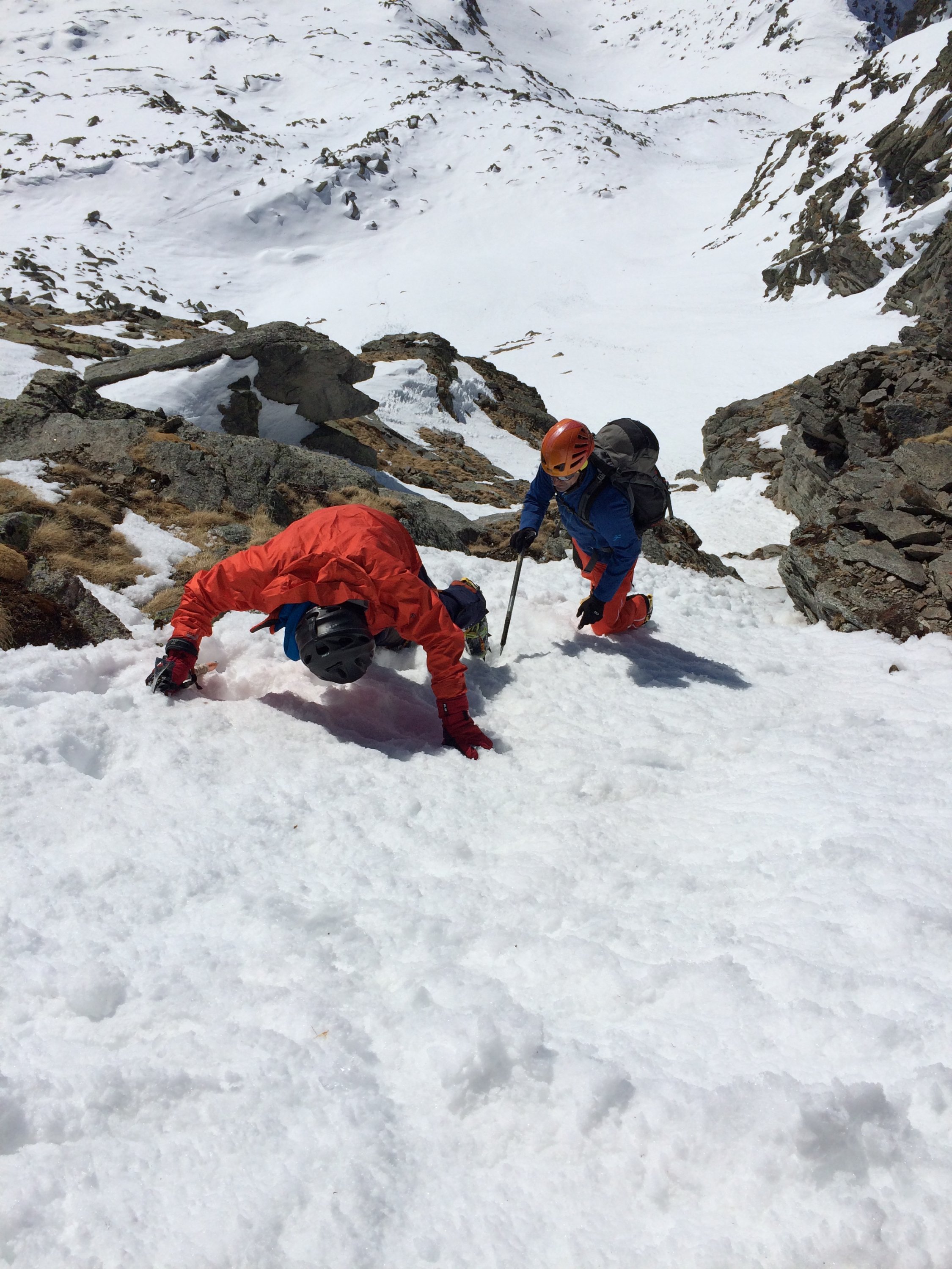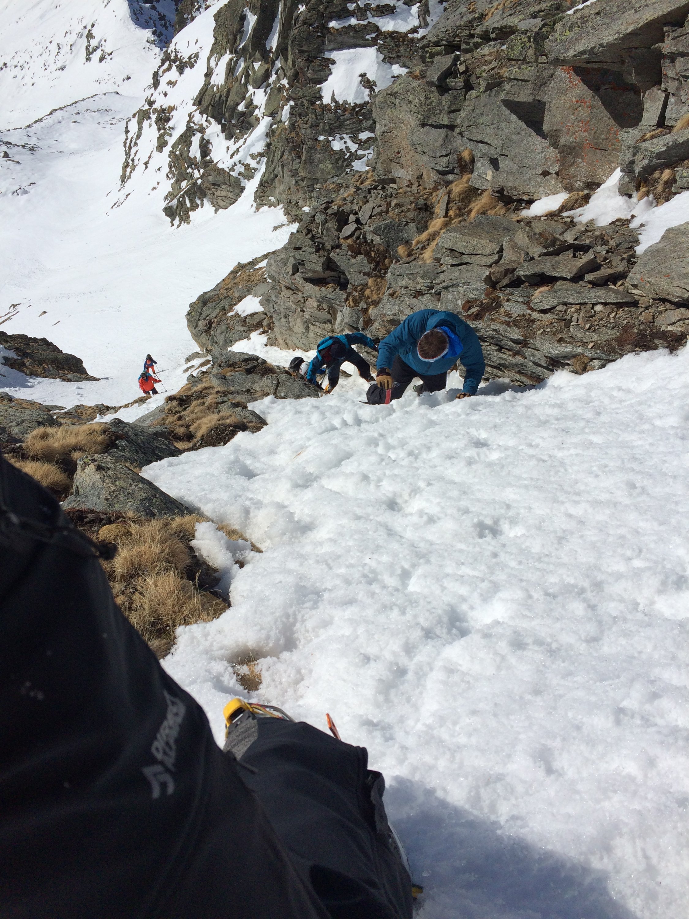 Das S-Couloir ist mit Steigeisen und Pickel gut begehbar, nur 1-2 m sind eine Eisplatte, dort kann man entlang der Felsen hinaufkraxeln. Timing, um 10 am Gipfel hat sich als sehr gut erwiesen.