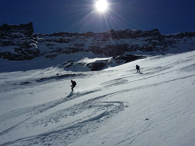 Am Morgen noch einige Nebelschwaden bis zur Alpe Moesola. Der Wind hat im coupierten Gelände ganze Arbeit geleistet und einige Wechten gebildet, die im Nebel nicht immer einfach zu erkennen waren. Ansonsten gute Bedingungen bis zum Gipfel. In der steilen Mulde nördlich des Marscholhorns fanden wir einige Abschnitte mit schönem Pulverschnee. Dank dem morgendlichen Nebel waren die Hänge bis zum Tallstafel von der direkten Sonneneinstrahlung einigermassen verschont geblieben und boten eine tragfähige Schneedecke.