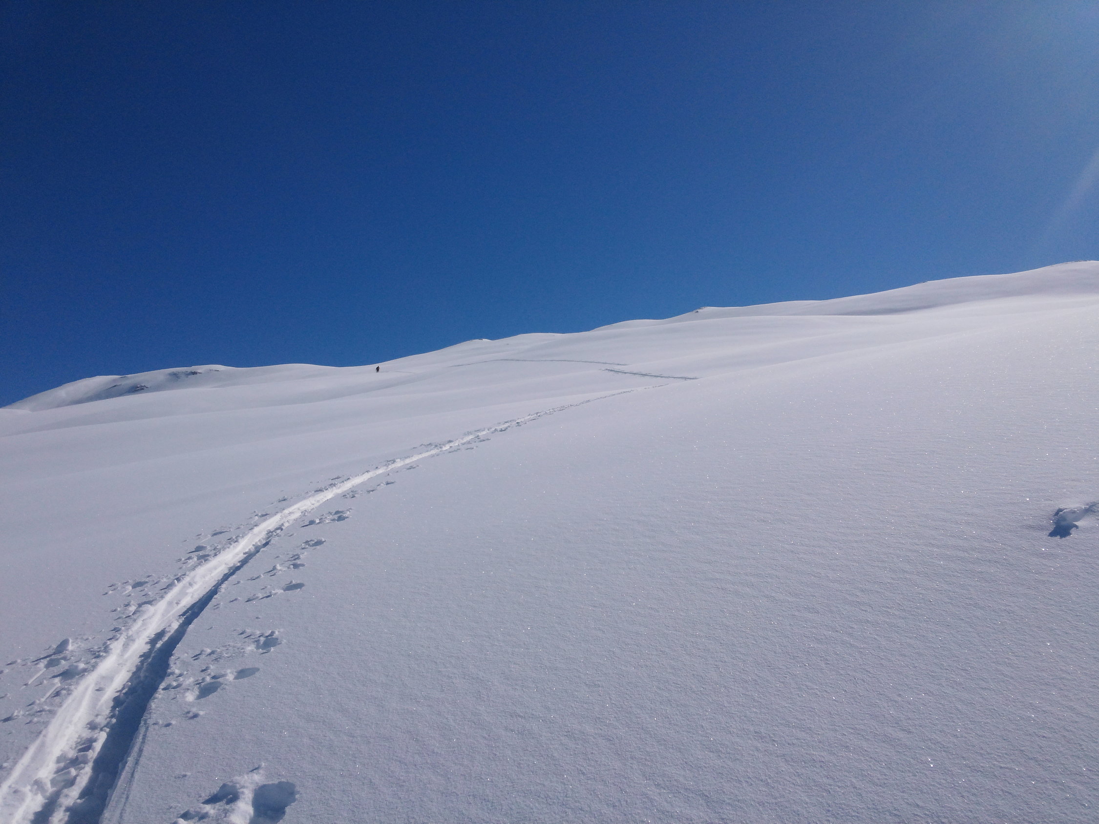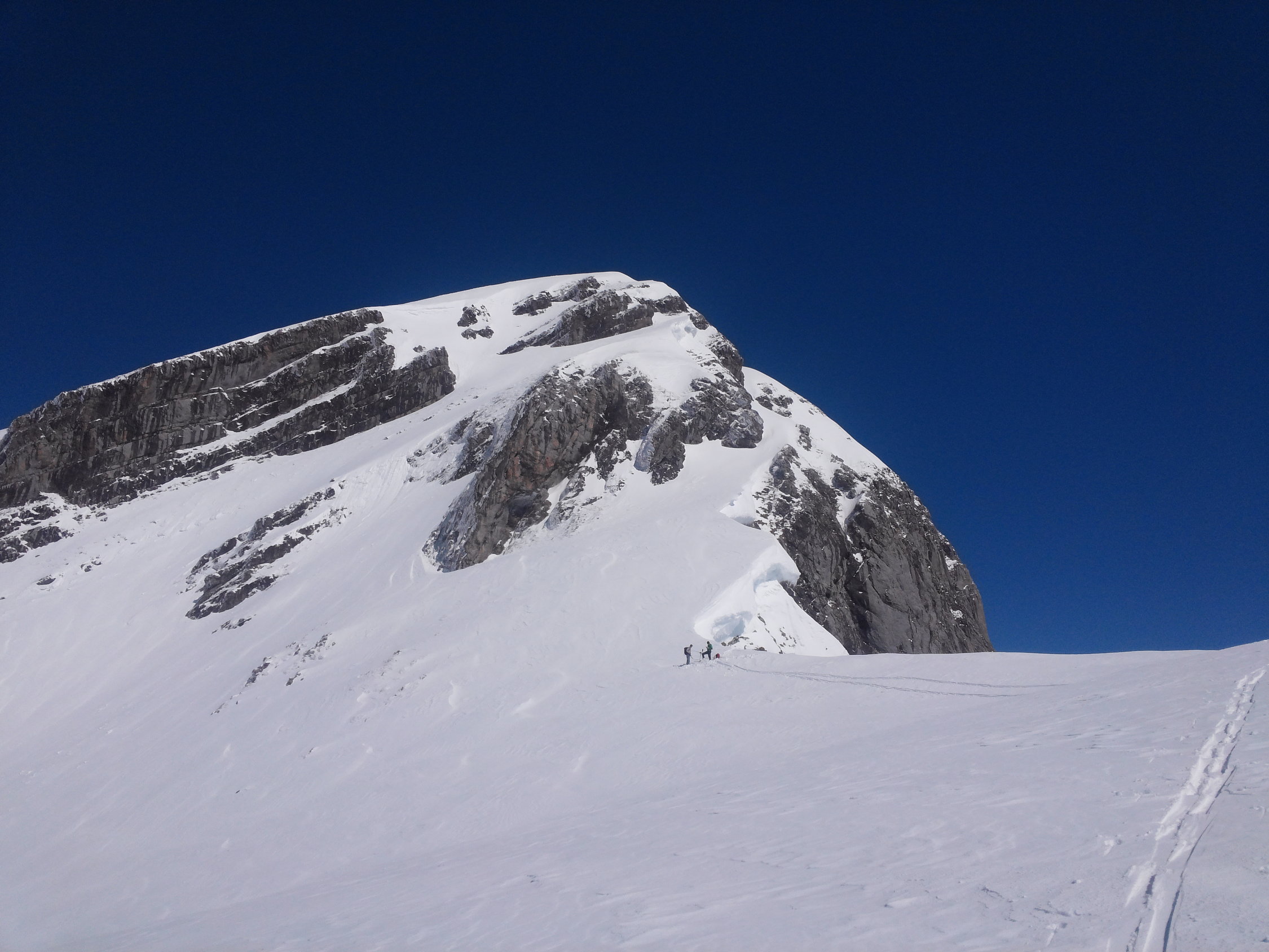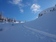 Im oberen Teil viele Wummgeräusche im flacheren Teil. Start 8 Uhr um 11.30 Uhr waren wir bei Skidepot. Wir verzichteten auf den Fussanstieg, zum einen wäre es ein ziemlich tiefes Gewühle gewesen, zum anderen wollten wir die Pulverhänge nicht nur neu spuren, sondern auch noch in der Abfahrt geniessen.