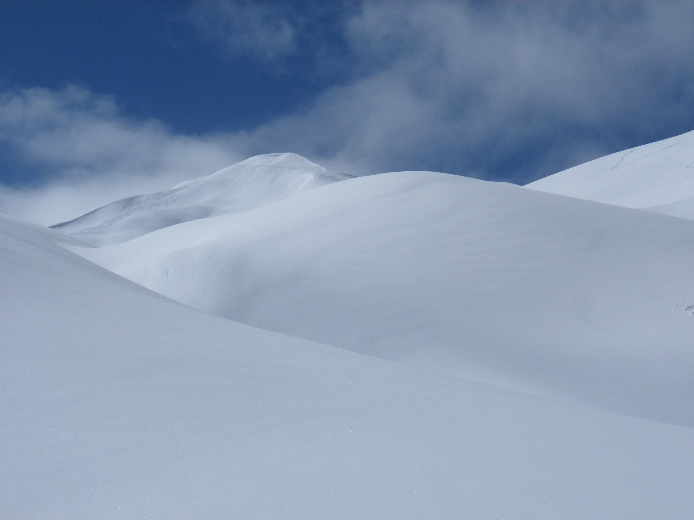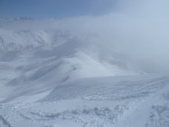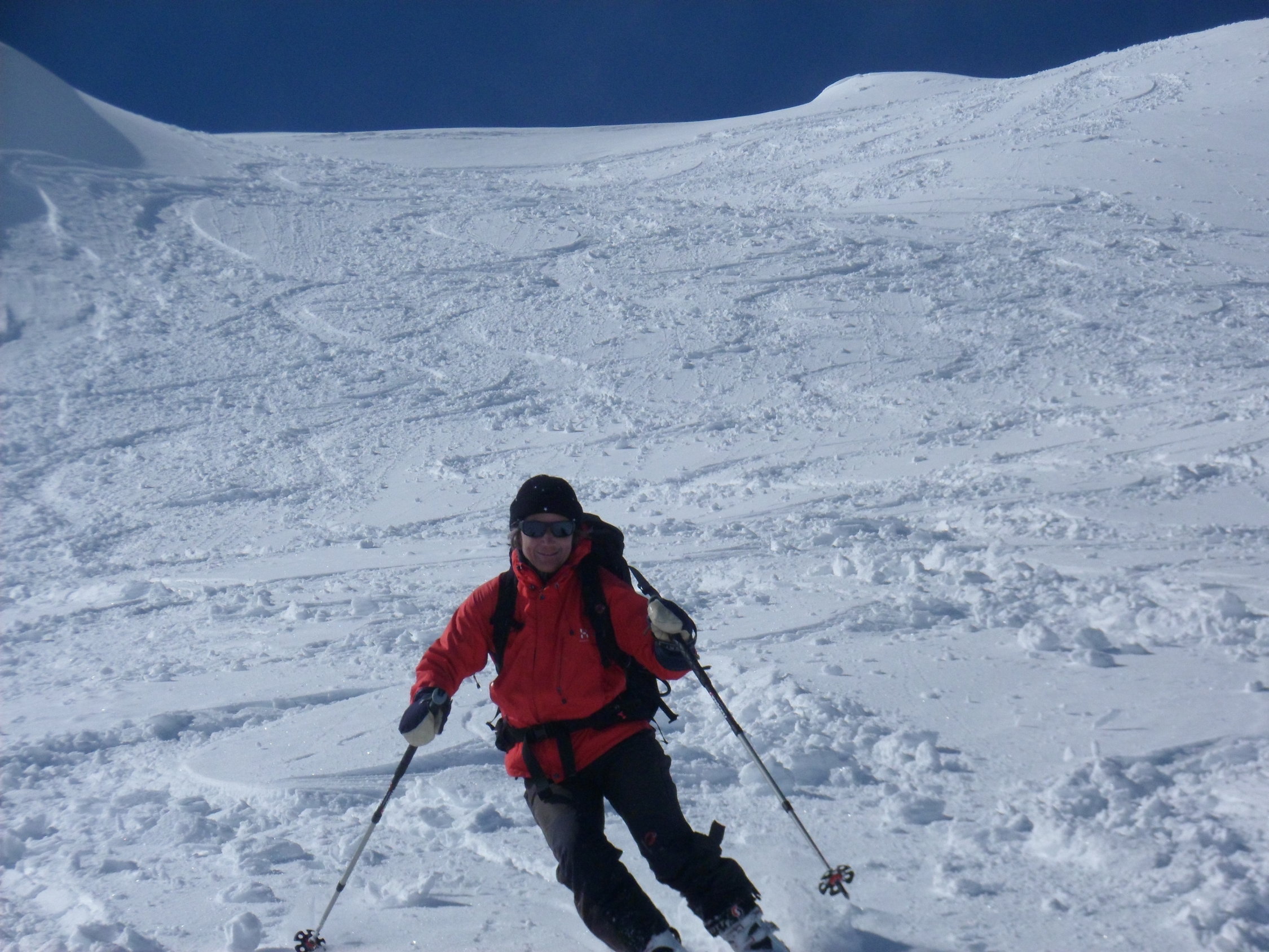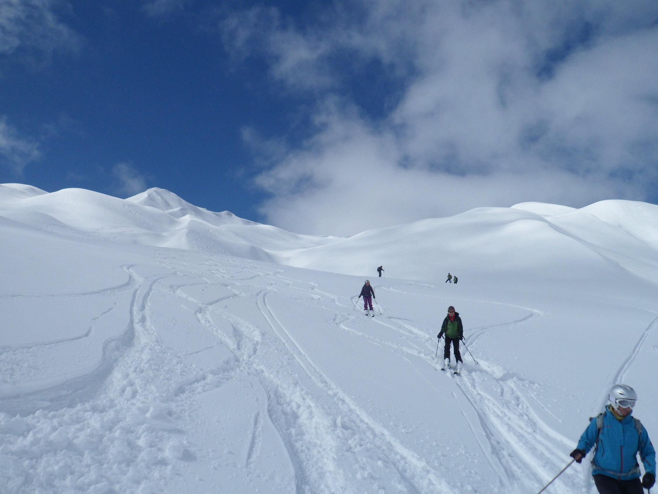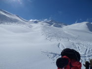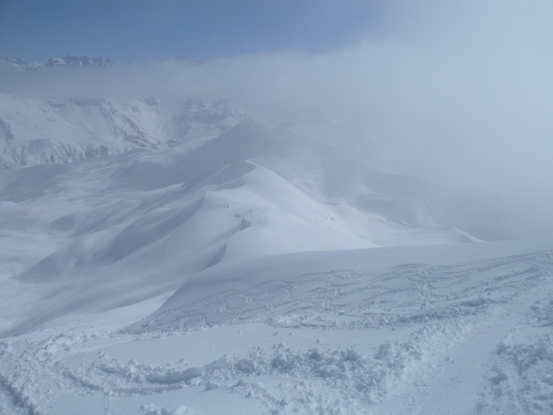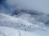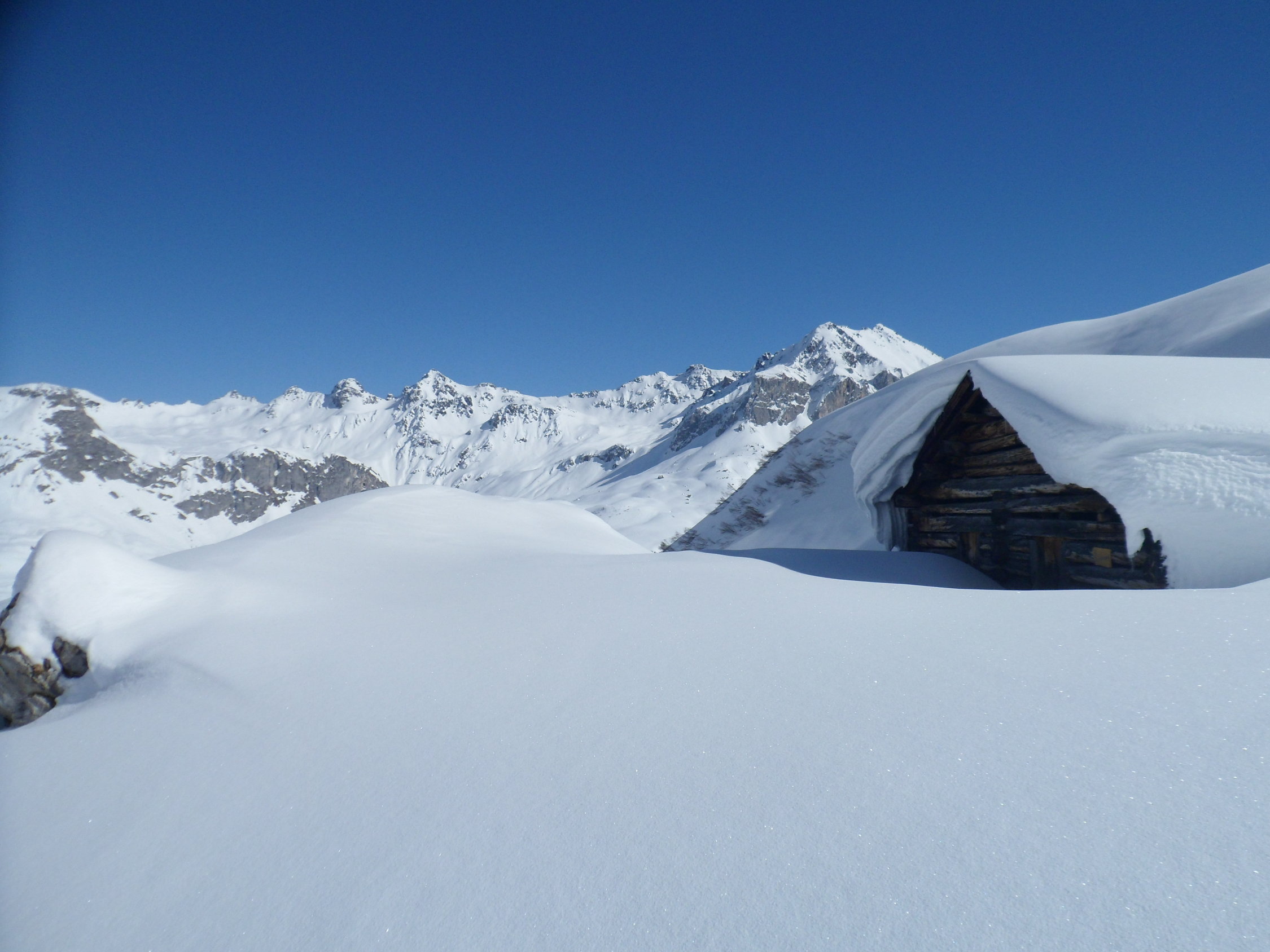10 bis 20 cm Neuschnee, im Laufe des Tages überall, wo Sonne eingestrahlt hat, wieder mit dem Altschnee verbunden. Osthänge gegen Abend schon leicht angefrohrener Schmelzdeckel.