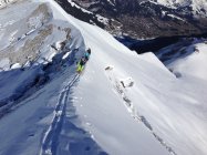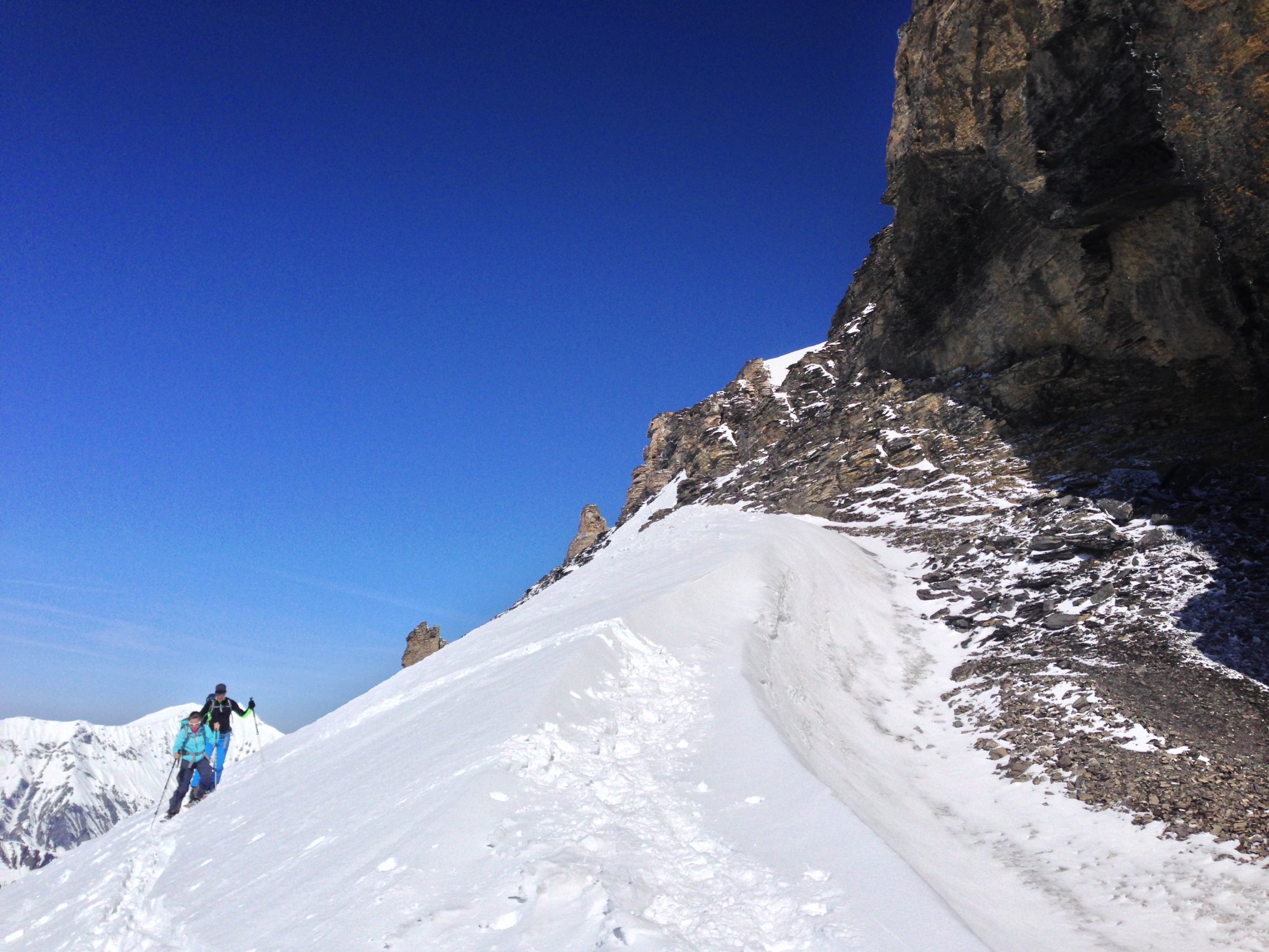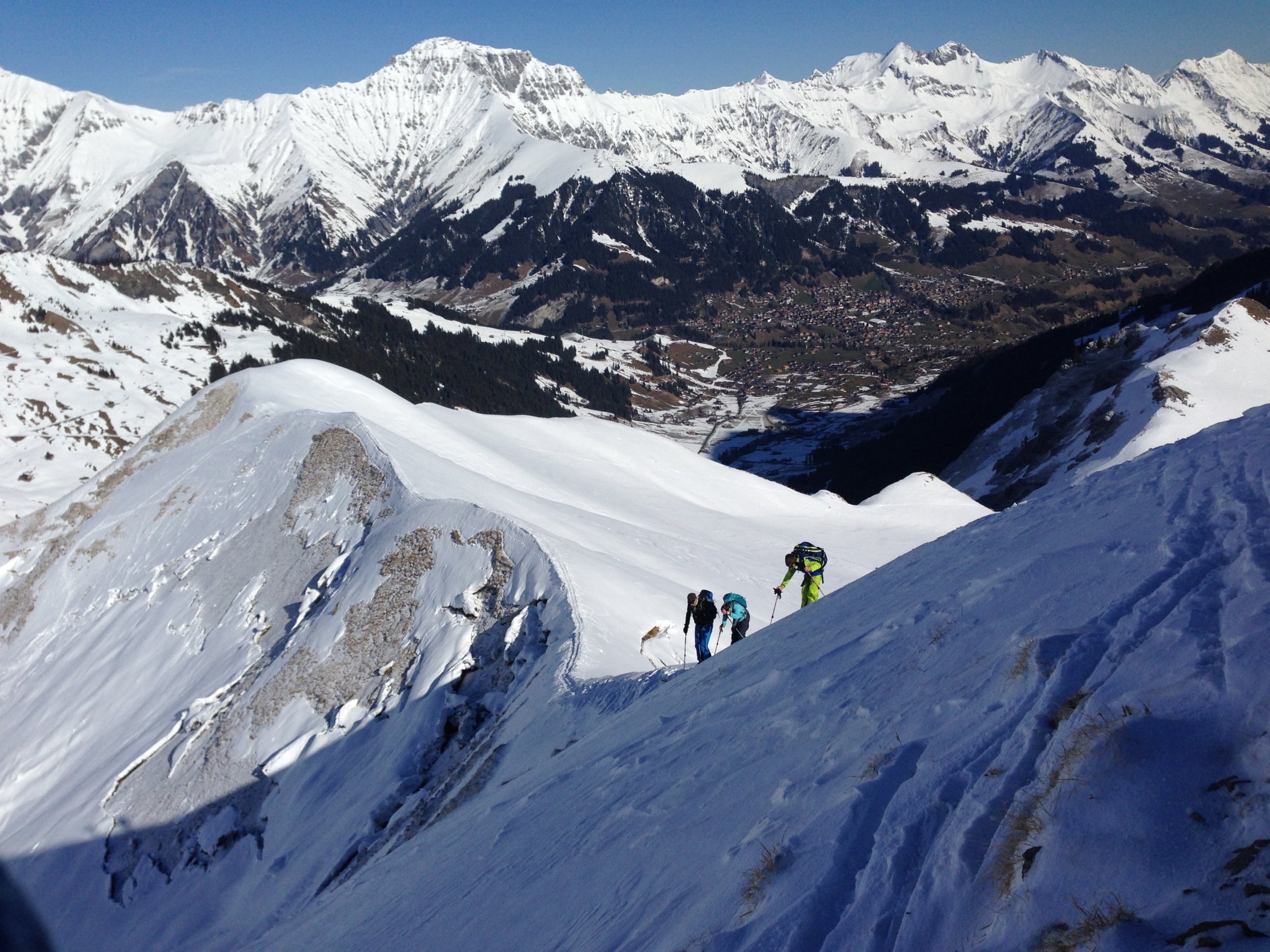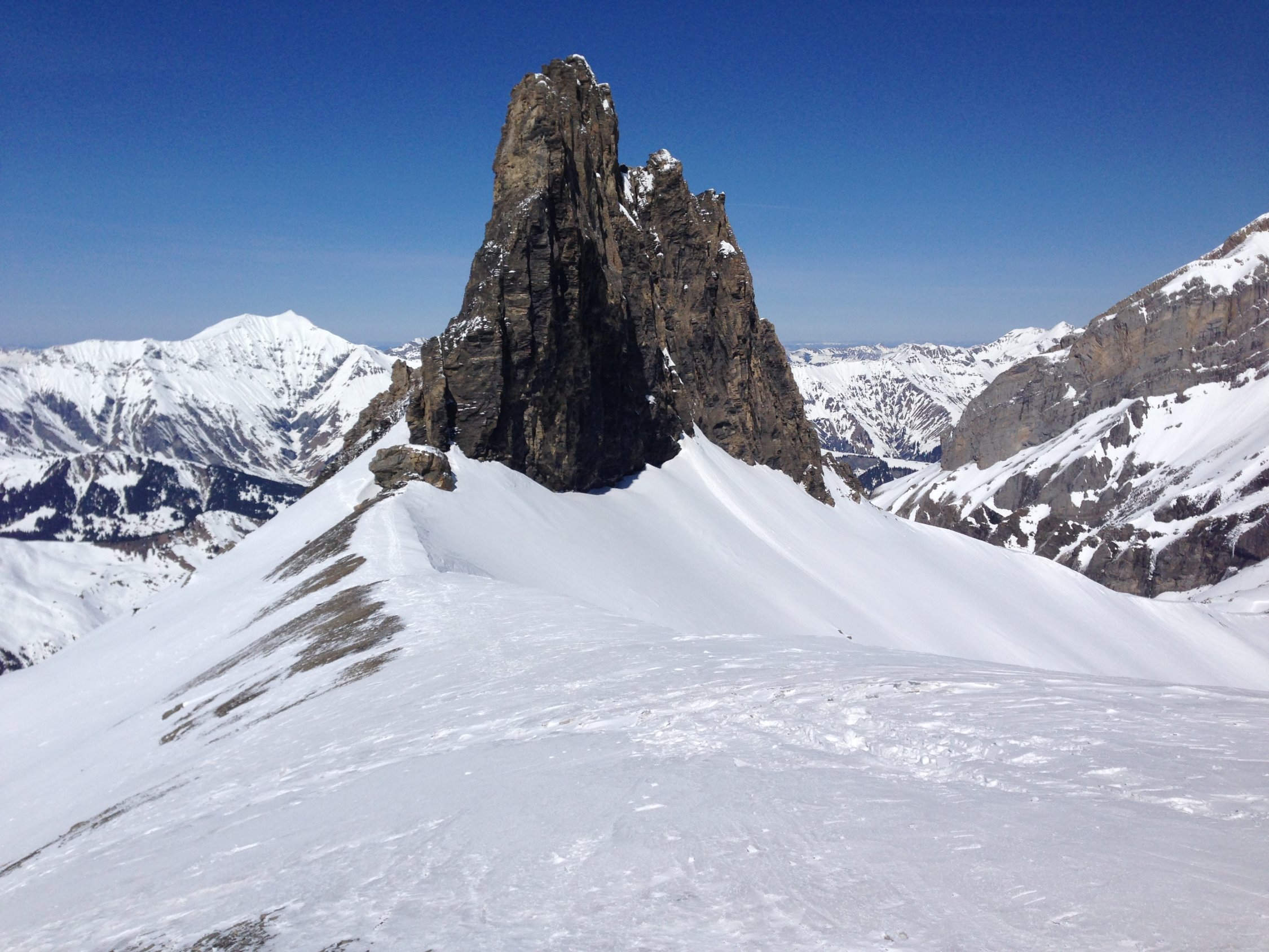Herrliches Frühlingsskitourenwetter, mit der ersten Gondel um 08.15 (nach der Early Bird) auff die frisch verschneite Engstligenalp gefahren. Bei diesen super Verhältnissen wollten die meisten auf den Grossstrubel. Unsere Route über Aertelengrat hat zuerst niemand gemacht. Herrlicher Aufstieg über den gut gefrorenen Schnee auf den Grat. Dabei mussten einige gefrorene Nassschneelawinen traversiert werden. Der erste Teil verläuft über einem schmalen Grat, der in der Mitte kurz ansteigt. Nach dieser Schlüsselstelle geht es breiter weiter. Unter dem Tschingellochtighorn wird die Traversierung dann nochmals steil, bevor es zum Skigipfel geht. Auch mit der Tagesereärmung haben wir keine Rutsche gesehen. Am Frühstücksplatz herrschte etwas Stau. Wir waren bis auf zwei Snowboarder und später zwei weitere Türeler ganz alleine am Berg. Der Scnee war tragbar mit Pulver gut zu fahren. Eine schöne Ostertour abseits der stark begangenen Touren.