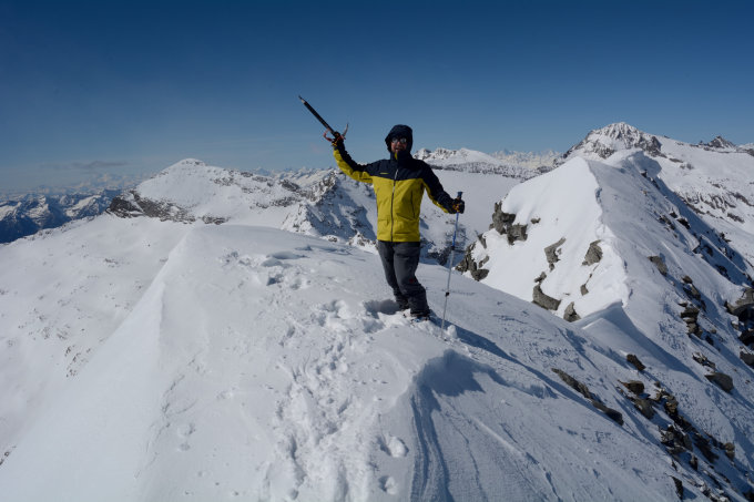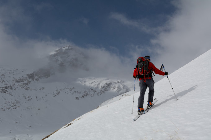 Bei der Abfahrt von zuhause noch Regen, im Gebiet zwischen Rheinwald und San Bernardino schon früh morgens Löcher in der Wolken- und Nebeldeckel. Gipfel hielt sich sehr lange hinter Nebelvorhang. Aber gerade rechtzeitig im Zustieg zum Gipfelcouloir zeigte sich das Zapporthorn vor einem tief blauen Himmel. In der vergangenen Nacht ca. 10 cm Schnee gefallen, was sich positiv auf die Verhältnisse auswirkte. Die alten Spuren waren verschwunden und auf der Abfahrt gab es im oberen Abschnitt Powder der Klasse 1, weiter unten dann eher schweren Schnee der Klasse 3, aber gut fahrbar. Alles in allem dynamische Stimmung mit Nebel, Sonne und Wolken. Einfach nur blauer Himmel kann ja auch langweilig sein. Ich habe noch selten um diese Jahreszeit so wenig Schnee auf der Passstrasse gesehen, aber dieser Winter ist halt ein wenig - anders...