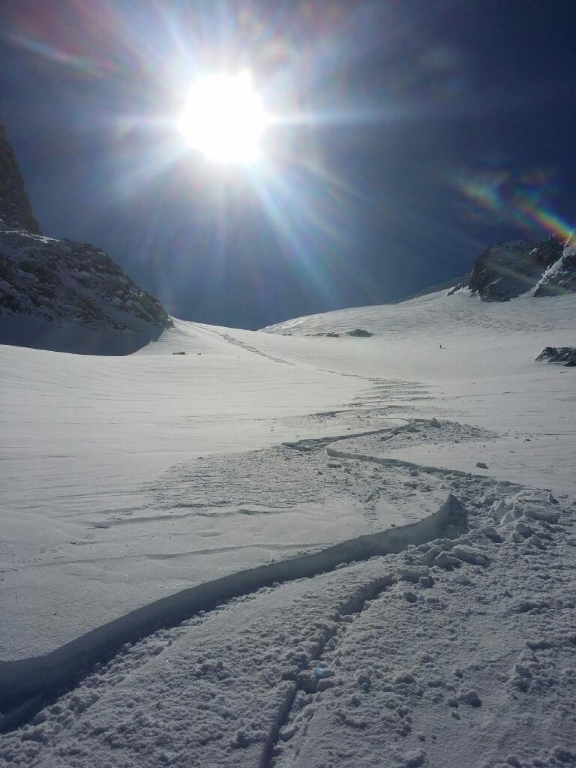 Abfahrt über den Staldenfirn mit Top-Verhältnissen. Einfahrt natürlich hart, aber kein Eis. Traverse in Richtung Chli Oberälpler pickelhart, nur mit sehr guten Kanten noch fahrbar.