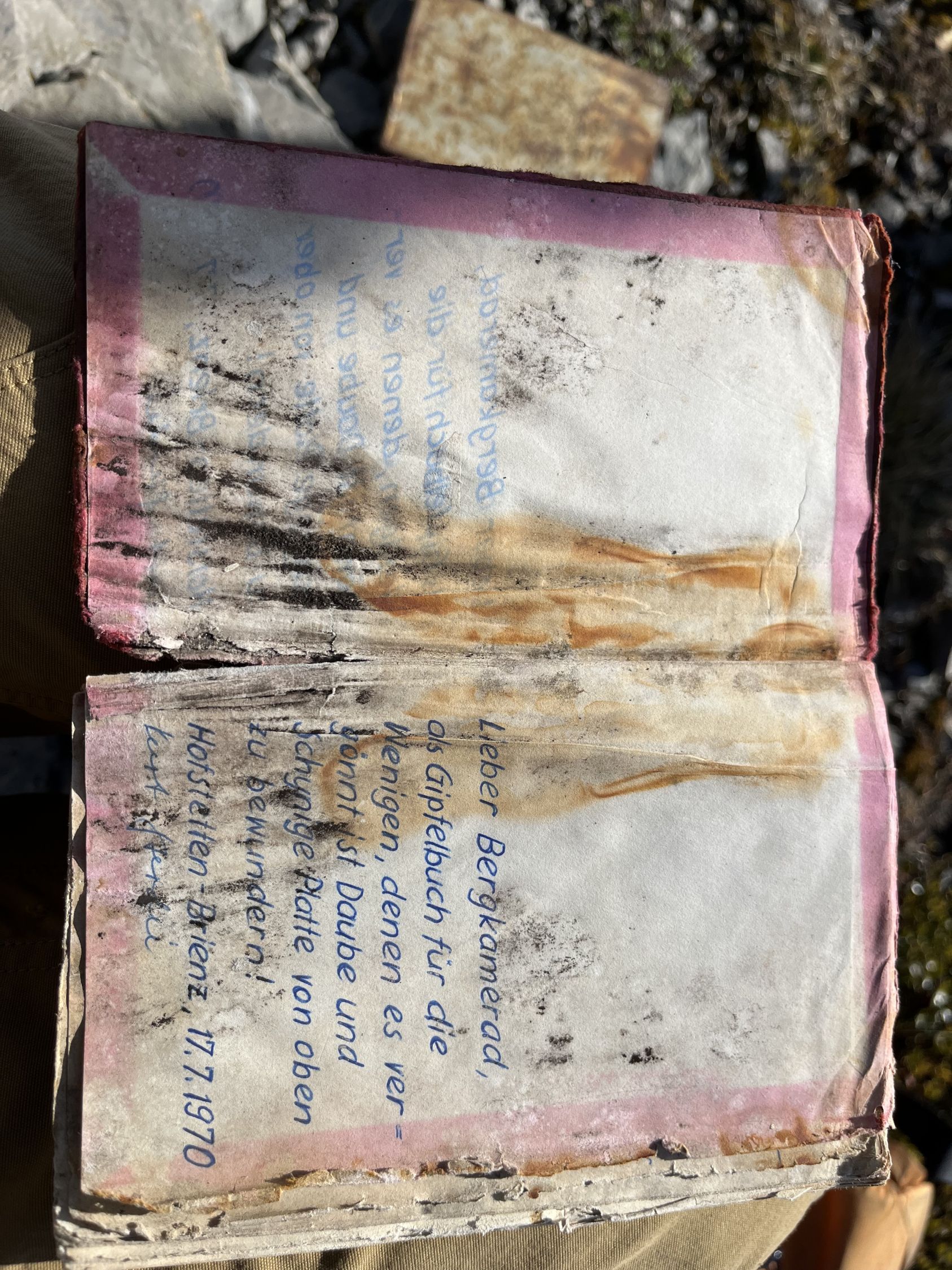 Das Gipfebuch ist von 1970 und hat noch viel Platz. In den letzten Jahren haben sich nur sehr wenige Besucher eingetragen.