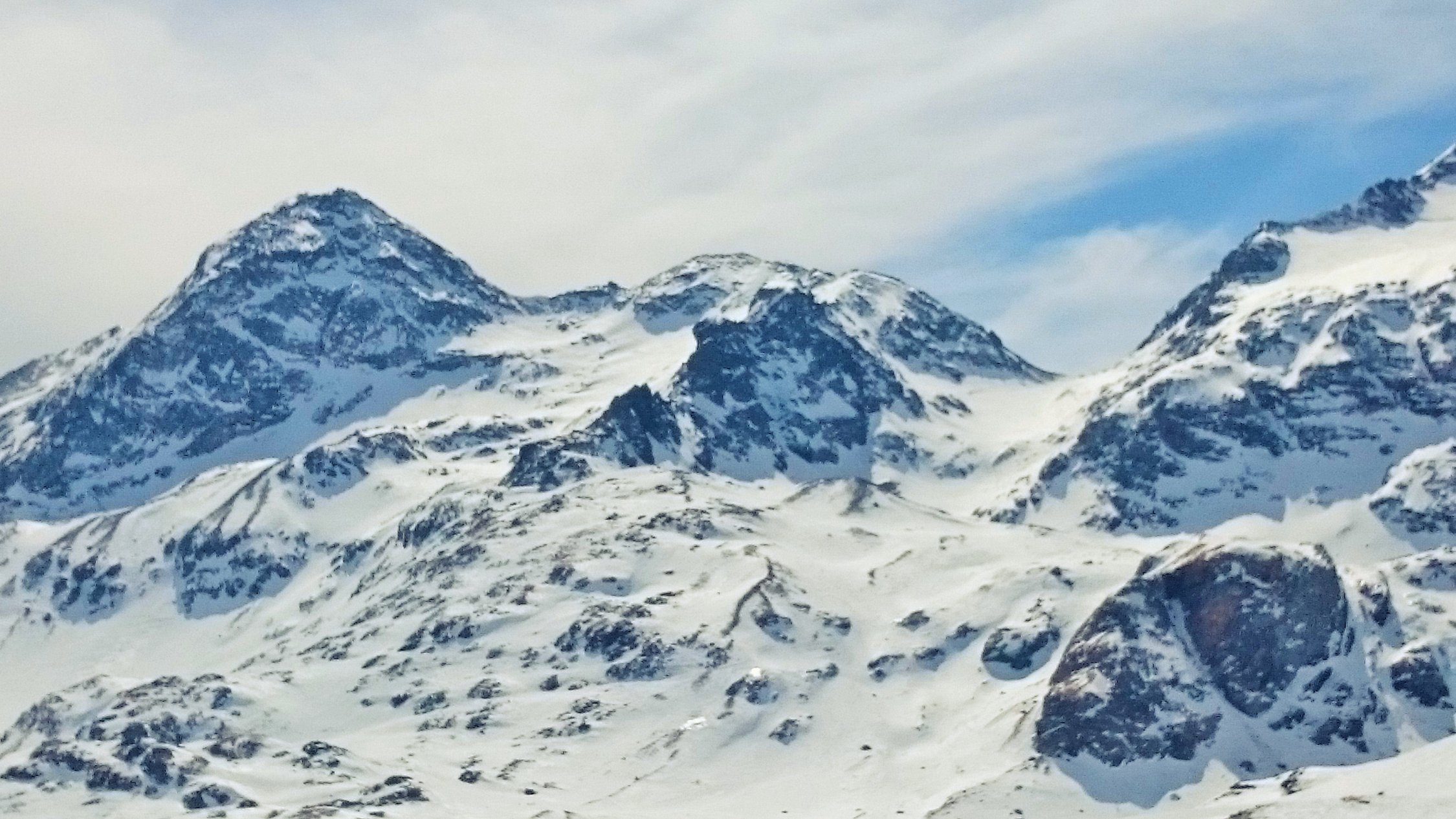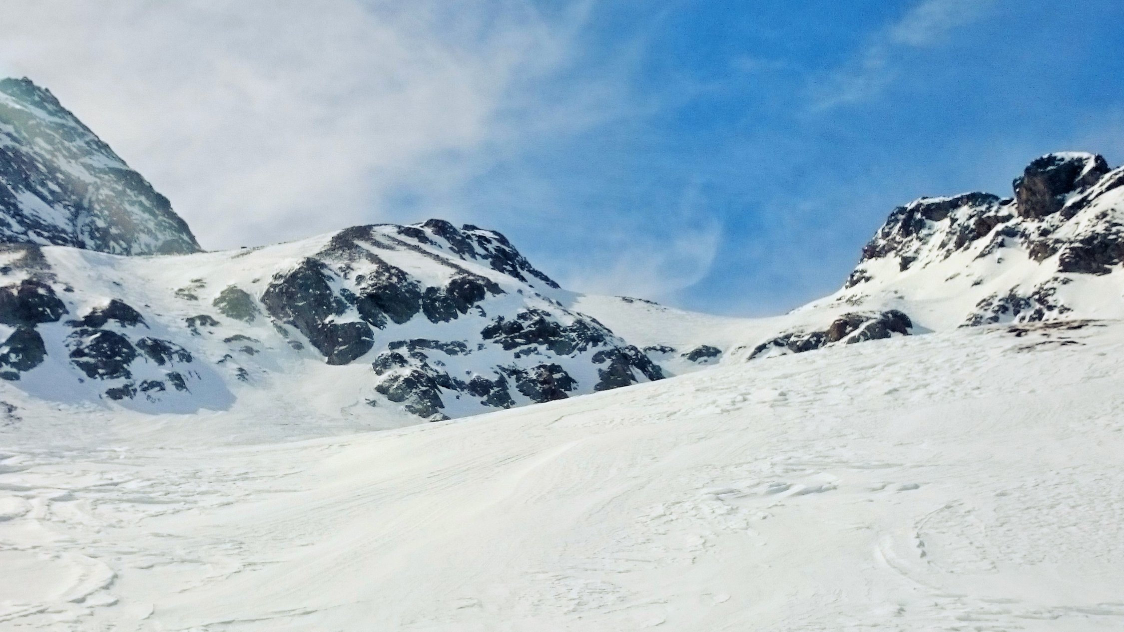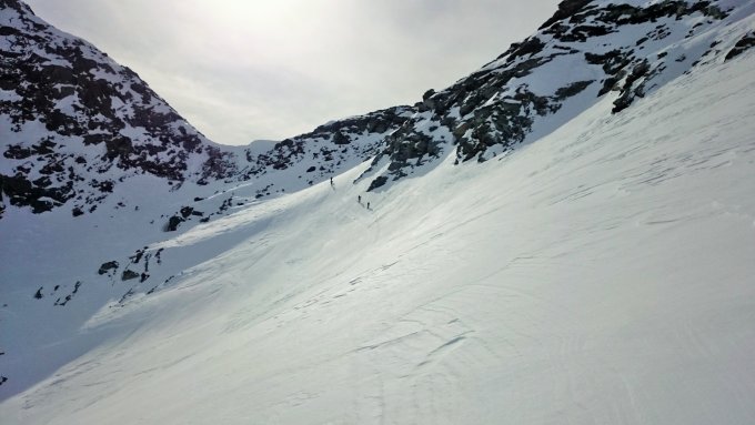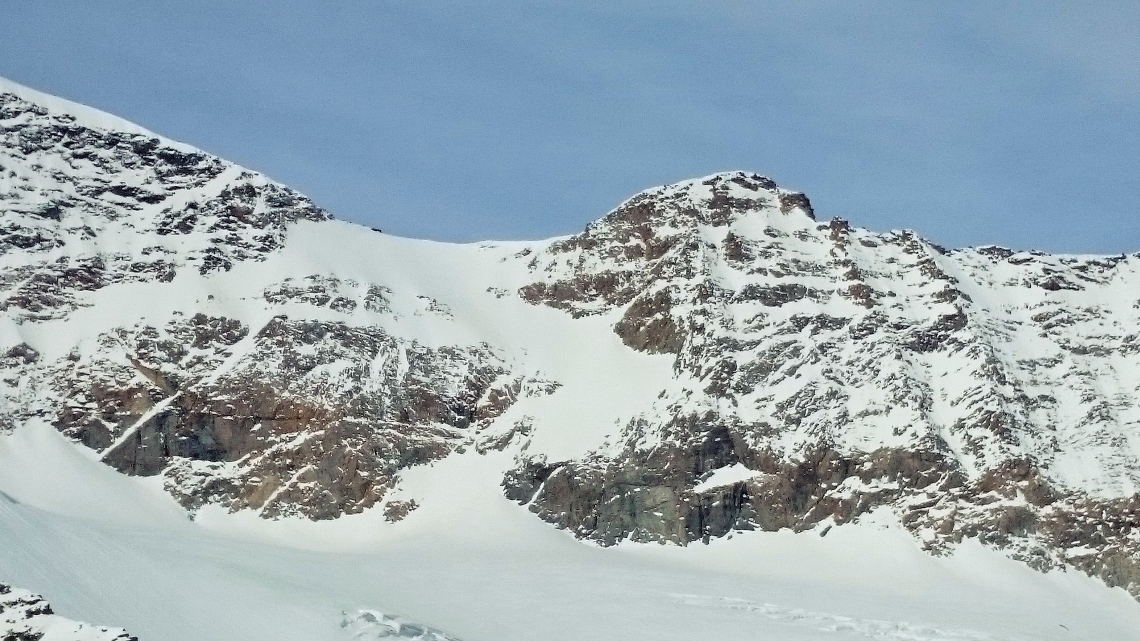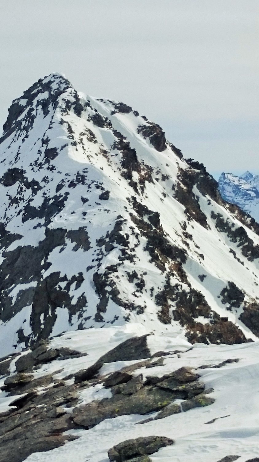 Meistens tragender Firn, zum Teil windgepresster Schnee und Bruchharst, kein Pulverschnee. Mit Abfahrt um 11 Uhr wurde der Firn nicht weich. Der Sattel zum Hauptgipfel ist nur zu Fuss möglich. Der Gipfelaufbau hat sehr wenig Trittschnee, Verhältnisse sind nicht günstig.