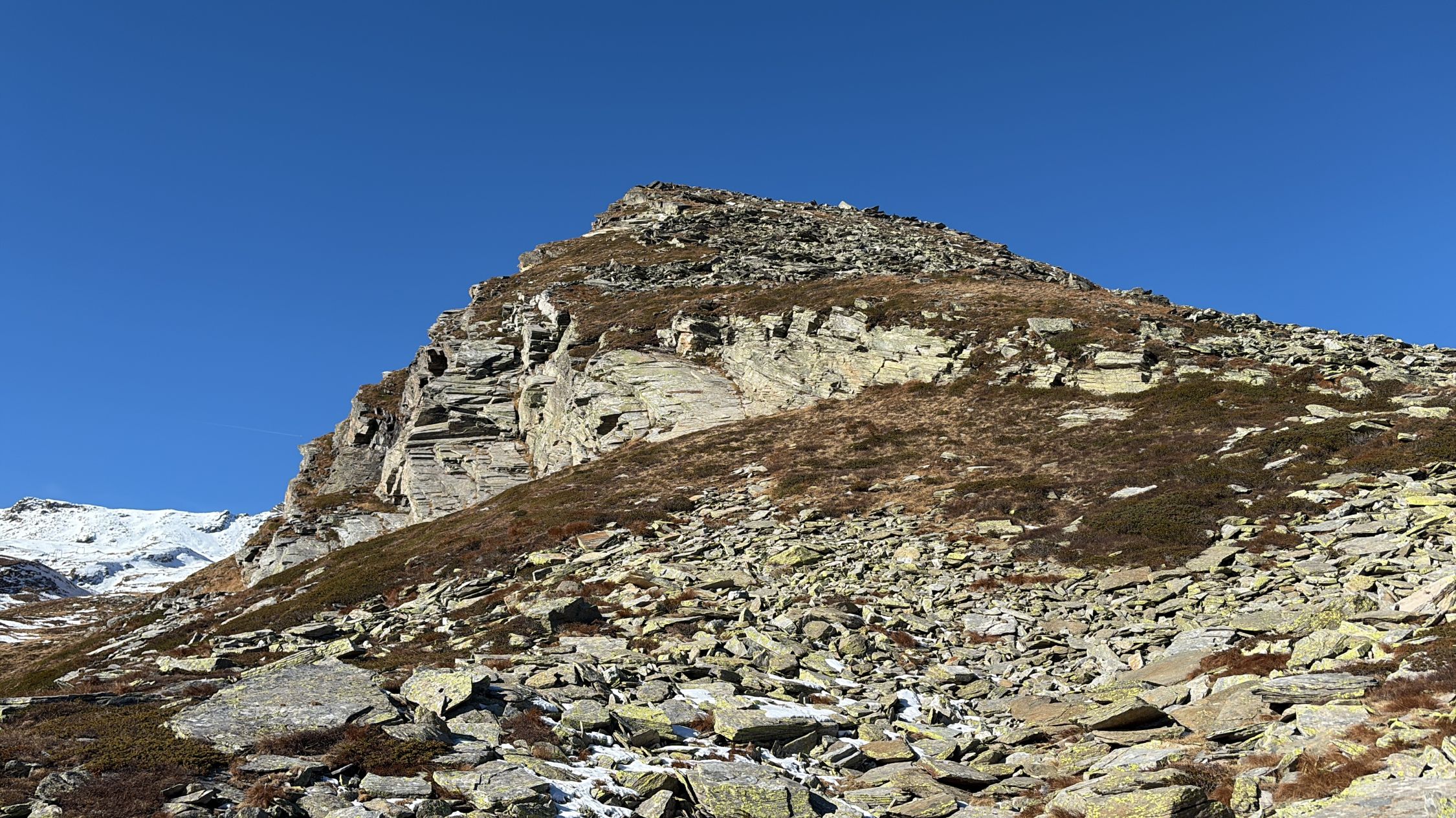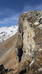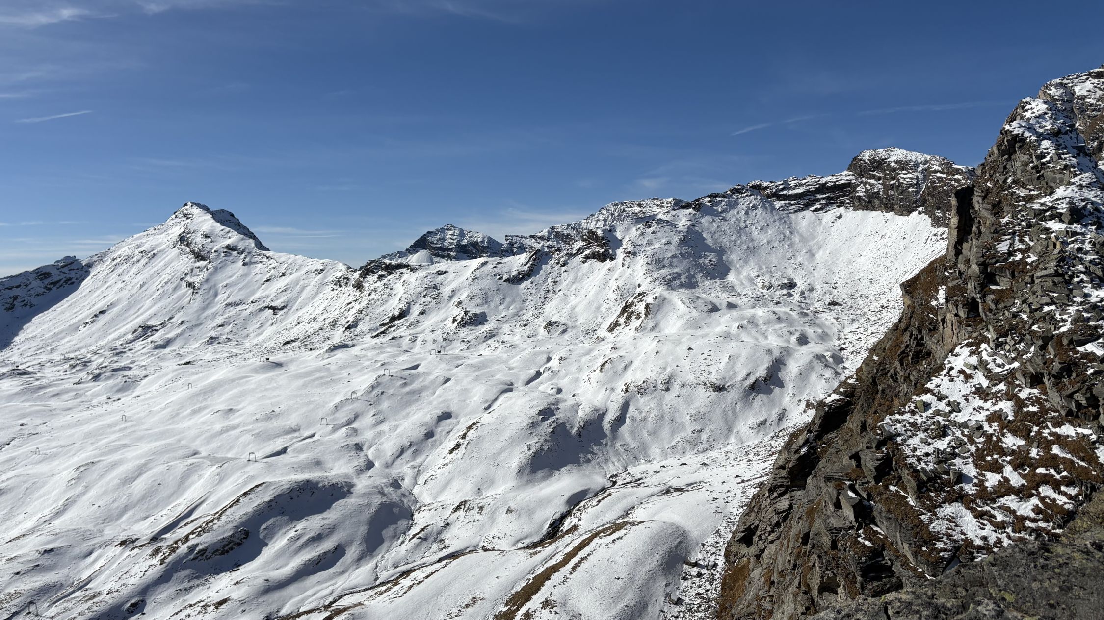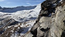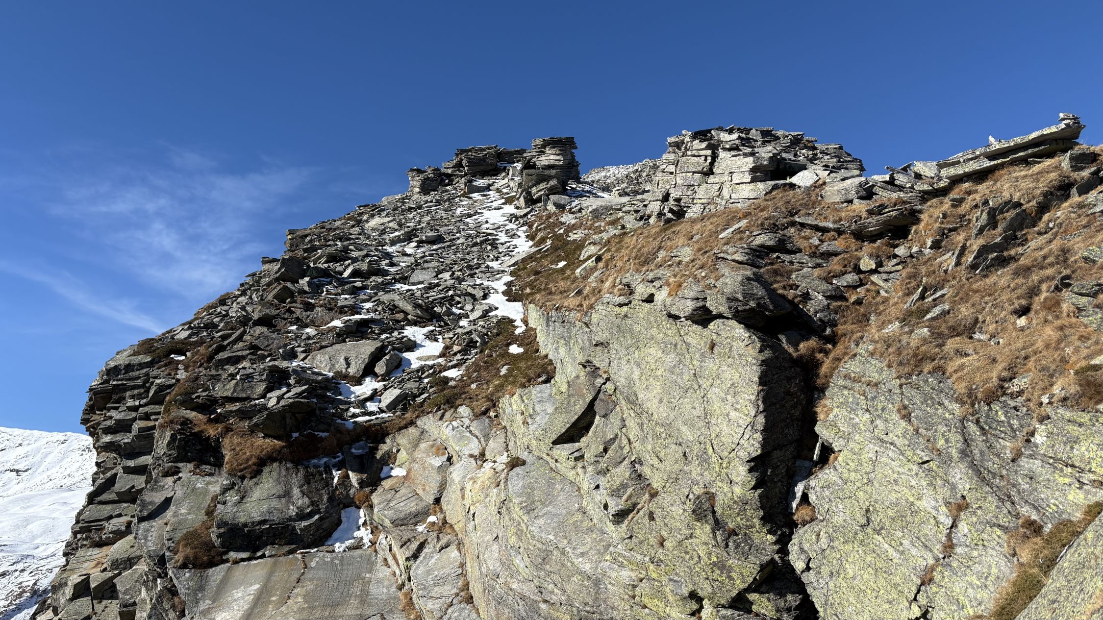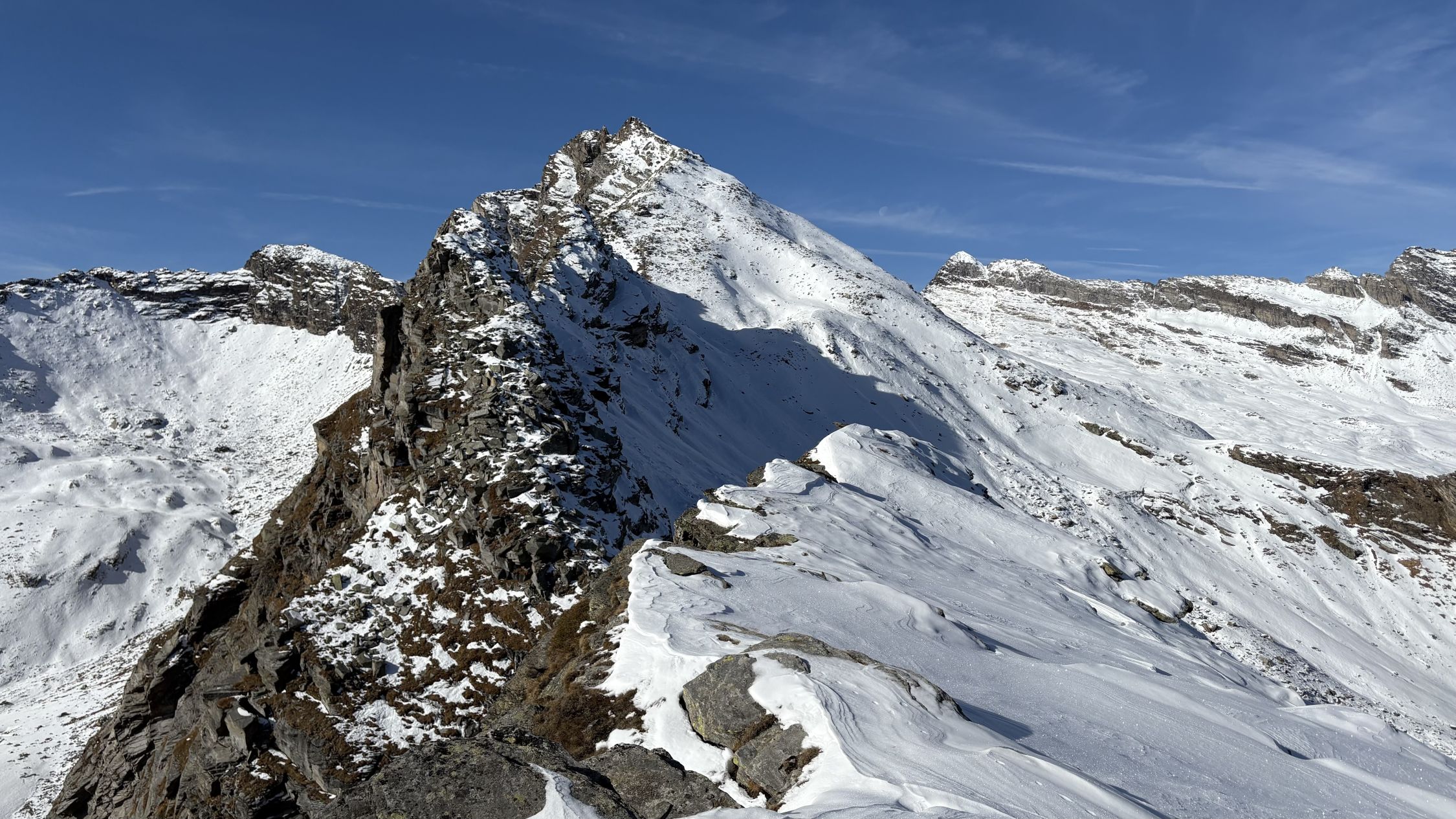 Der Weiterweg bis auf den Piz de Mucia sieht sehr herausfordernd aus und wäre ohne Schnee eine spannende Fortsetzung.
