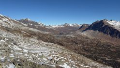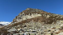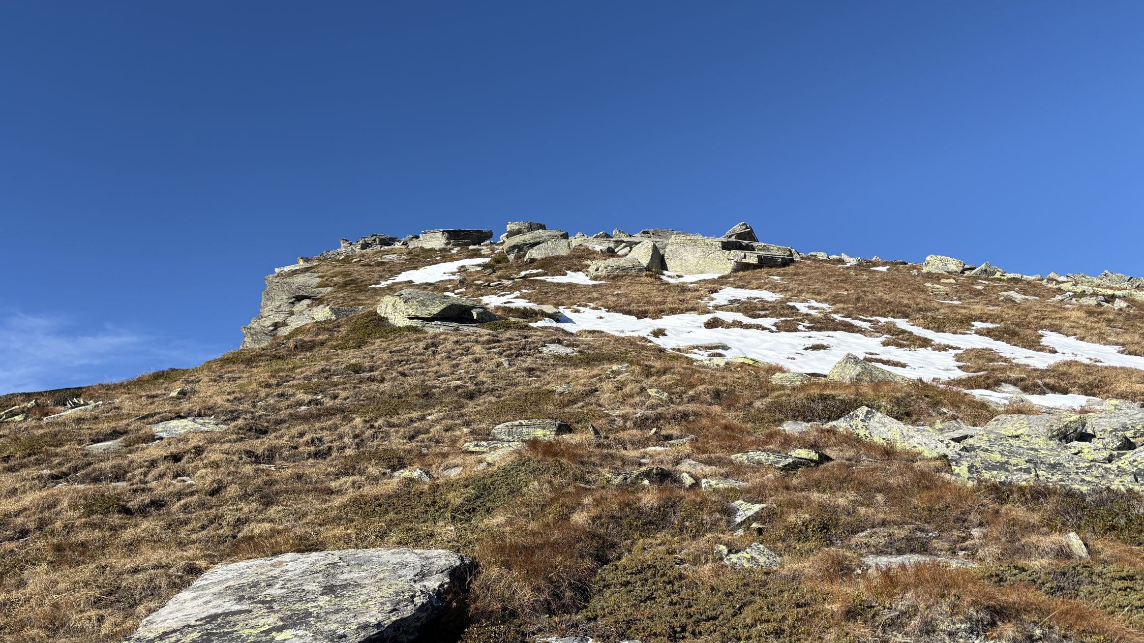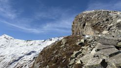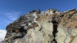 Bis auf die Höhe 2300 hatte es an der Ostseite kaum Schnee. Danach musste man sich hart an der südlichen Gratkante entlangmogeln, Der Schnee in den nördlichen Passagen wäre sehr hinderlich gewesen, da man die Löcher zwischen den Riesenplatten nicht sehen konnte.