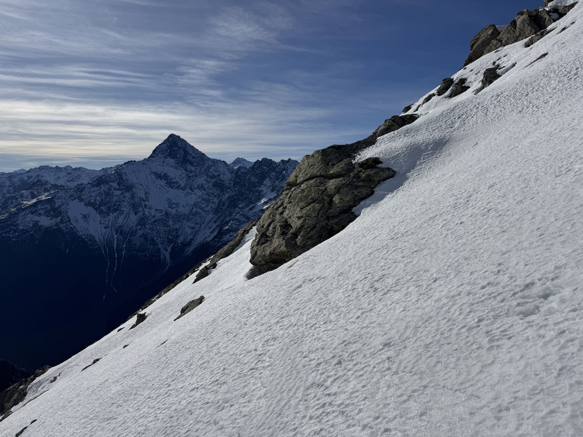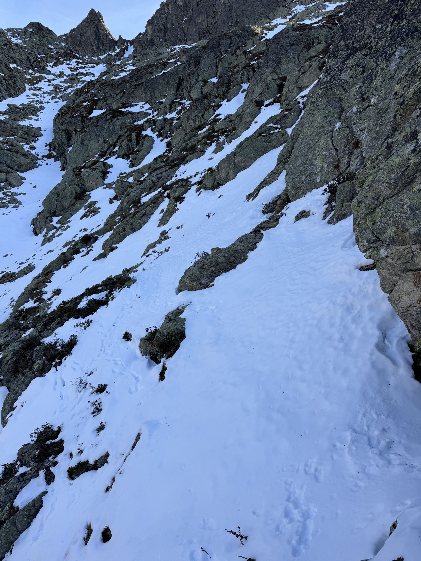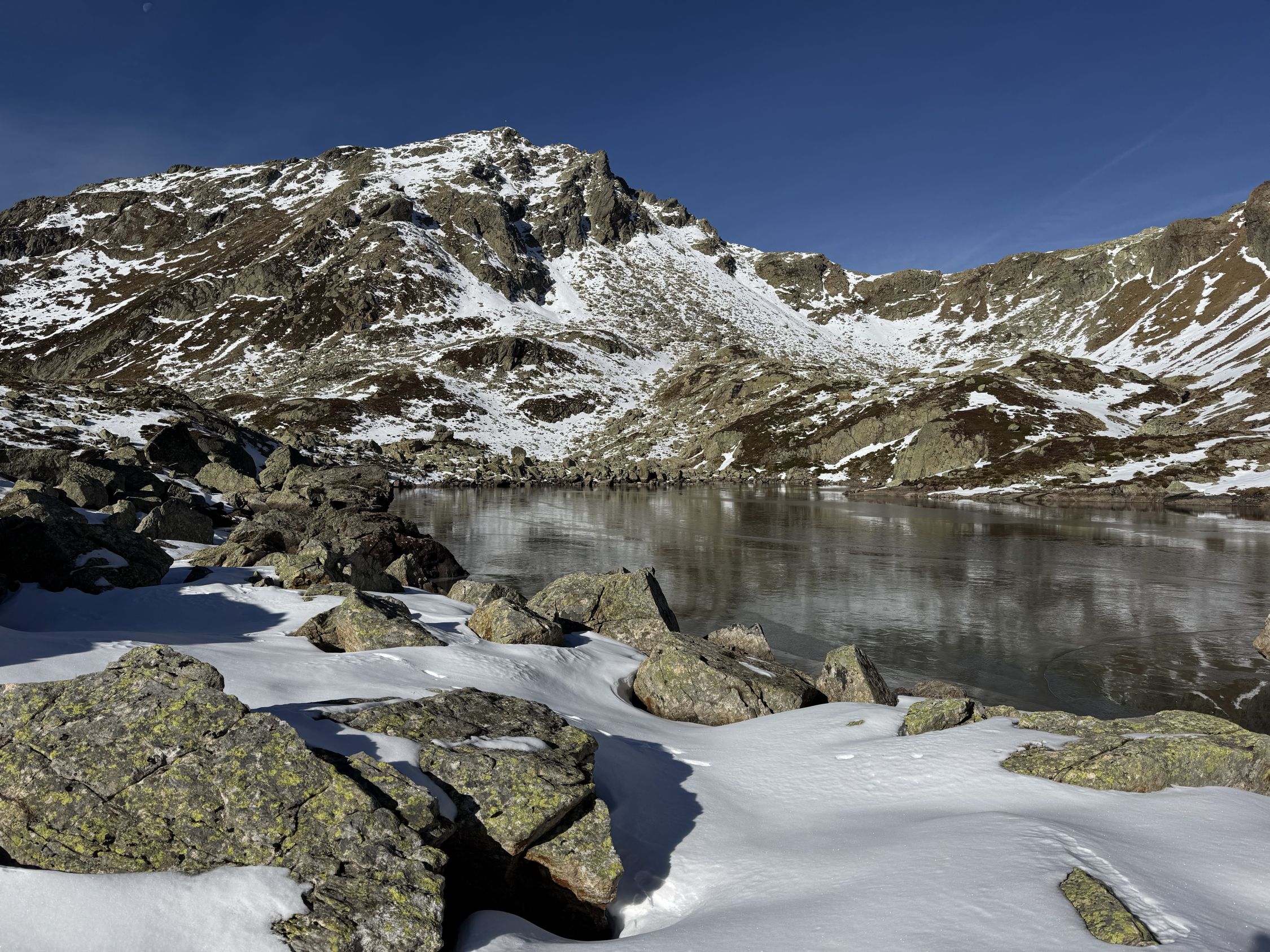 Ab 2100 m schon recht winterlich, war aber noch gut ohne Schneeschuhe zu machen. Der Schnee war am Vormittag meistens tragend, und ich bin nur wenige Male zwischen den Blöcken eingesunken.
