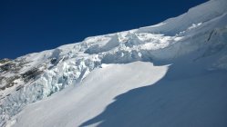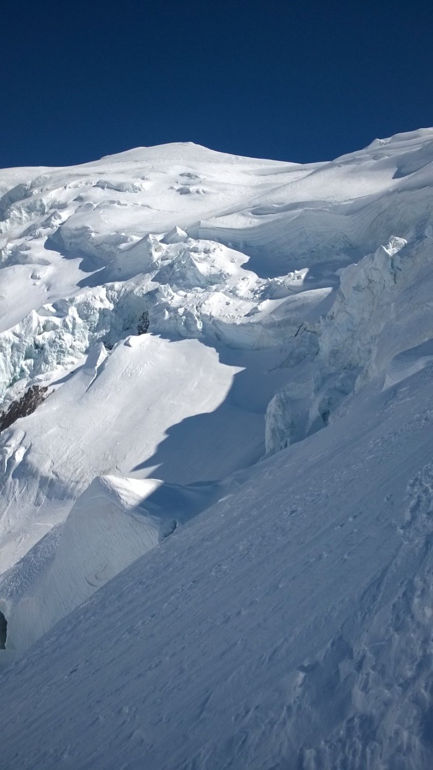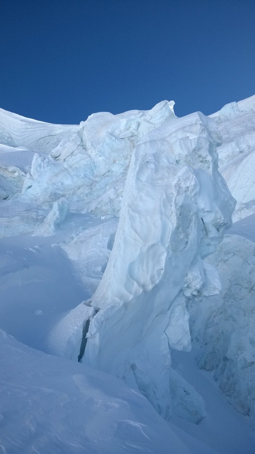 Abfahrt: windgepresster, schwieriger Schnee. Der Gletscher ist sehr imposant - und nicht ungefährlich.