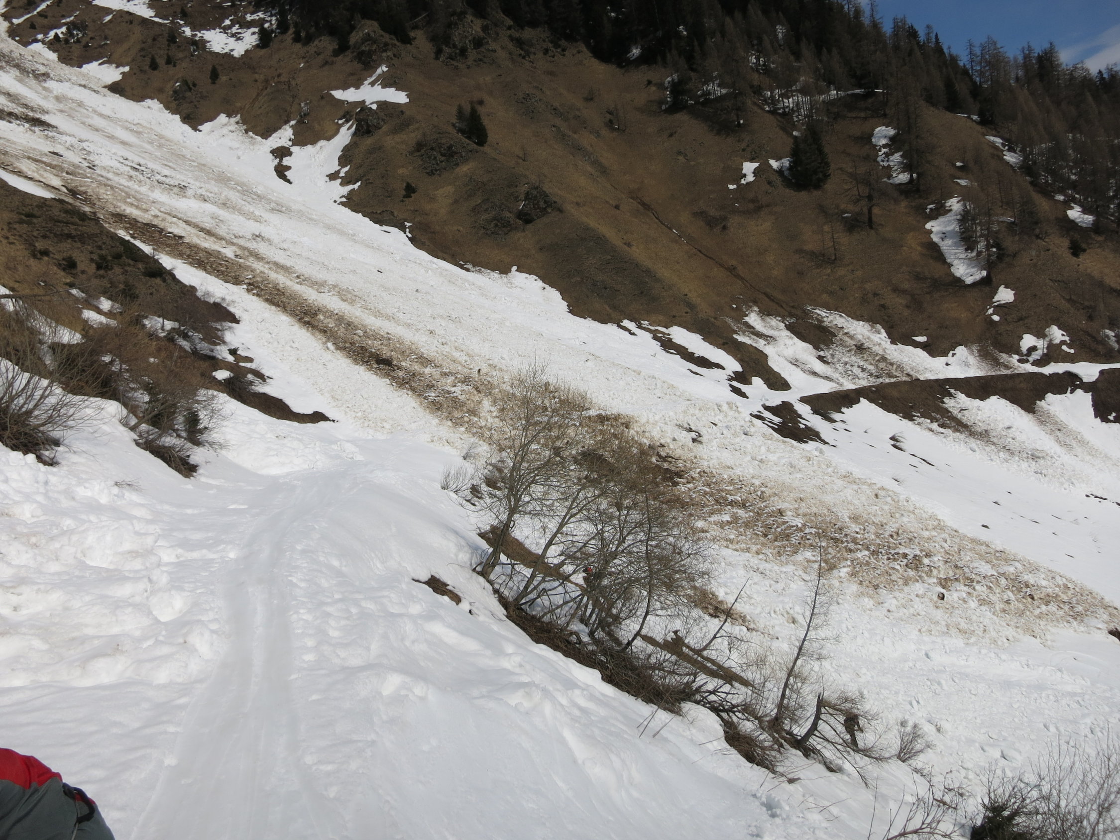 Rutsche im Bächital und eine grosse ältere Lawine über der Forststrasse kurz vorm Dorf.