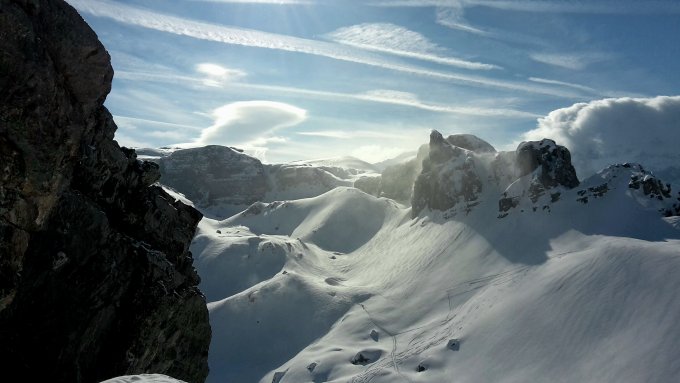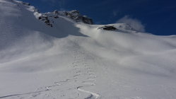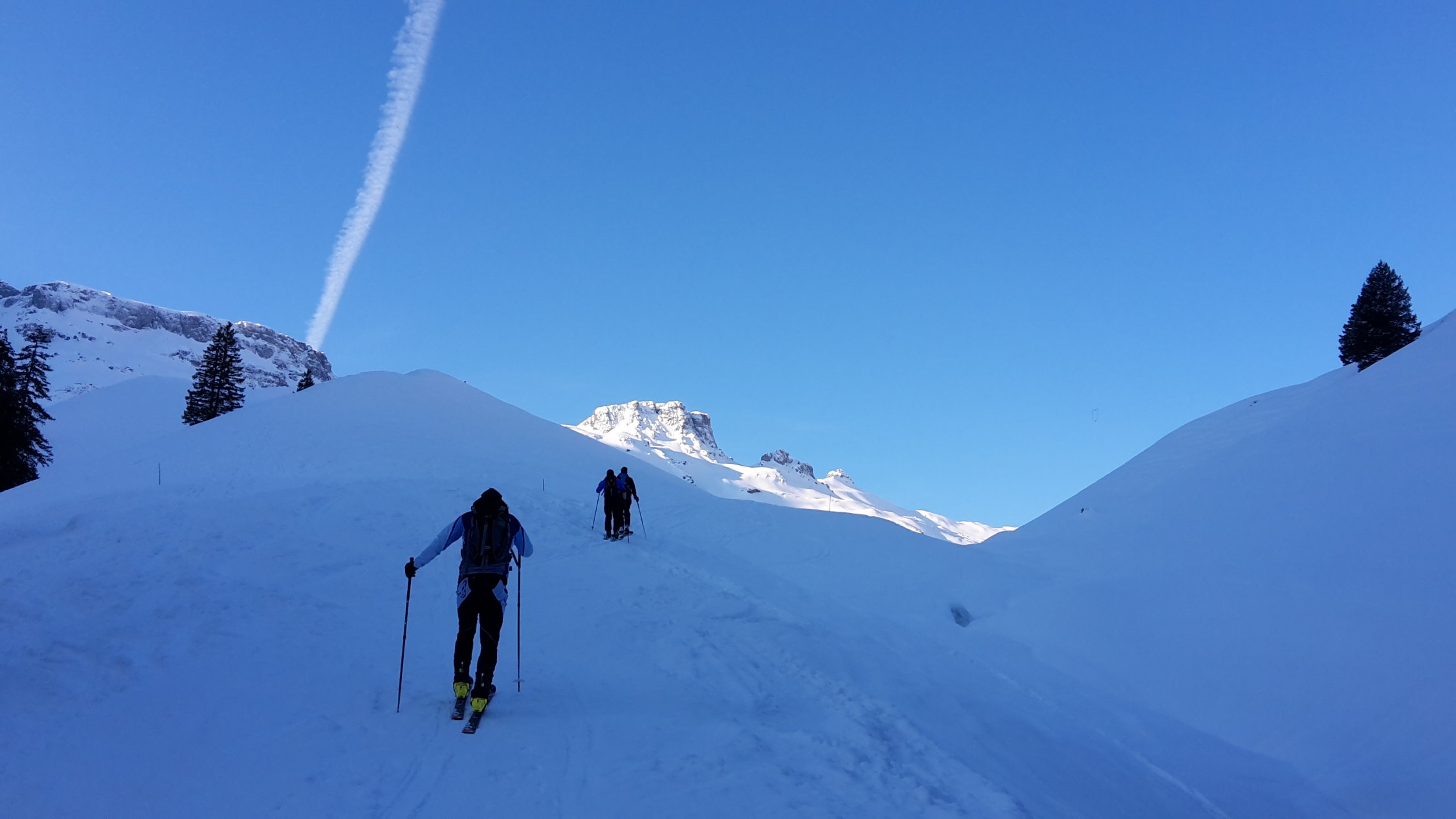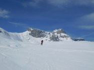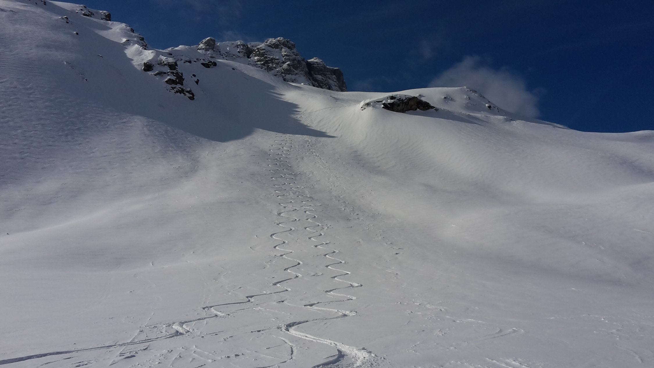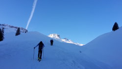 Start der Tour am 8.00 Uhr beim Sahli,bei Wolkenlosem Wetter, es gab letzte Nacht einige cm. Neuschnee, der Aufstieg immer noch Hochwinterstimmung, ab Ober Stafel dann machte sich ein mässiger Föhn bemerkbar, Abfahrt immer noch viel Pulverschnee, aber schon einige male vom Wind verfrachtet aber immer noch gut zum Abfahren, es war bald nur noch Teilssonnig,