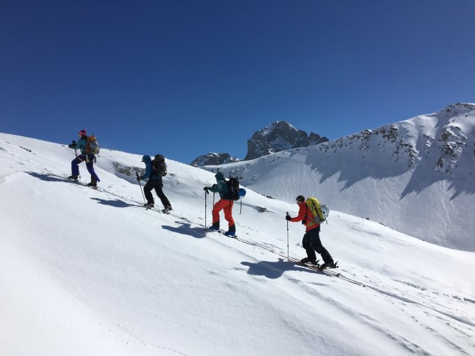 Die Traverse im Gipfelhang und der Aufstieg zum Gipfel ging über hartgepressten Schnee. Die Harscheisen waren hier von grossem Vorteil.