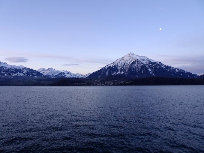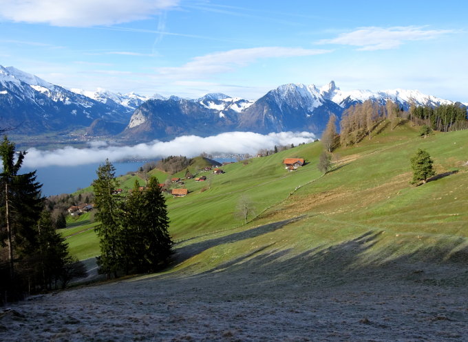 Steigt man vom Thunersee hinauf, hat man den See und die Berge mehr oder weniger im Rücken. Will man sie betrachten, muss man sich umdrehen was auch als Lockerungsübung angeschaut werden kann, so kann man die Monotonie des Steigens ein wenig unterbrechen. Macht man die Tour in umgekehrter Richtung, hat man die ganze Zeit das Panorama vor den Augen.