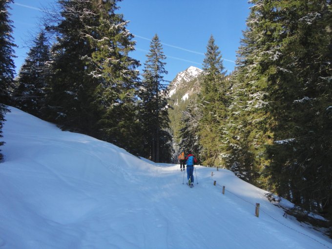Schnee ab Parkplatz. Im Waldgürtel je nach Routenwahl 3-4 kurze Tragestellen (zumindest bei der Abfahrt). Aufstieg heute ohne Harscheisen - unten harschig, aber flach, oben griffig und gut angelegte Spur.