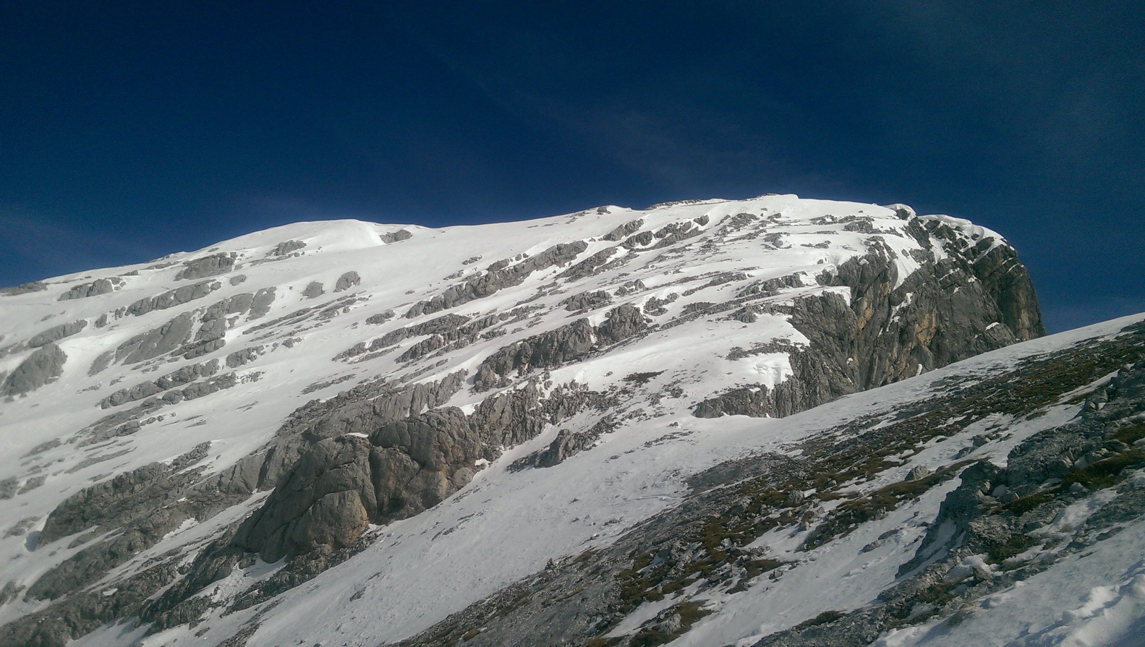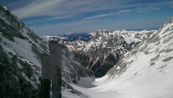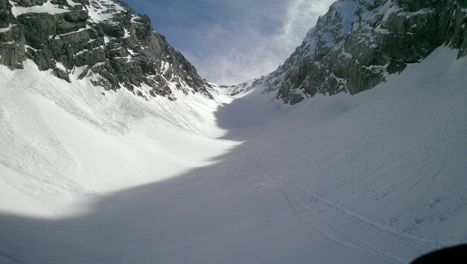 Am heutigen Tag keine Lawinenaktivität beobachtet. Links (im Aufstiegssinn) viele ältere Lawinenkegel. Rechts auf den Felsen befinden sich Wechten, die noch abbrechen könnten.