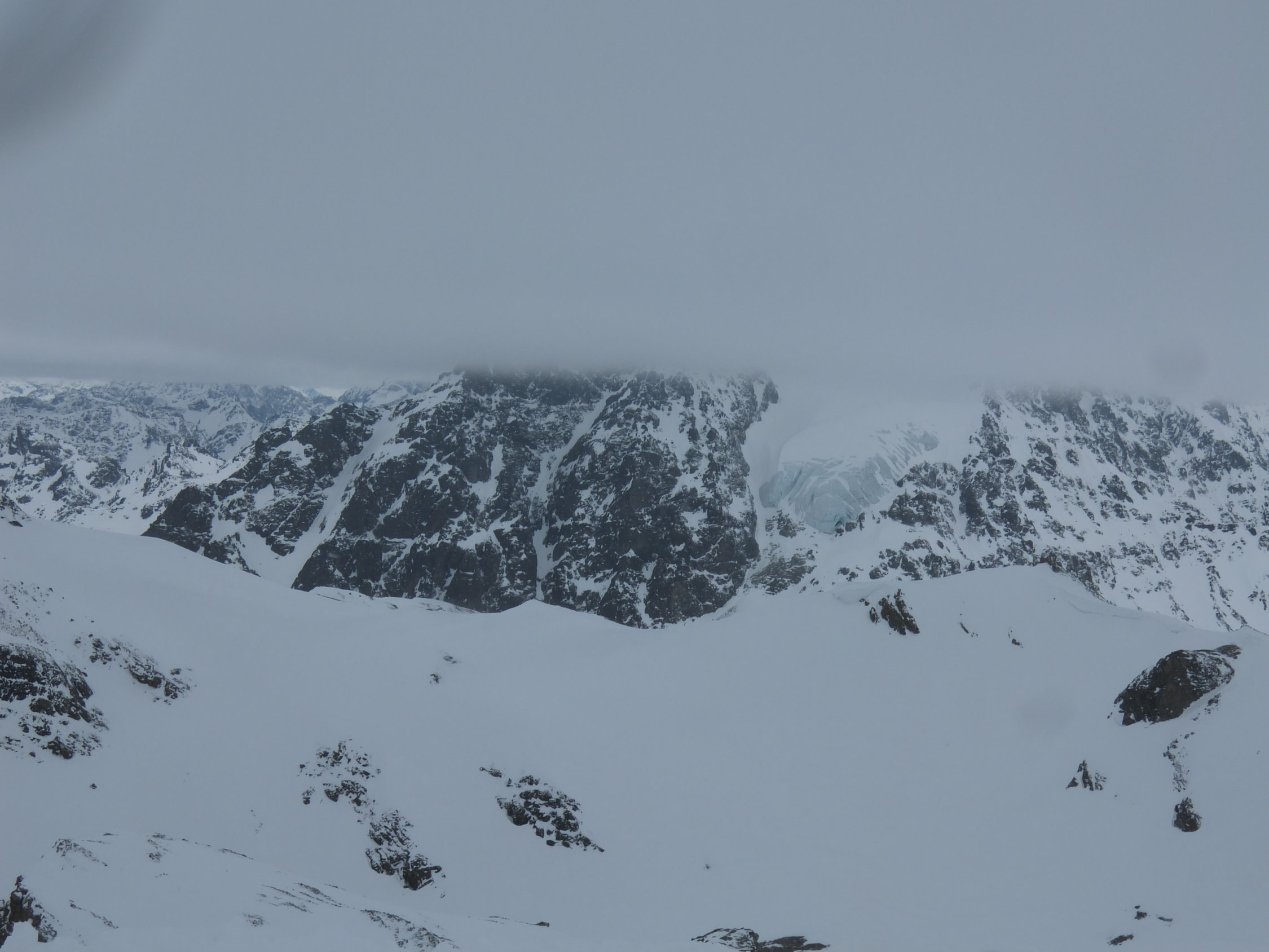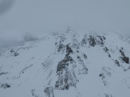 Aufstieg zur Breiten Krone mit verbesserten Sichtverhältnissen. Kräftiger Wind am Gipfel. Der obere Gipfelbereich ist abgeblasen. Abfahrt mit einigen kleinen Gegenanstiegen zur Hütte.