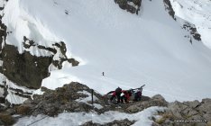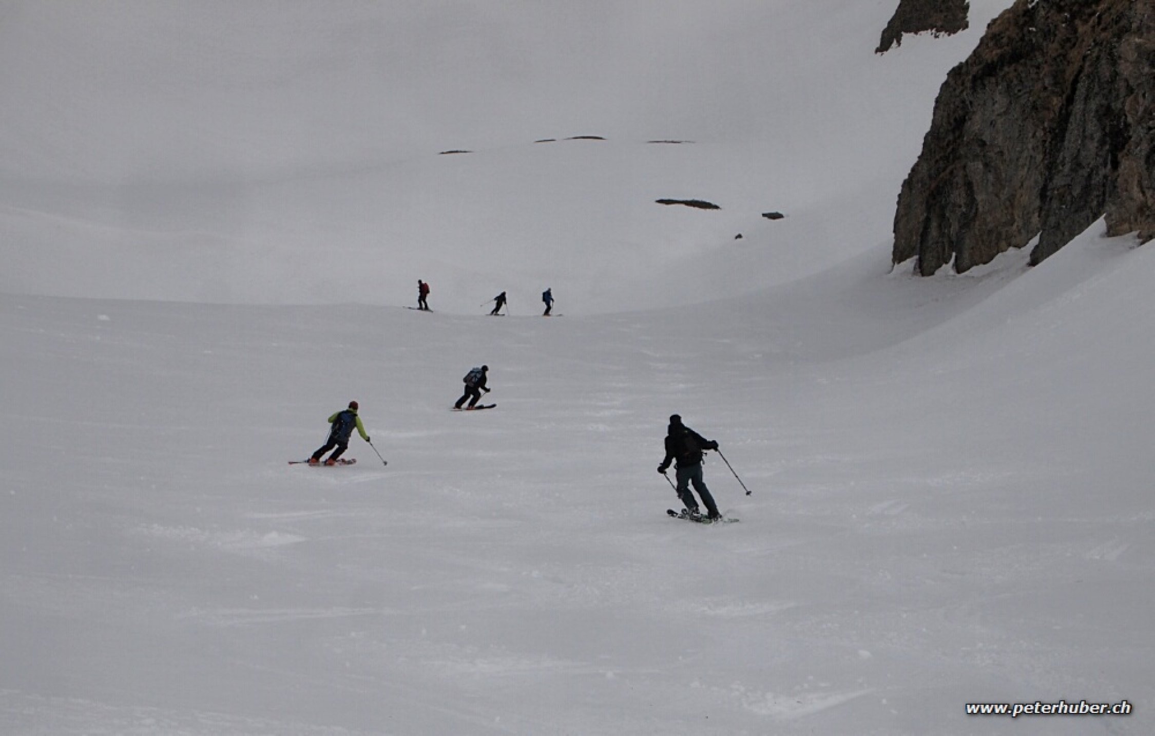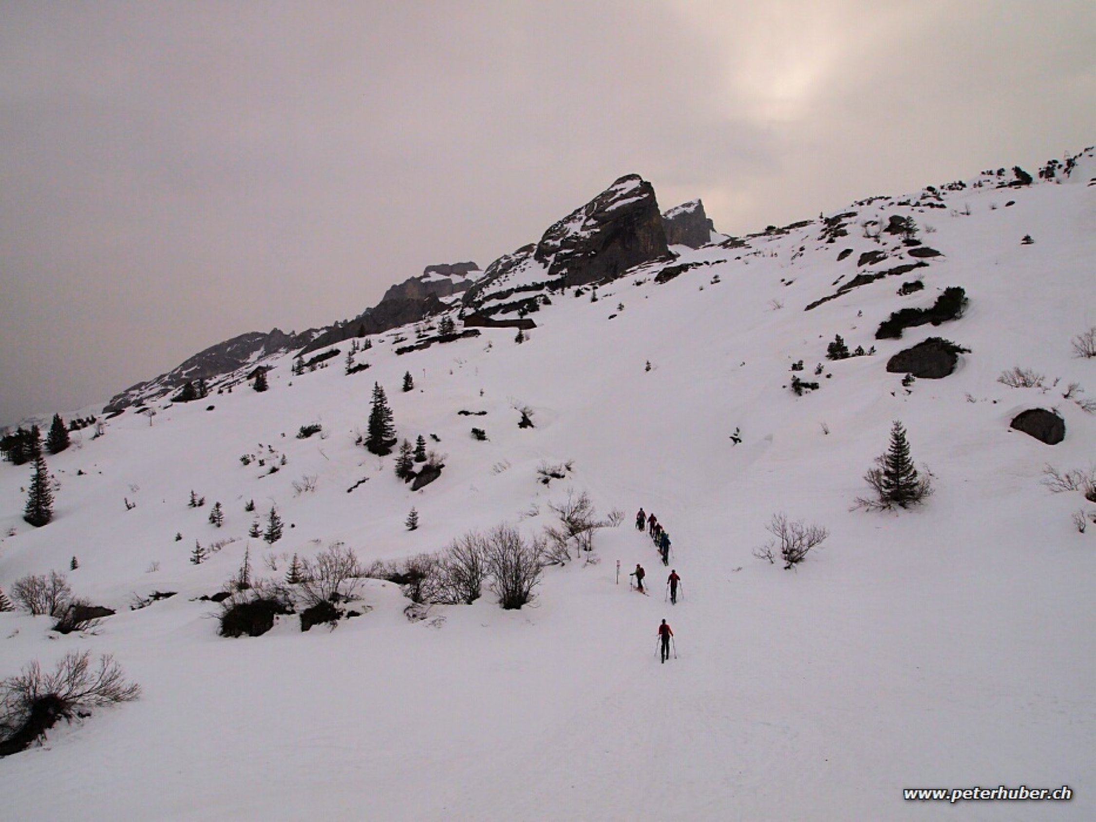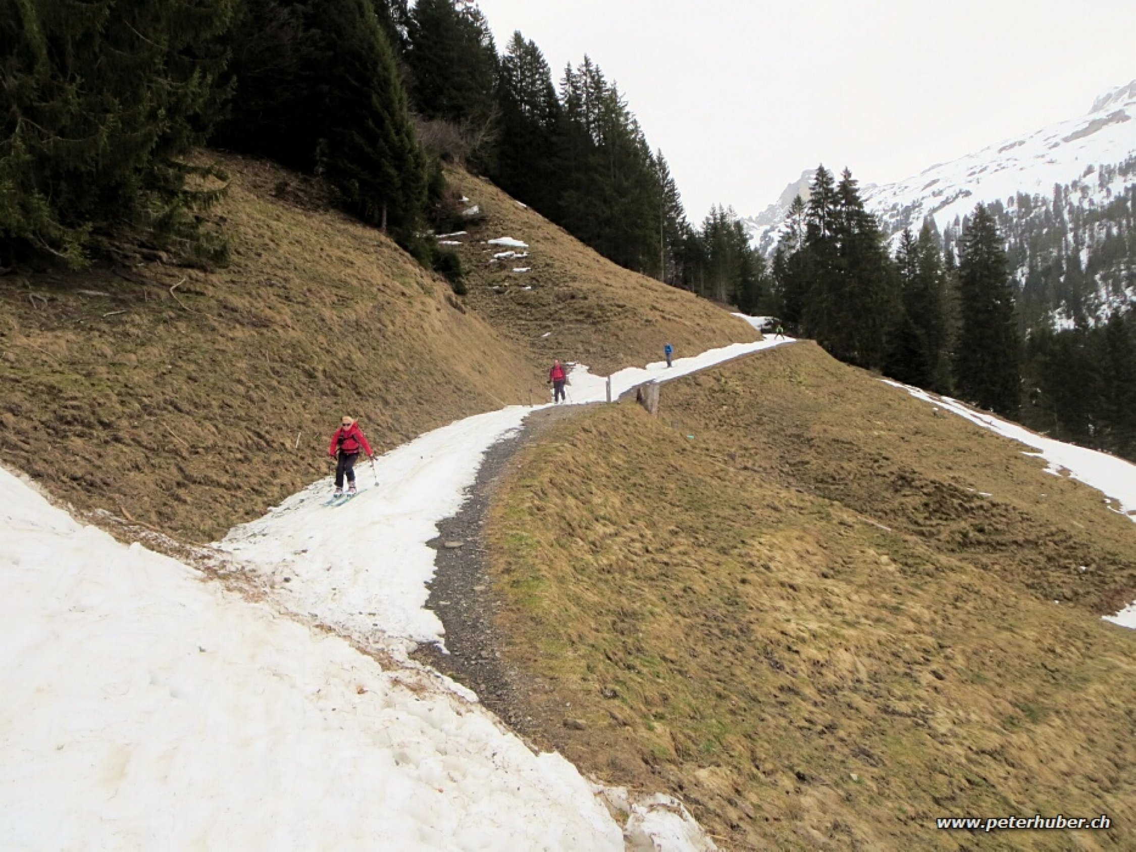 Abfahrt via Vor den Löcheren - oben gut, dann bremsend. In den steilen Hängen rollen Nassschneebälle hinunter. Beim Gegenanstieg kurz Mal Skis tragen. Abfahrt auf der Alpstrasse hat fast durchgehend Schnee bis nach Stafel hinunter.