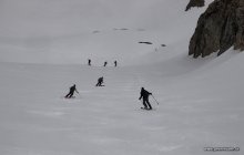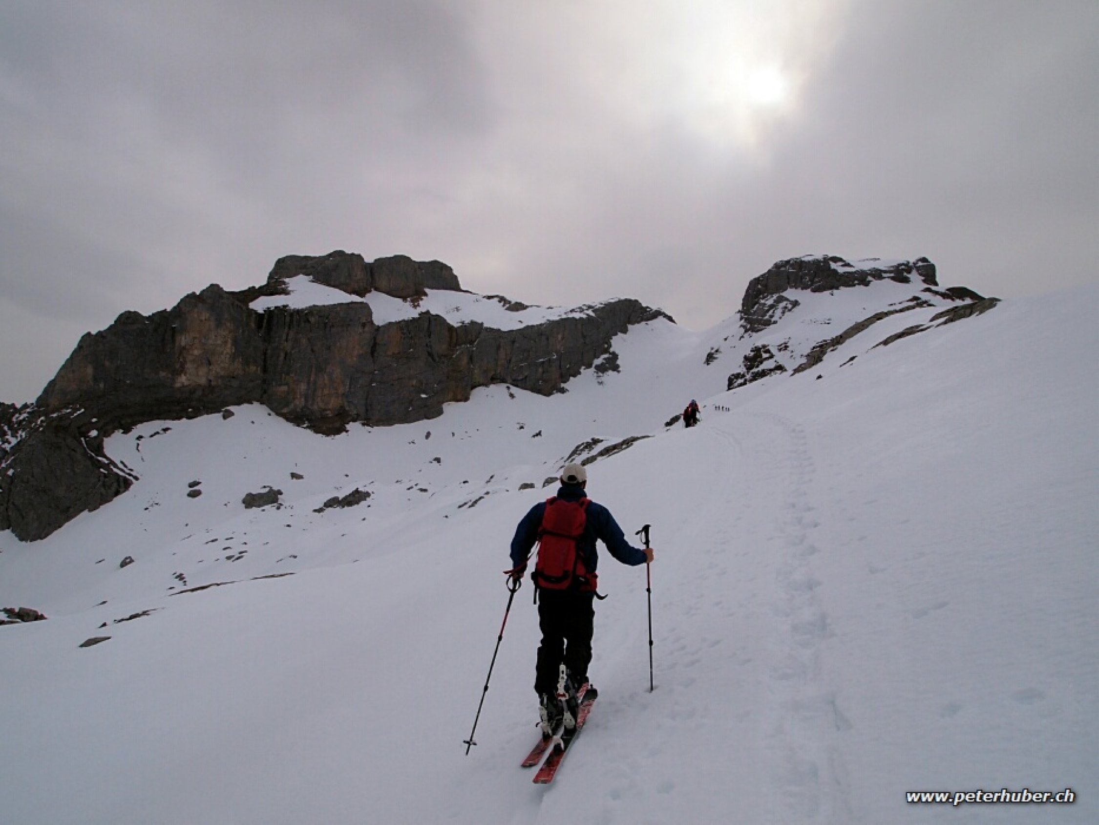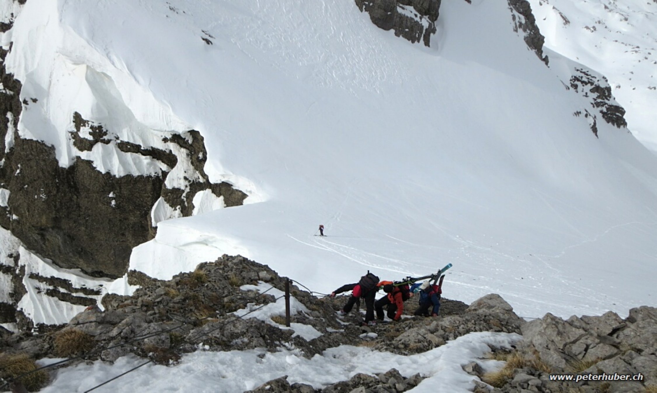 Bedeckt, zeitweise milchige Sonne, Sicht gut. Zwischendurch starker Föhn. Es hat noch recht viel Schnee. Oberflächlich aufgetaut, doch darunter recht gut gesetzt. Im Aufstieg sehr gute Verhältnisse. Die Kabel zum Gipfel sind weitgehend frei. Wenig Trittschnee, gut zu machen.