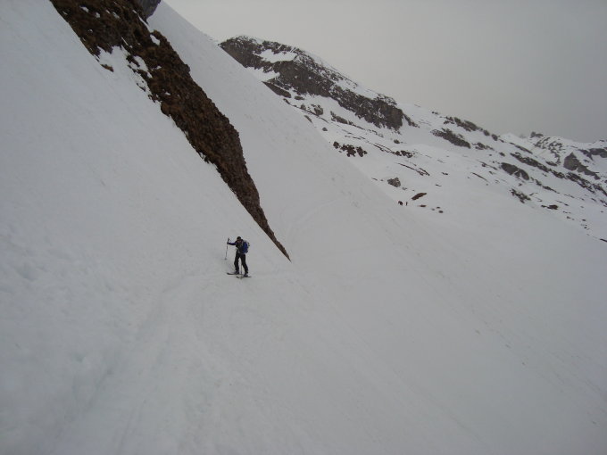 In der Steilstufe dann zunehmend fester werdend und gut tragend, ohne tieferes Einsinken zum Skidepot unter der Rinne.